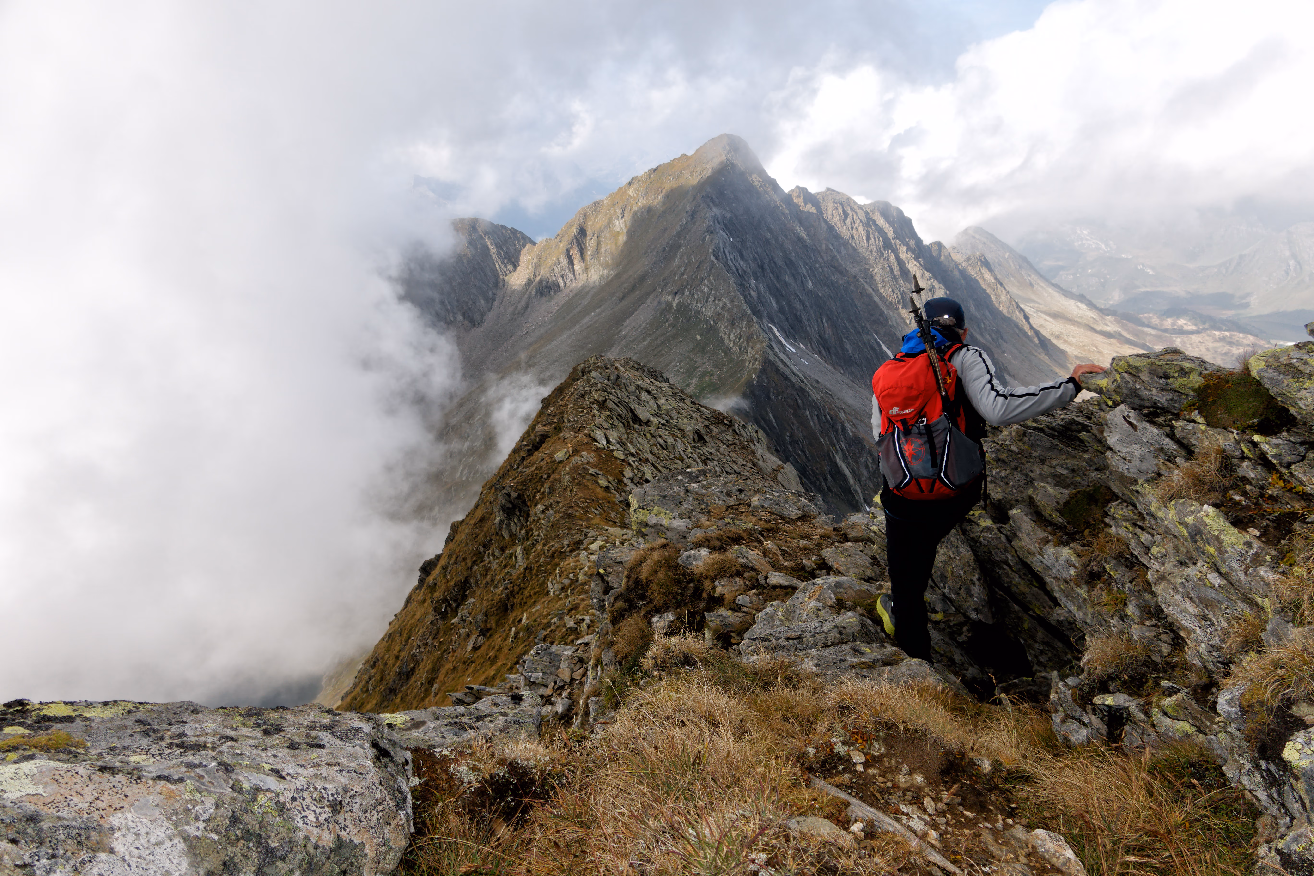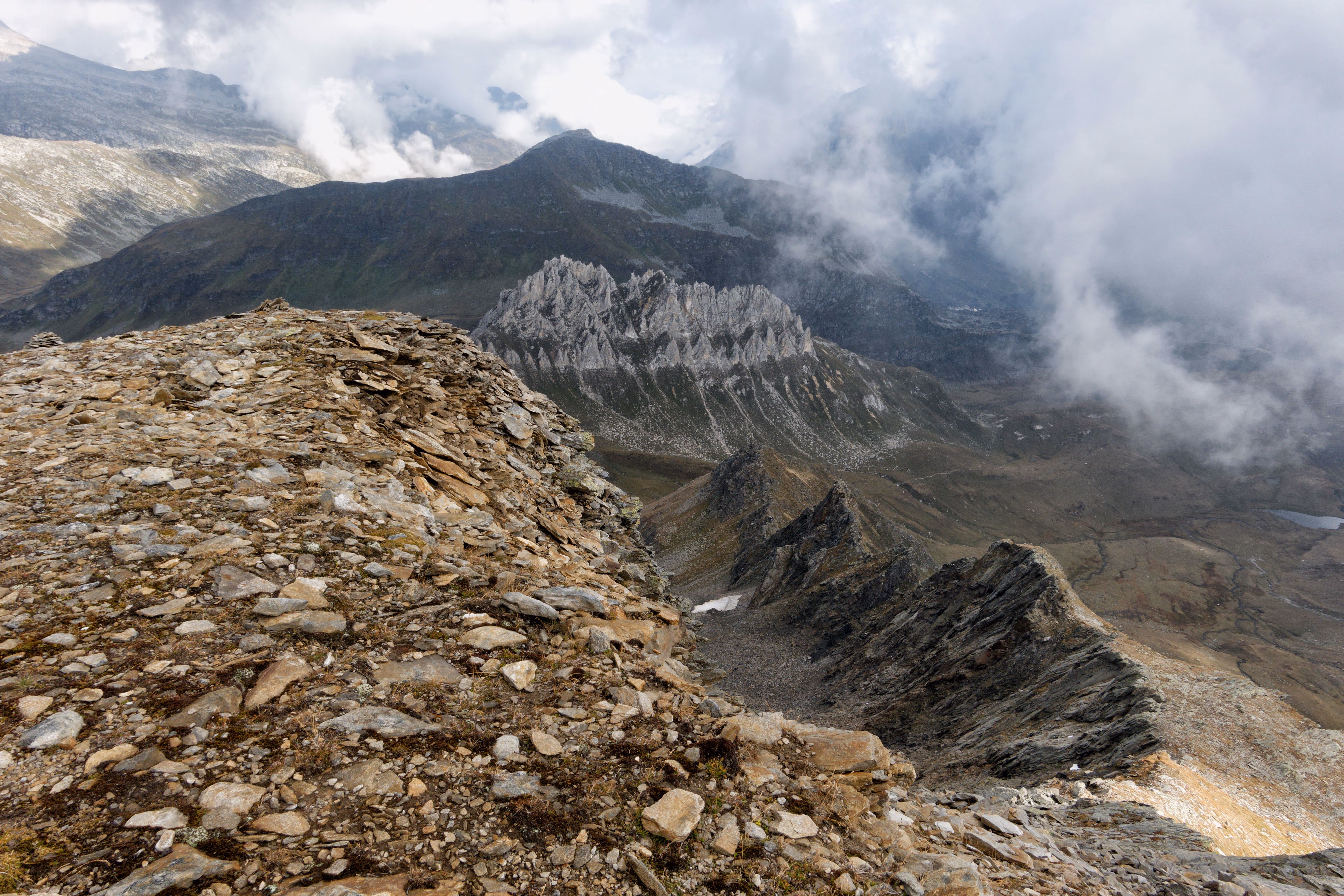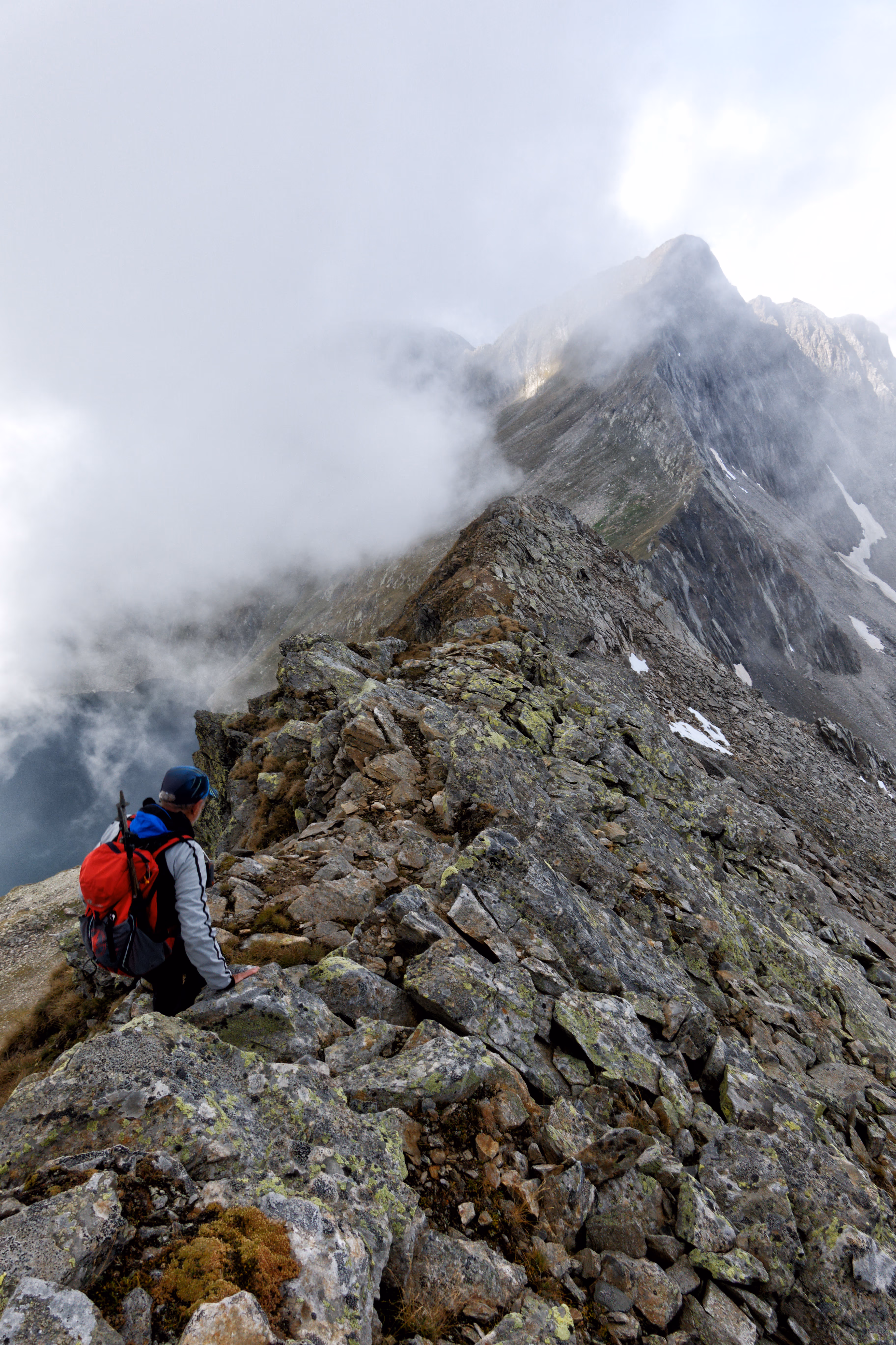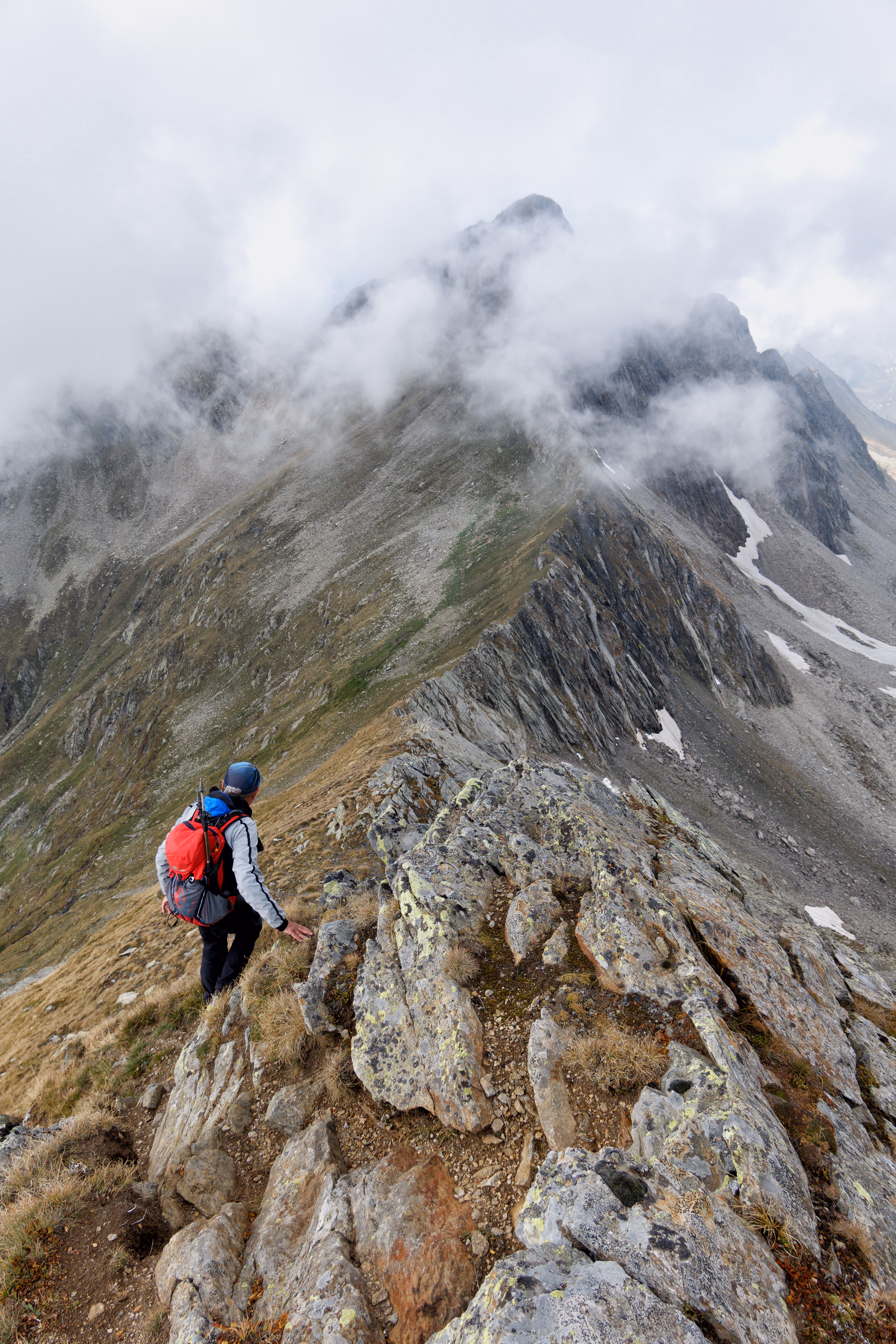 Arrivati al passo ci concediamo una pausa con le mie fidate arachidi salate: leggere ma gustose. Attacchiamo al cresta finale guidati da radi ometti. Purtroppo il tempo si guasta facendoci perdere il panorama sulla Leventina. Stiamo quasi sempre sul filo di cresta, cercando i passaggi più semplici. Dall’anticima (Le Pipe) possiamo vedere l’estetica cresta finale che conduce in vetta. Per blocchi e tracce di sentiero ci portiamo alla base dello strappo finale e quindi in vetta, dove è presente un grosso ometto.