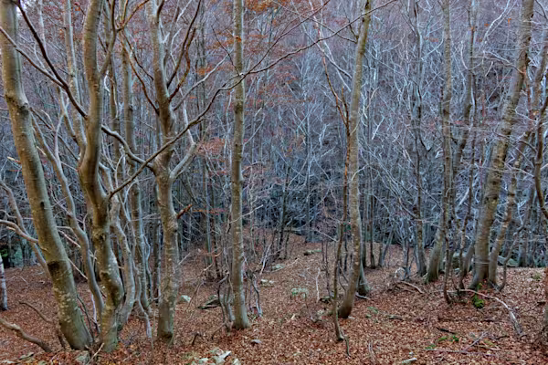 Qualche raro segno rosso e più frequenti ometti ci indicano la via. Superata l’Alpe Monticello e lasciato a sinistra il sentiero che porta alla bocchetta di Vald — percorso già nel Novembre 2014 — arriviamo alla conca de In la Piana a 954m. Notevole l’inversione termica, l’aria è molto più umida e fredda rispetto al pendio. Breve sosta alla sorgente per fare scorta d’acqua e poi via verso la Val Gabbio.
