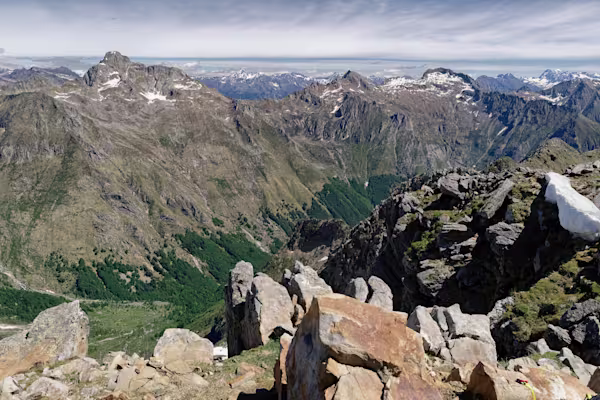 Fatto rifornimento d’acqua ad una fontana, seguiamo le indicazioni per la nostra meta e dopo circa duecento metri lasciamo un tratto cementato per prendere a sinistra, la traccia che sale ripida lungo tutta la dorsale SE del nostro monte. Raggiungiamo così la quota 1950 in una bella conca di ganda ove si trova un grande masso e un ricovero per animali. Breve sosta per uno spuntino e via verso la cima che vediamo appena sopra di noi. La traccia si perde fra l’erba ma con un poco di attenzione la ritroviamo assieme ad alcuni ometti.