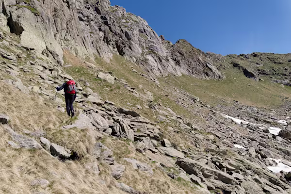 Ci portiamo così all’inizio del canale che inizia subito dopo una bastionata rocciosa. Il canale non è difficile ma la presenza di ghiaia e sassi mobili richiede un minimo di attenzione. Verso la fine un breve passaggio su roccette ci consegna al traverso che, verso sinistra ed in salita, ci conduce alle rocce finali della vetta.