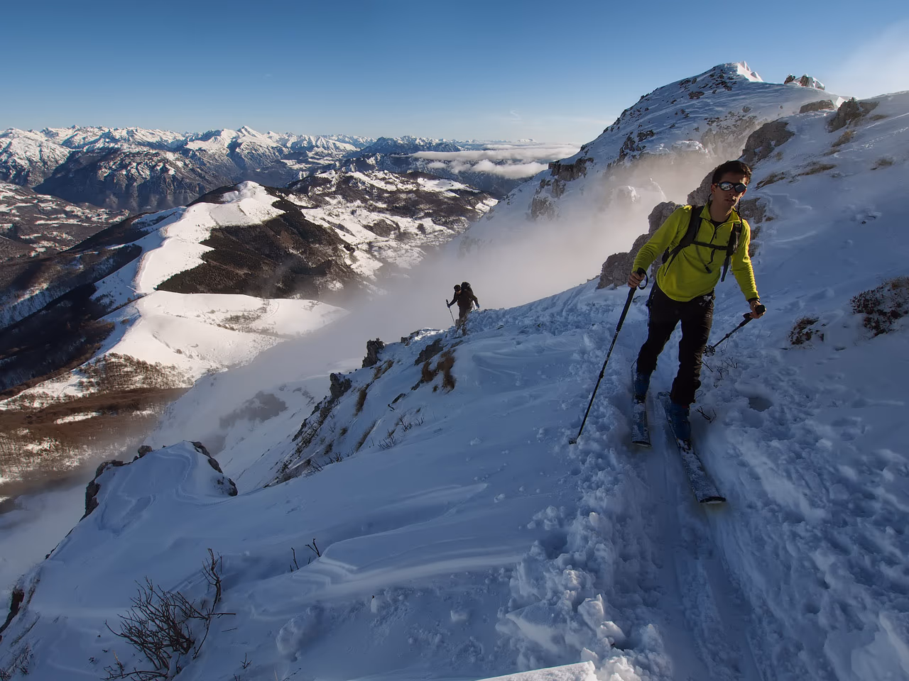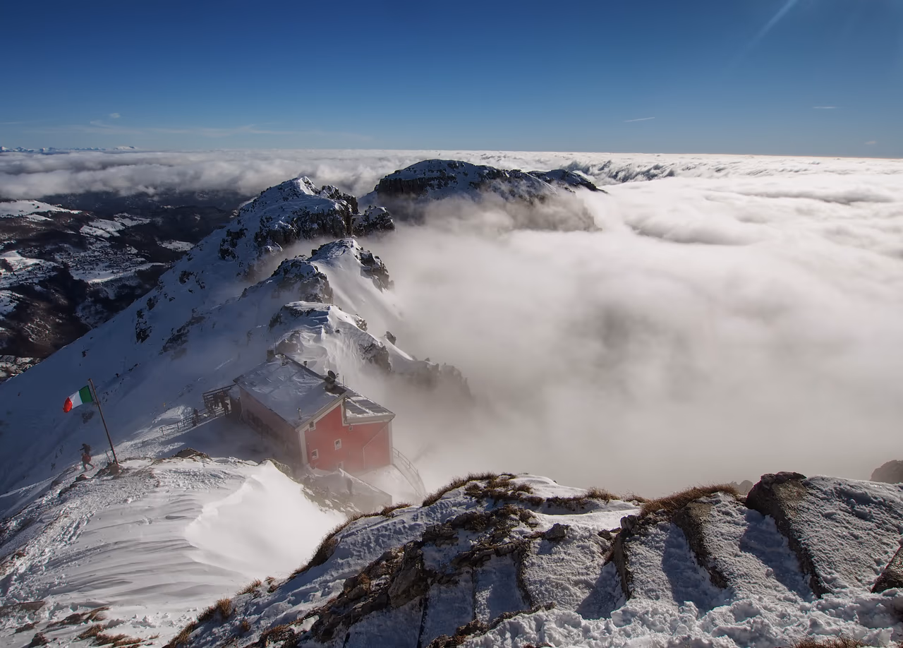 Fuori dal bosco le pendenze aumentano, ma la traccia rimane sempre agevole. In cresta scenario mozzafiato, mare di nuvole verso la pianura che cerca di strabordare sul versante NE. Riusciamo ad arrivare sci ai piedi alRifugio Azzoni proseguendo senza solo fino alla croce di vetta.