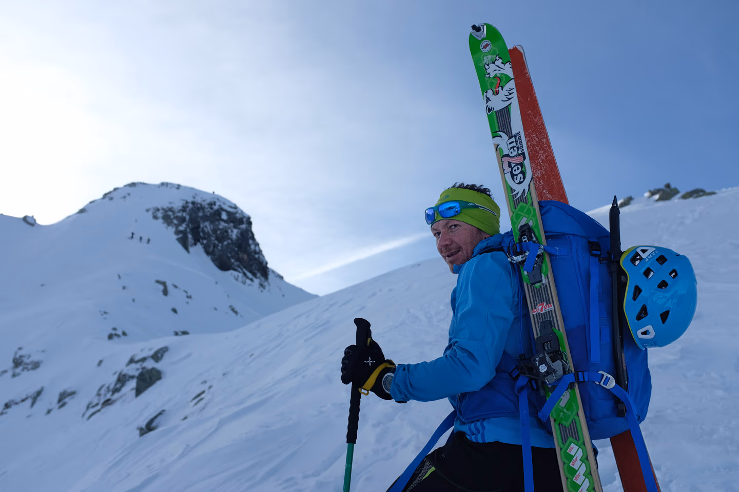 Segue un bellissimo vallone che ci fa rifiatare. L’ultimo tratto piega decisamente a ovest, in direzione della cresta che scende dalla vetta. Neve dura e compatta, lepelli sono al limite. In qualche modo arriviamo alla base dellasella che decidiamo di raggiungere sci in spalla. Il vento ha fatto disastri, l’itinerario non è in grandi condizioni.