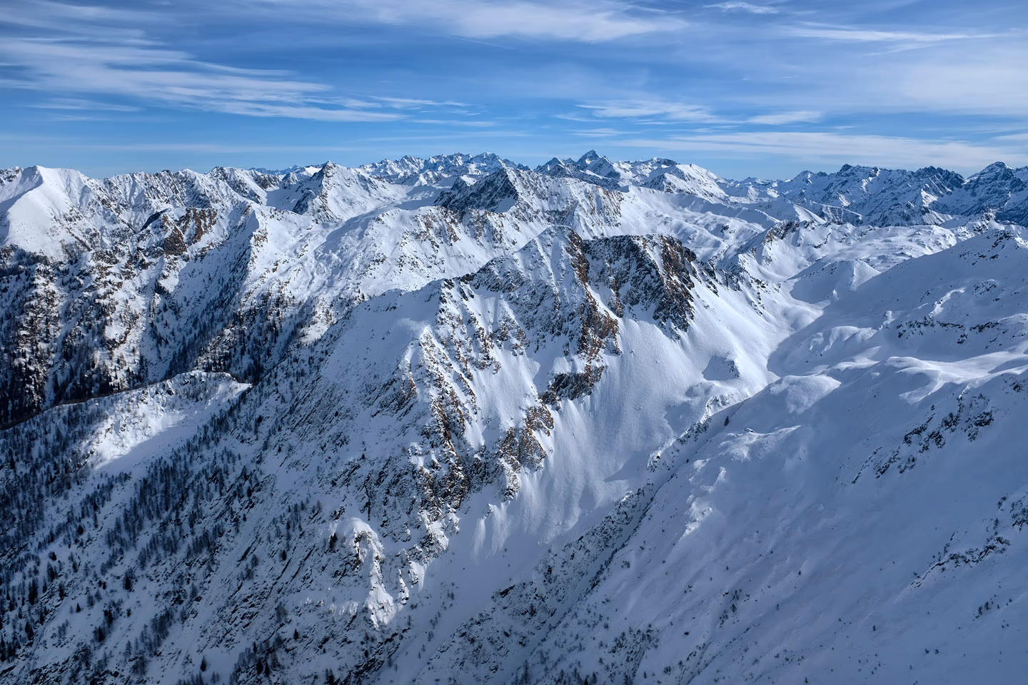 Al Rifugio Alpe Lago, testiamo i nostri ARTVA e siamo pronti per la salita. Le pendenze sono subito sostenute, con numerosi zigzag attraverso un bosco di larici guadagniamo rapidamente quota, superando due baite. Sono ancora convalescente, devo tenere il mio passo, faccio da tappo a Fabrizio che vorrebbe filare via come una scheggia.
