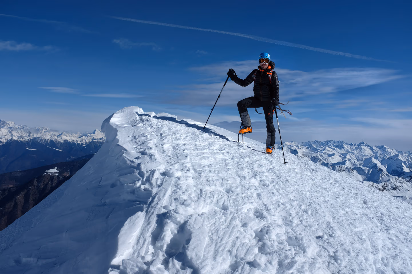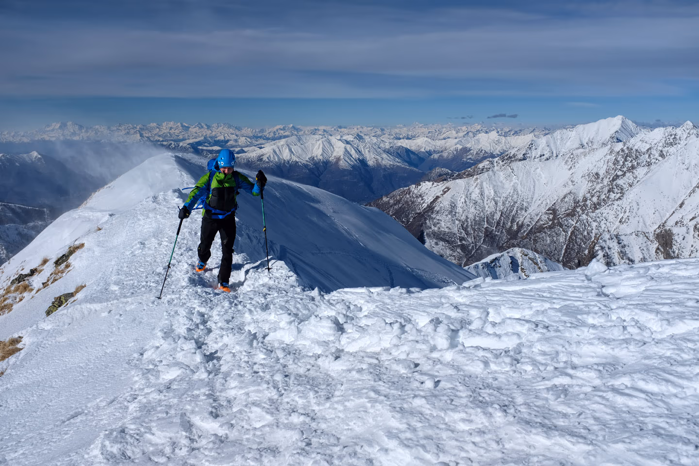 Vedo la vetta, tutti gli altri sciatori hanno scelto di fermarsi direttamente sotto la cima, io decido di risalire verso la cresta e poi proseguire a piedi. Scelta azzeccata, la pendenza è minore e si evitano tribolamenti durante il cambio di assetto.Vento fortissimo e temperature basse, riesco giusto a scattare qualche foto al meravigliosopanorama verso sud e poi giù.