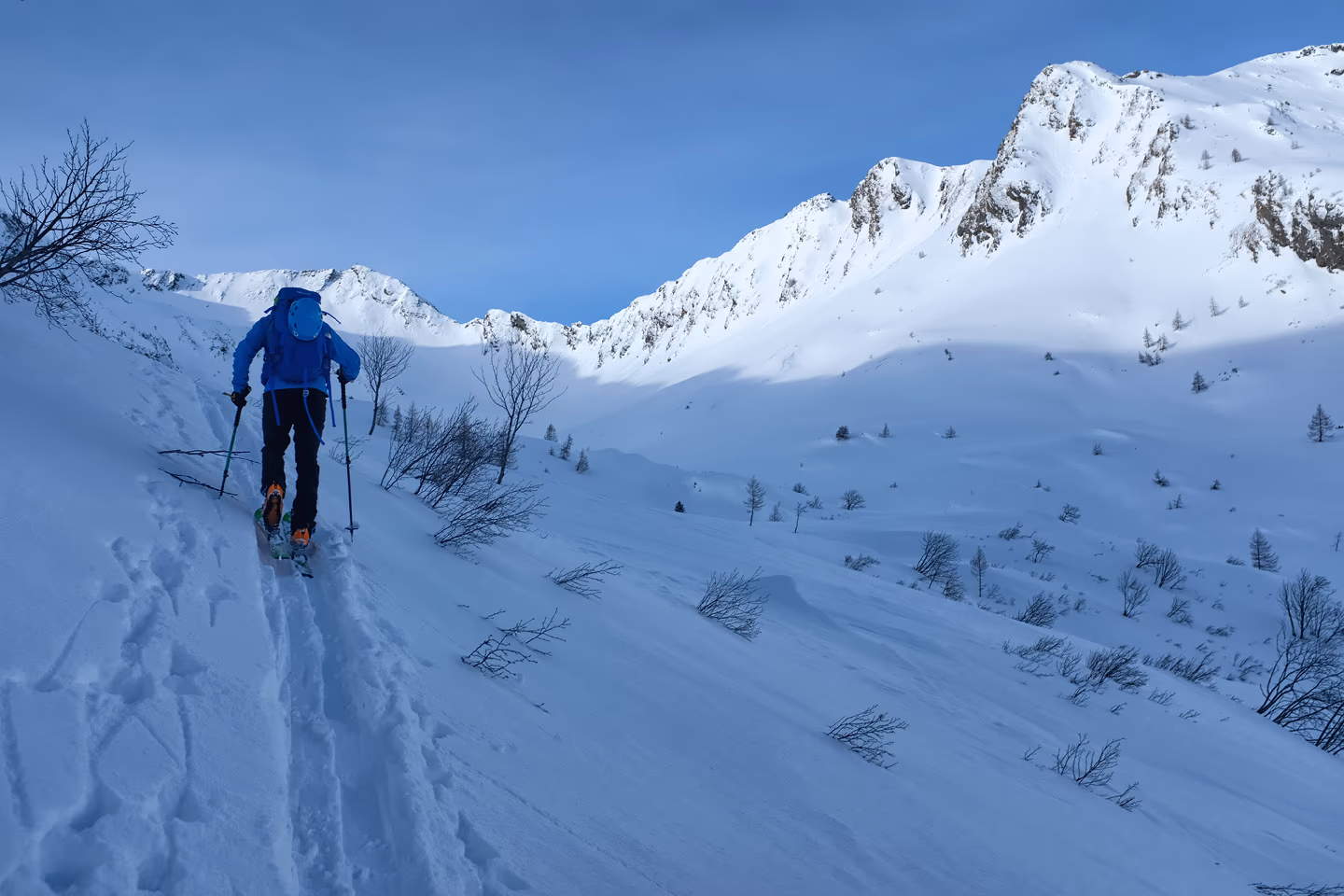 La salita si fa subito dura, per fortuna non siamo i primi a tracciare, ci sono 20/30cm di neve fresca. Affrontiamo untraversino leggermente esposto verso ovest e successivamente un secondo strappo. Pausa viveri, qualche foto e ripartiamo. Unterzo strappo ci porta alla base del pendio sommitale, che aggiriamo verso ovest con un altro traverso. La cima sbuffa, gli sciatori in discesa ci confermano che in vetta si gela! Saggiamente decido di coprimi subito qui, dove si sta ancora bene e la pendenza è modesta.