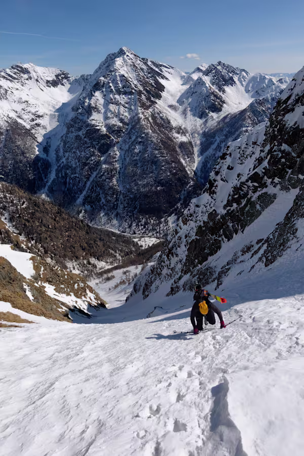 Ma lo spirito di Ale è più forte di ogni imprevisto, e decide di proseguire. Le pelli fradice creano uno zoccolo da antologia. Impensabile raggiungere la vetta in queste condizioni. Cosa si potrebbe fare senza poter usare le pelli? Ovviamente salire a piedi un canale a caso sulla sinistra!