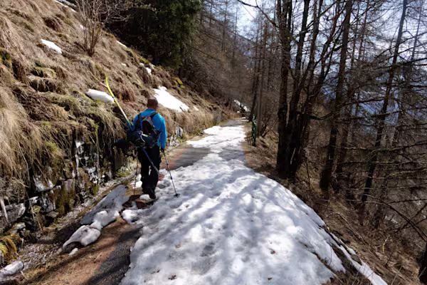Mettiamo le pelli al Rifugio Erler e cominciamo a risalire il bosco tenendo la sinistra orografica. Incrociamo un piccolo torrente da attraversare a piedi. Parte Alessandro, scivola e cade rompendo il boa dello scarpone e bagnando completamente le pelli. Difficile essere più sfortunati di così.