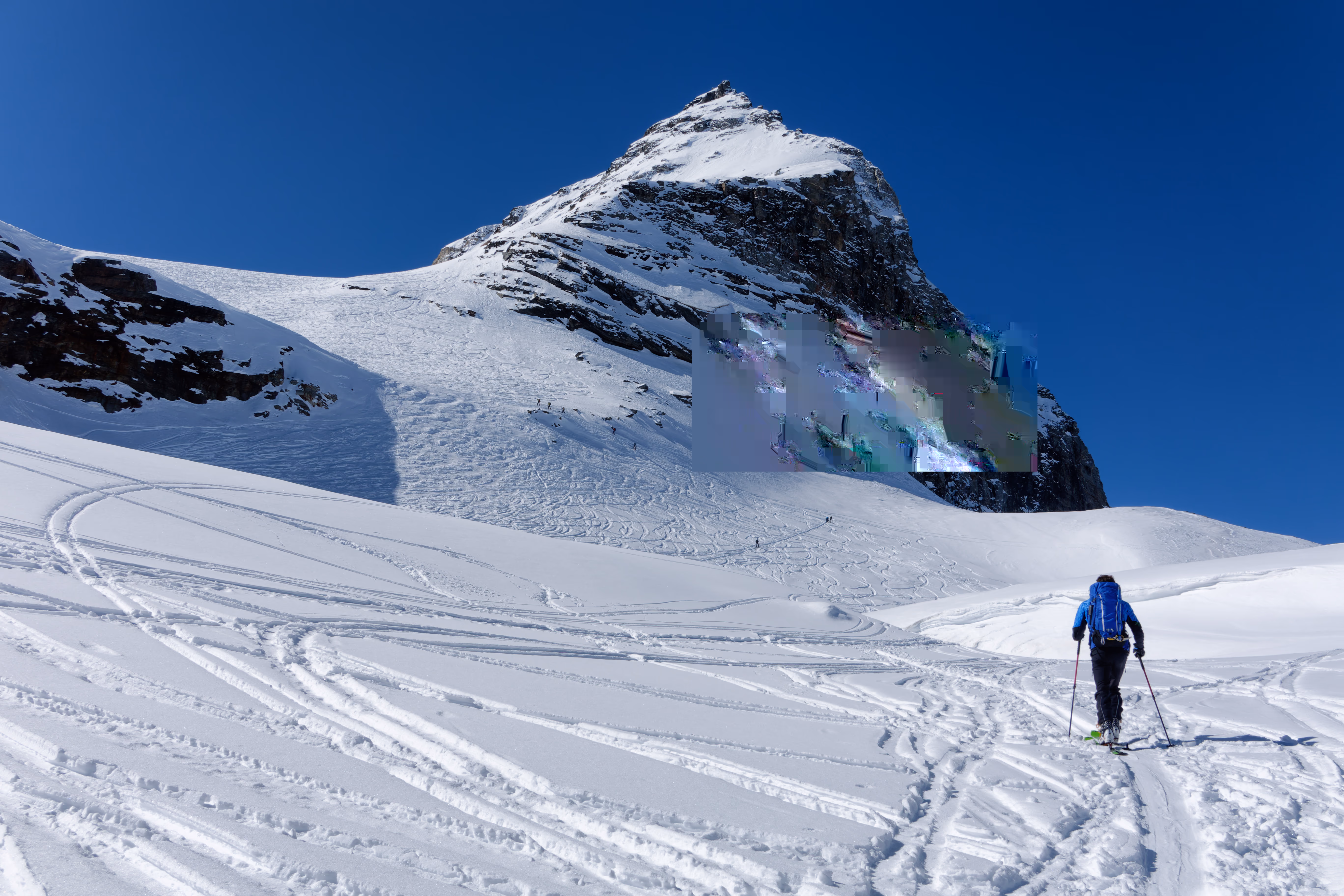 La salita al Cornetto è diversa da quella estiva. Rimane infatti sulla sinistra, verso il Passo di Campagneda. C’è chi se la fa tutta con i rampanti, ma oggi si riesce a salire benissimo anche senza. Da qui il lungo, caldo e assolato tratto lungo il ghiacciaio fino al deposito sci.