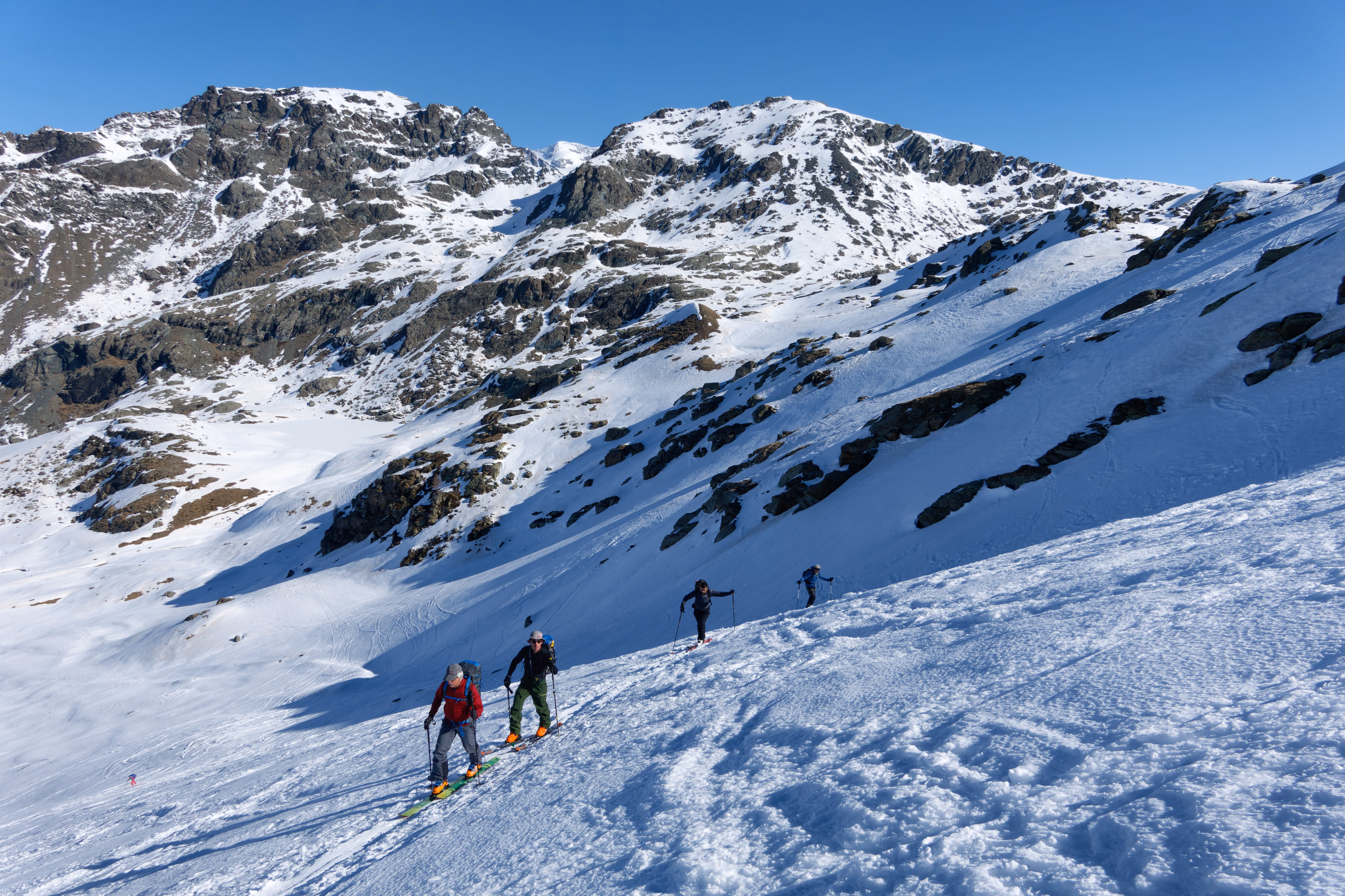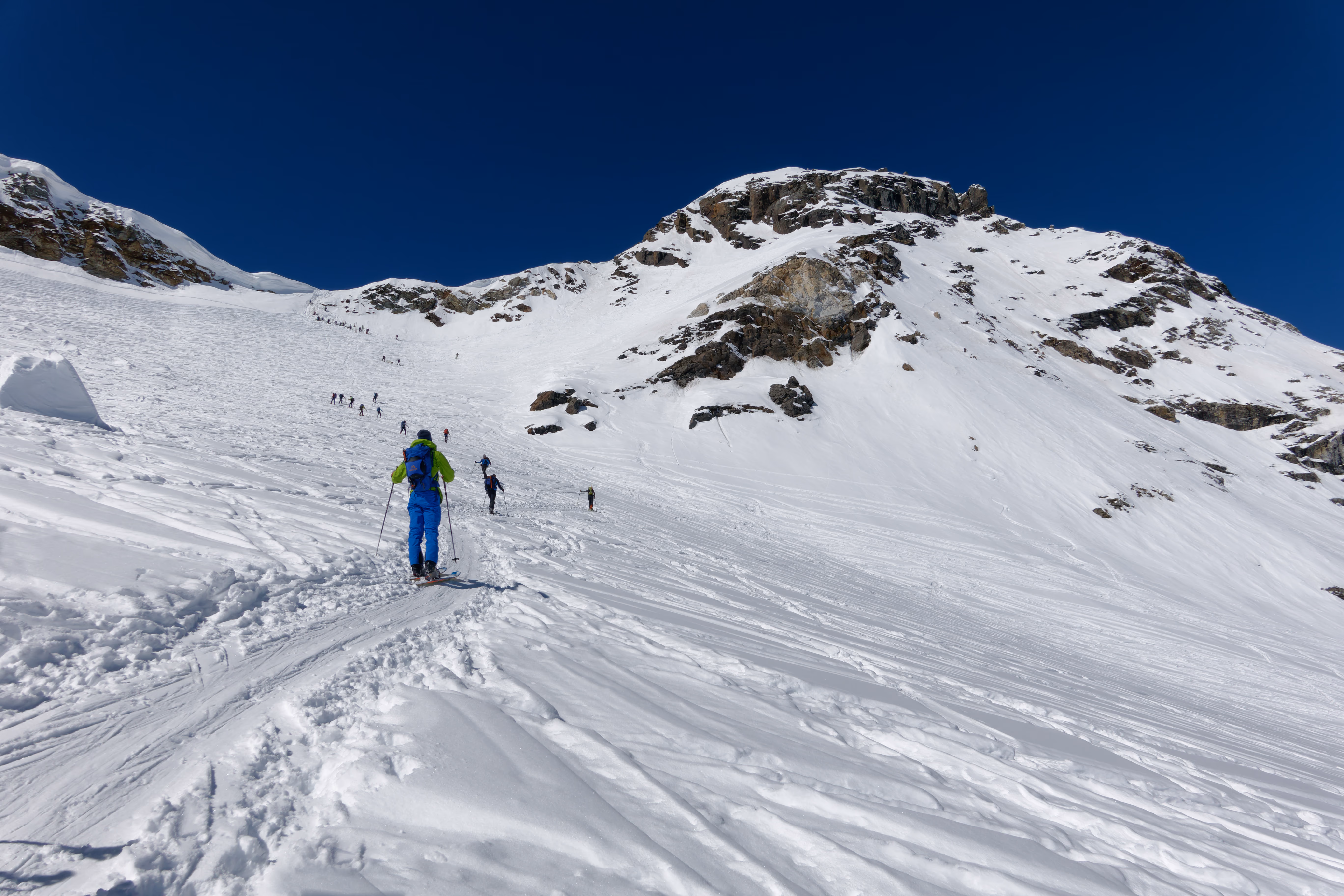 Molte scene di disperazione, con crolli fisici “ post-lockdown” a tratti drammatici. Qualche sci disperso partito stile “razzo” dal deposito fa da contorno a un bel campionario di scialpinisti più o meno improvvisati. Non manca anche una doppia picca per risalire al colle.Spallo gli sci fino alla base del traverso sotto la vetta. Si riesce a scendere — ancora per poco — con gli sci da qui, meglio approfittarne.