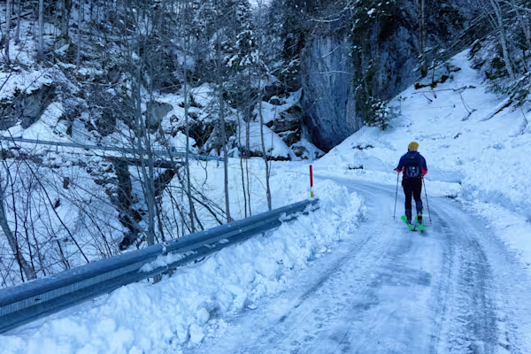 Partiamo dal piccolo paesino di Muotathal nel Cantone di Svitto. Al suolo circa mezzo metro compatto, con 5/6cm di neve fresca. Sembra di essere in un altro pianeta. Dopo il distributore di benzina, sulla destra, parte una stradina che può essere percorsa fino dove l’innevamento lo consente. Noi abbiamo fatto due tornanti poi il ghiaccio impediva di proseguire.