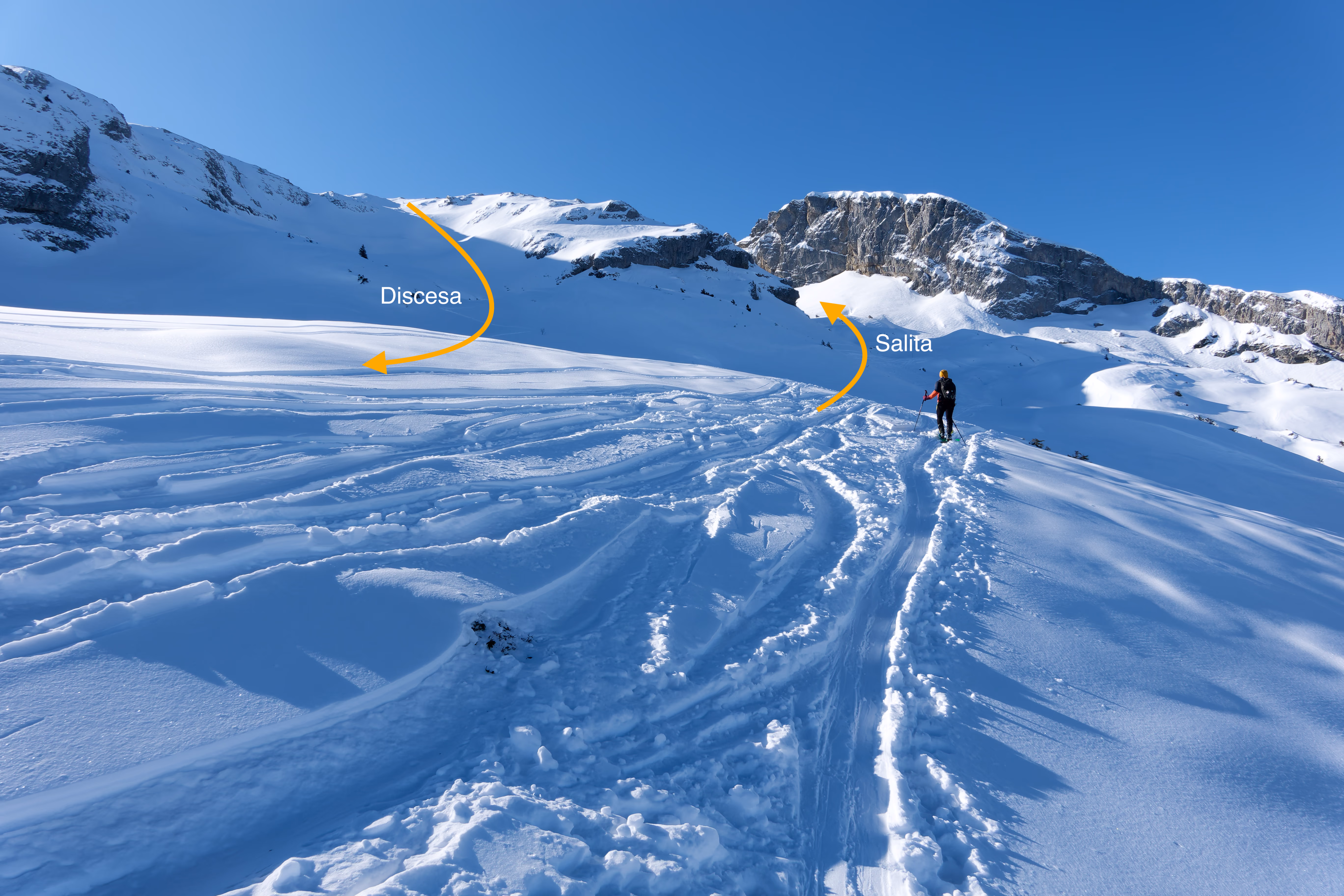 L’Ambiente è meraviglioso. Ampi valloni, pareti scoscese, laghi e spazi infiniti verso nord. Alla fine lo scialpinismo è anche questo: scoprire nuovi spazi delle Alpi in inverno. Oggi Alessandro è una macchina, devo rallentare per non fondere il motore. Il pendio finale è molto ripido (30/35°) e va valutato con attenzione se si è i primi a passare.