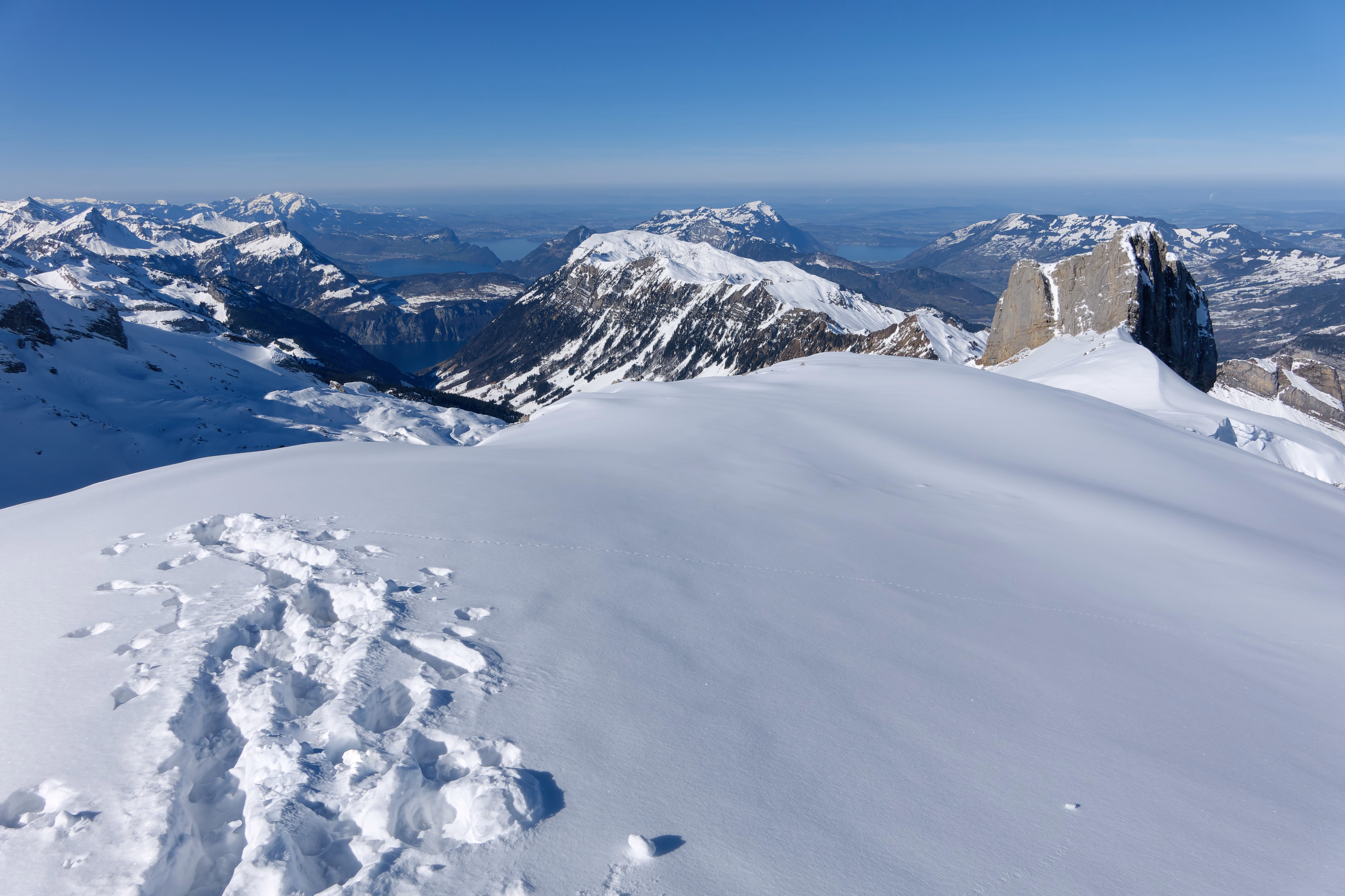 Siamo saliti in 3h e 15m, pazzesco. C’è da dire che il percorso rende bene e sale veloce, ma oggi Ale era incontenibile. Il panorama dalla vetta è clamoroso. A sud le Alpi Glaronesi con il Clariden, verso ovest le pareti del Chronenstock, verso nord il Lago dei Quattro Cantoni e le Alpi che finiscono lasciando spazio alle colline. In cima incontriamo molte persone salite dalla Lidernenhütte grazie all’aiuto di alcune corde fisse nel tratto finale. Preparatevi a non essere da soli in vetta, ma siate fieri di essere saliti dal fondovalle con le vostre forze.
