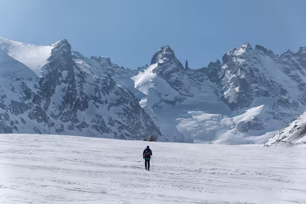 Dal Maloja seguiamo la pista battuta che porta al Lago Cavloc e al Plan Canin. Qui termina la traccia battuta e si imbocca sulla destra la Valle del Forno. Molto lentamente iniziamo a risalire la valle fino al fronte del ghiacciaio. Qui si ha un’idea più precisa della lunghezza dell’itinerario, impressionante.