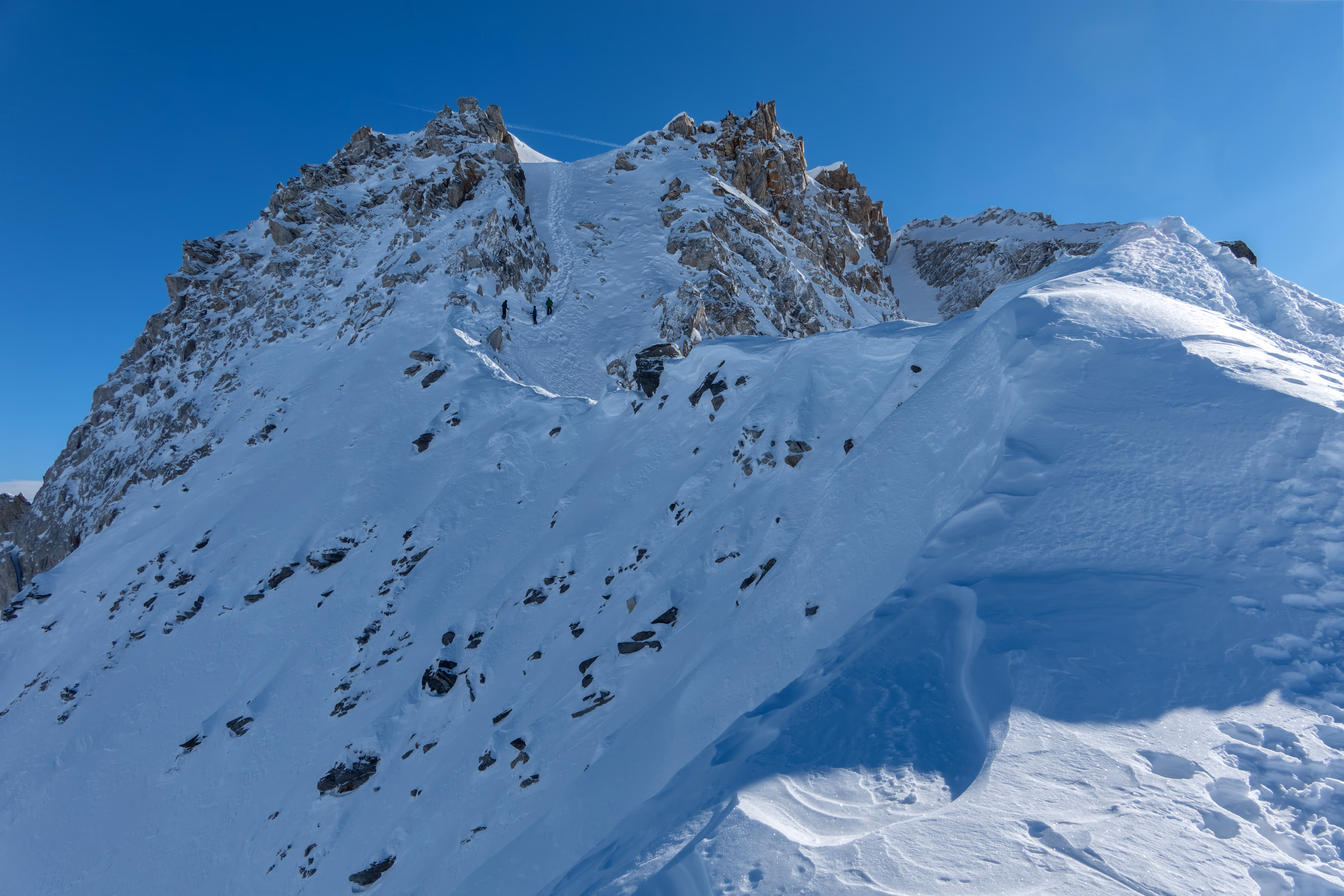 Con ramponi e picca ci incamminiamo verso la vetta. Il canalino finale nella prima parte è bello ripido ma ben pedonato. In ogni caso direi che per la vetta i ramponi sono necessari. Super panorama dalla vetta, con il Basodino verso sud e il Finsteraarhorn a NW. Qualcuno scende anche in direzione opposta direttamente dalla vetta, andrò a vedere l’itinerario. Torniamo a ritroso al deposito sci e iniziamo la discesa