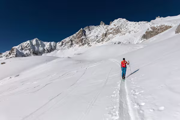 Per fortuna troviamo una traccia recente, eseguita in maniera perfetta. Ci consente di salire con il giusto ritmo senza esagerare, visto che abbiamo ai piedi gli sci pesanti. A circa 2700m inizia il tratto più delicato della salita: un ripido e ampio pendio tra due pareti rocciose. Ci portiamo prima sulla destra — salendo — e poi con tre lunghe diagonali arriviamo alla base della cresta, dove dovrebbe esserci quel che rimane del Ghiacciaio di Pesciora.