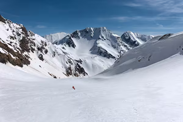 Sistemati i bagagli non perdiamo tempo e partiamo sci ai piedi con meta da definire. Puntiamo il colle sulla destra. Una volta raggiunto si apre davanti a noi una bellissima valle tutta da sciare. Neve bella compatta in alto che si trasforma in neve primaverile in basso. Ripelliamo al colle che da accesso alla cresta del Laita. Io e Alessandro arriviamo in cima — solo un ultimo tratto a piedi ma senza ramponi — per poi scendere il lungo canale nord. Non male come prima discesa! Rimettiamo le pelli per tornare al colle e quindi al rifugio, dove ci concediamo un meritato spritz. Una buona OSA per iniziare.