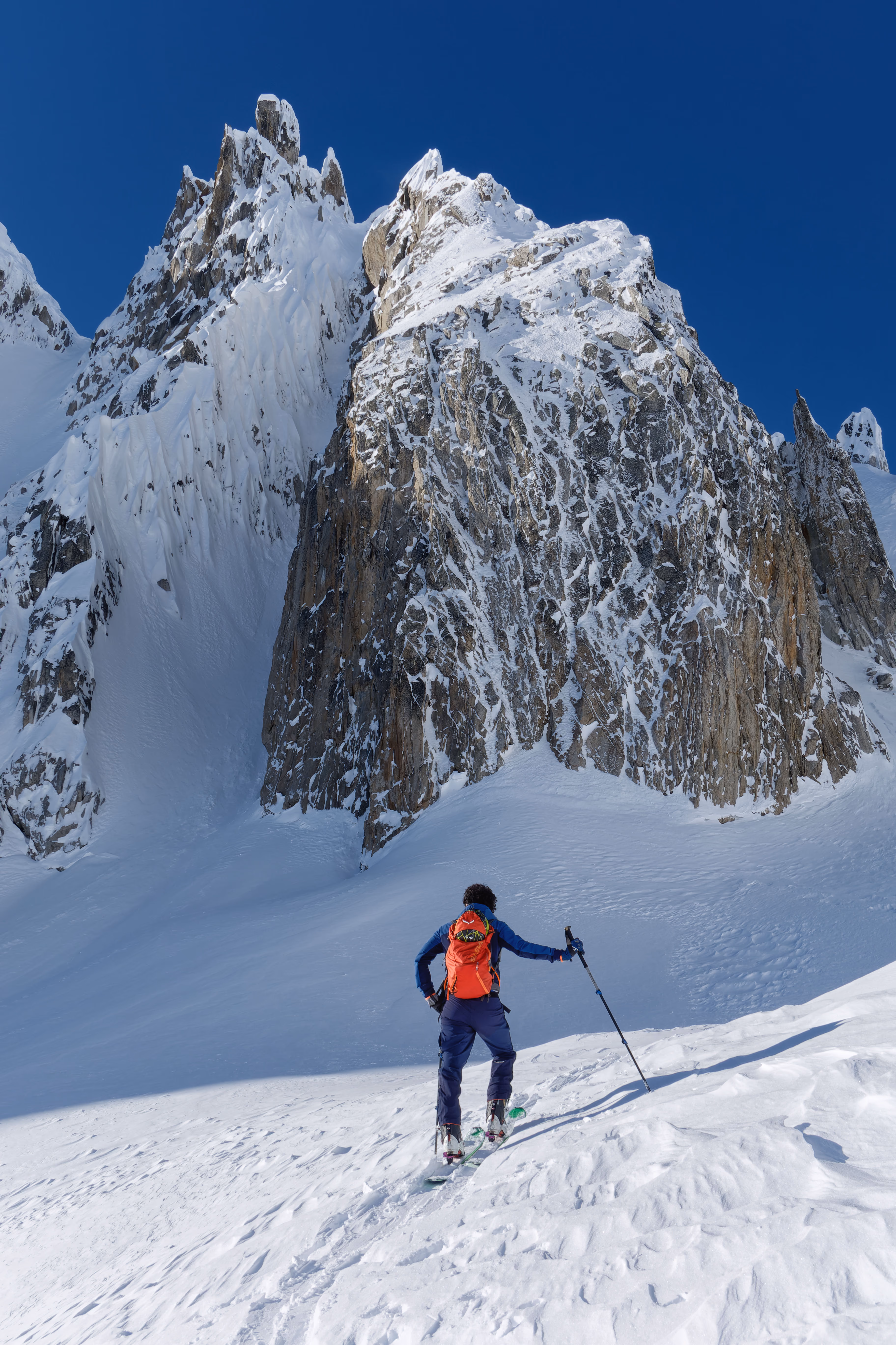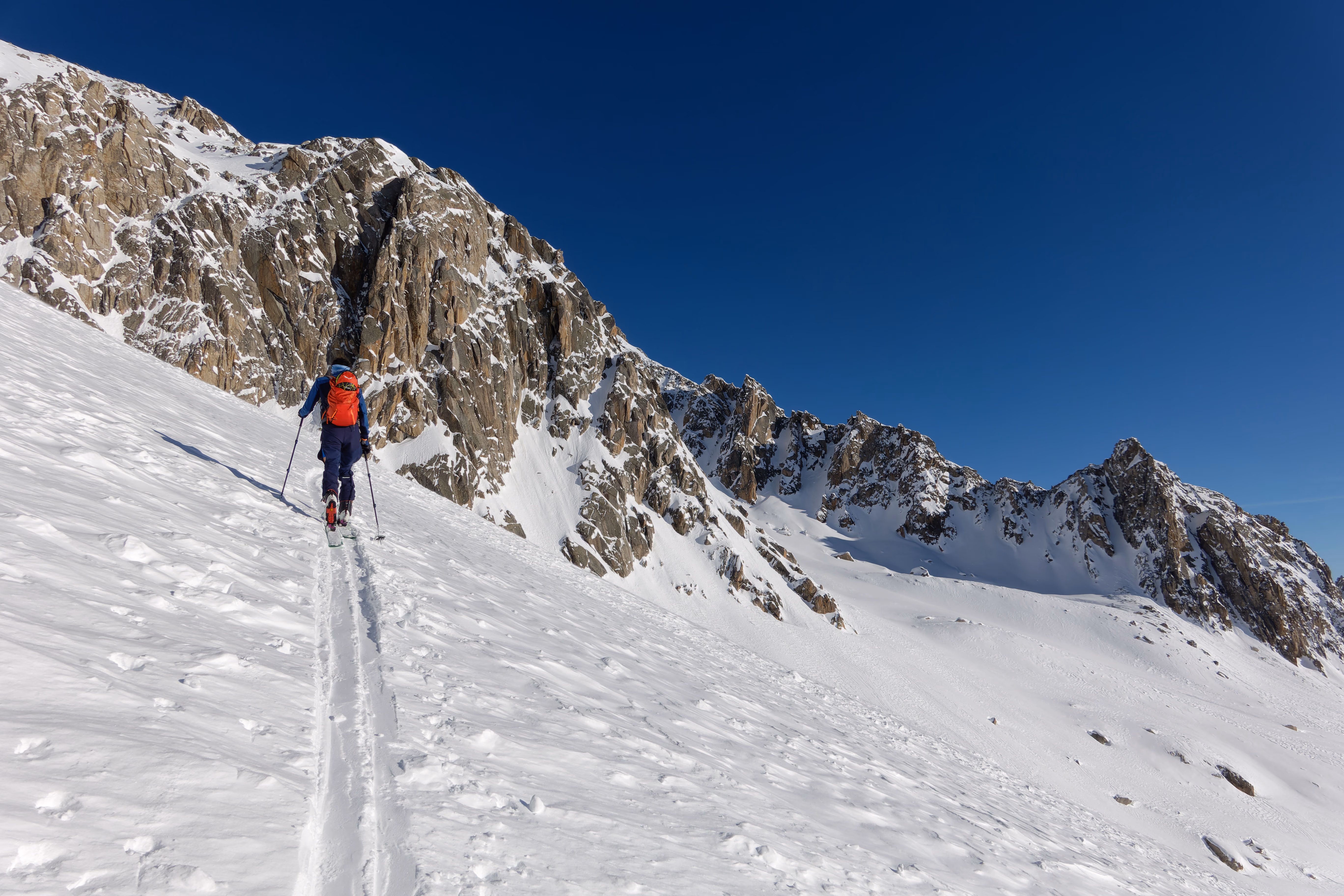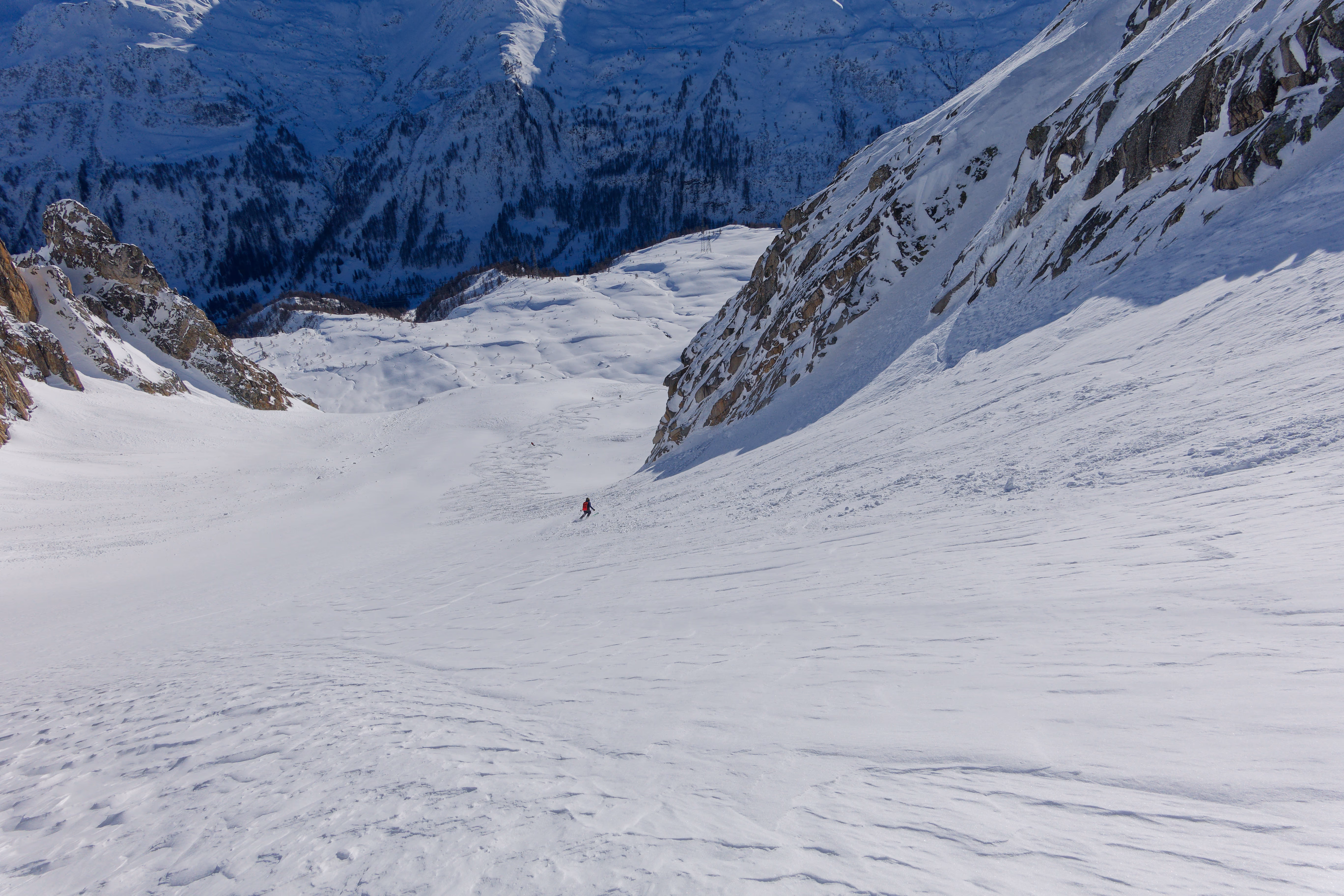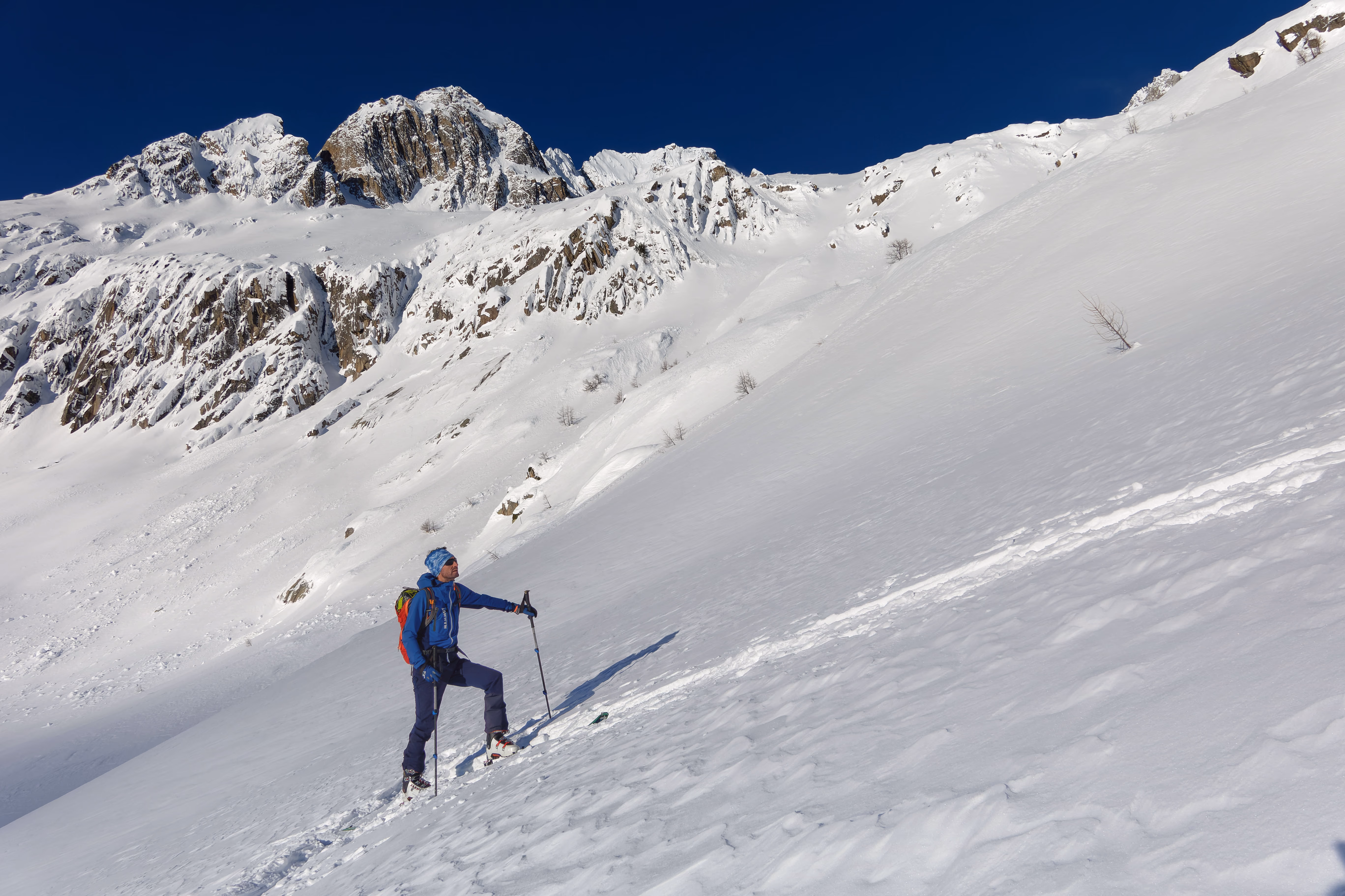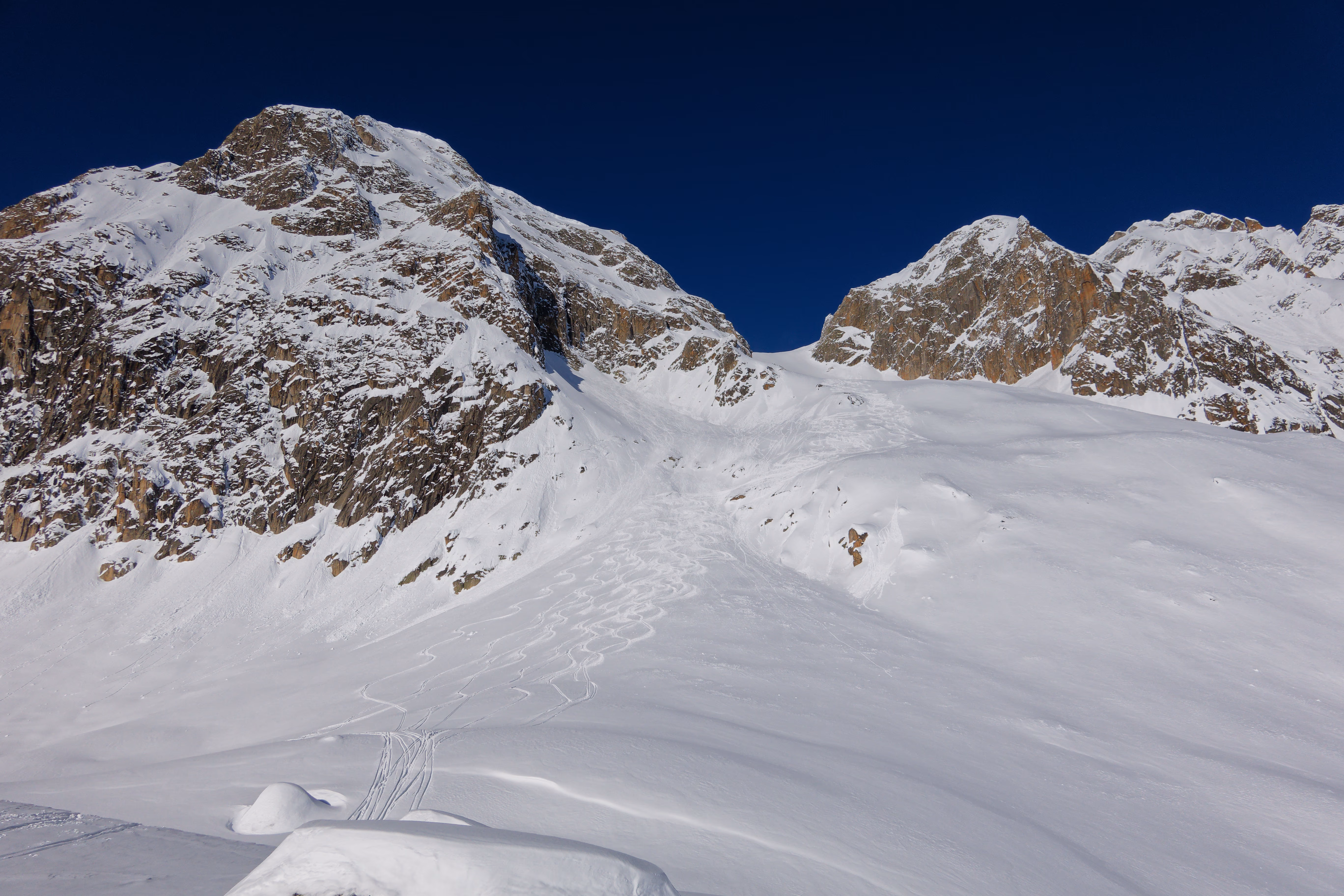 Decidiamo di scendere dal canale che parte poco prima del pendio finale. Troviamo neve discreta, ancora mezz’ora e sarebbe diventata pappa. Lo zero termico infatti è in forte aumento, a inizio settimana si prevede che salga fino a 3800m. Follie di un clima che cambia. Dalla base conviene proseguire in direzione sud fino a incontrare un ampio canale di discesa, molto più agevole di quello vicino alla capanna. Arriviamo sulla strada del Passo della Novena, e in breve all’auto.