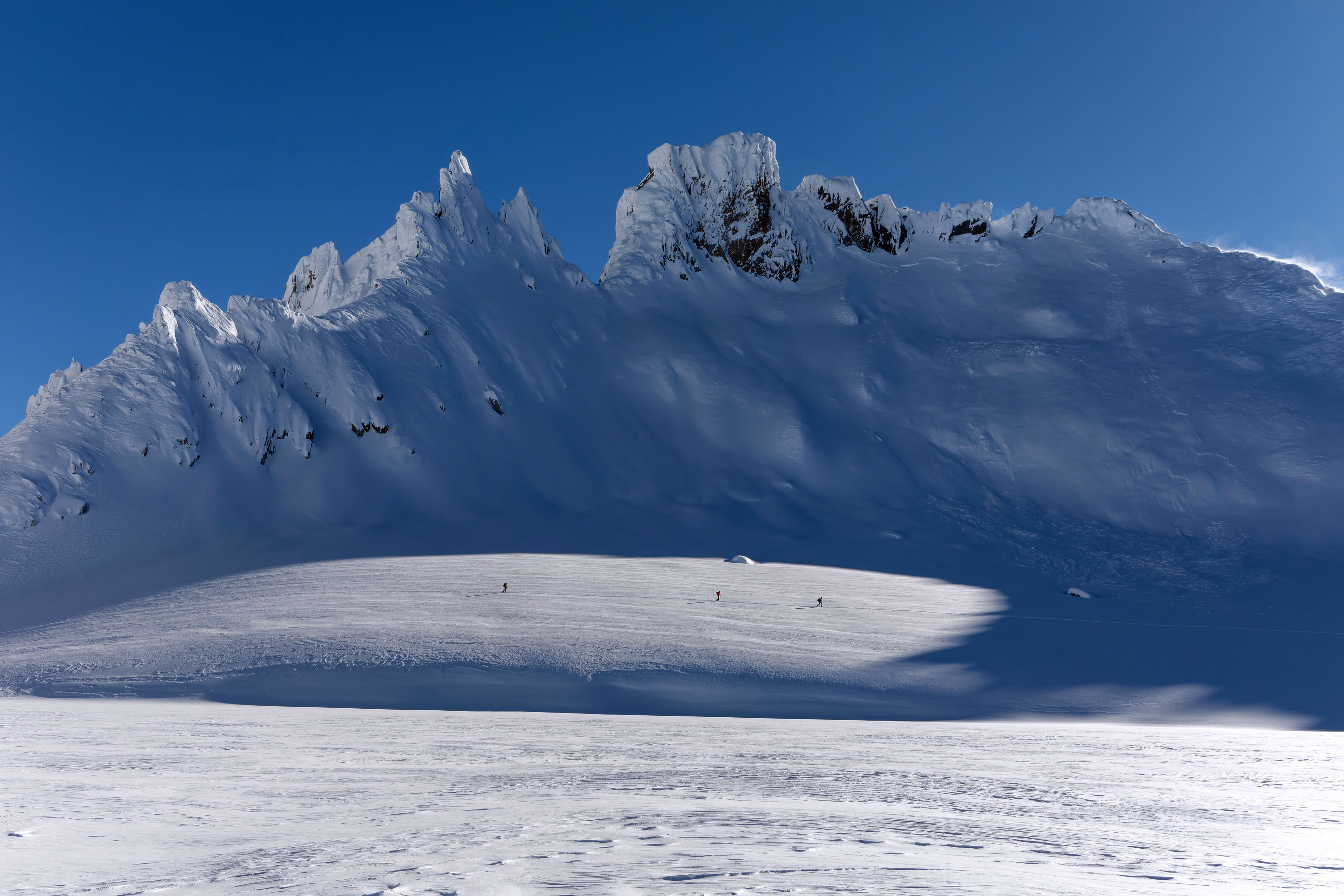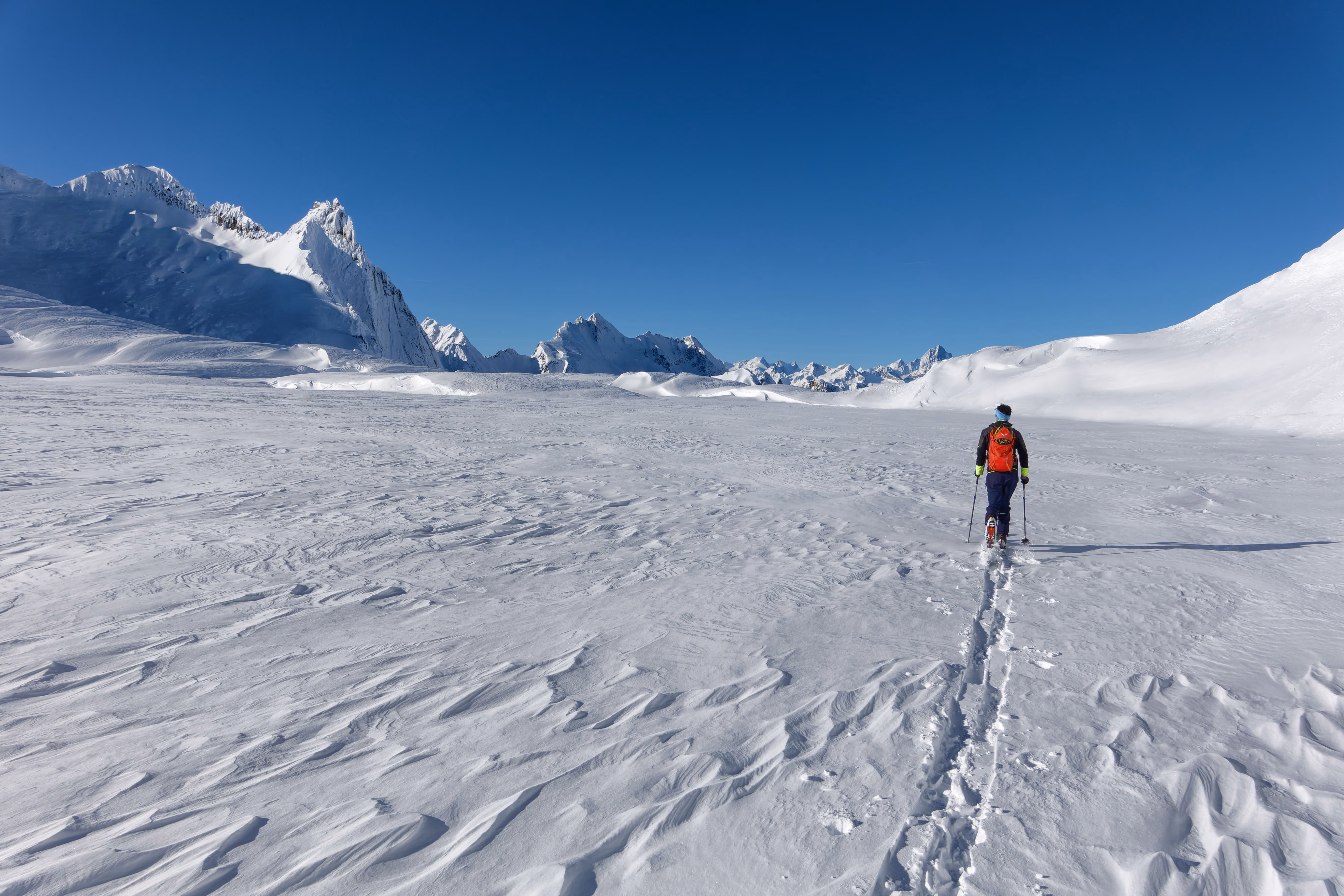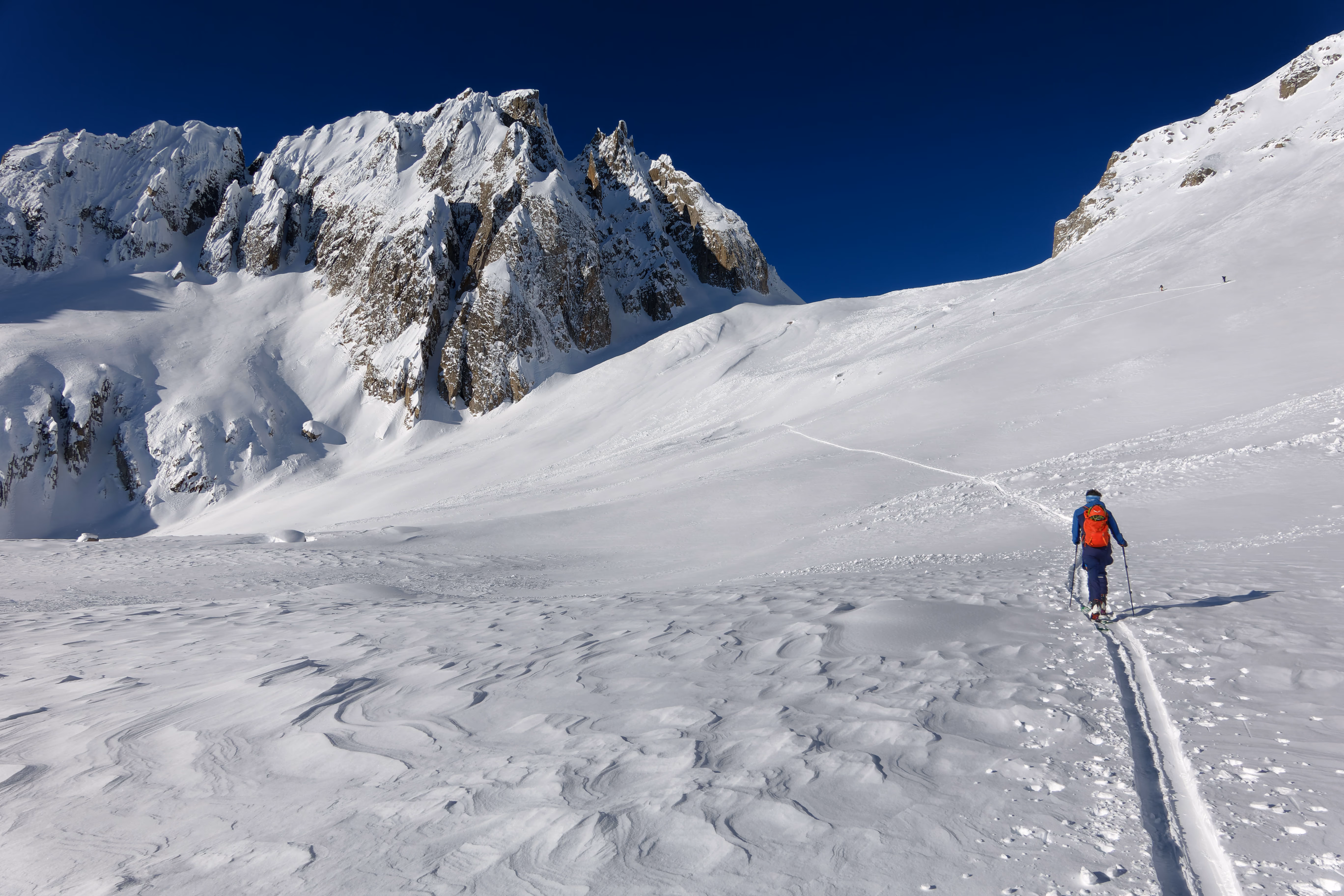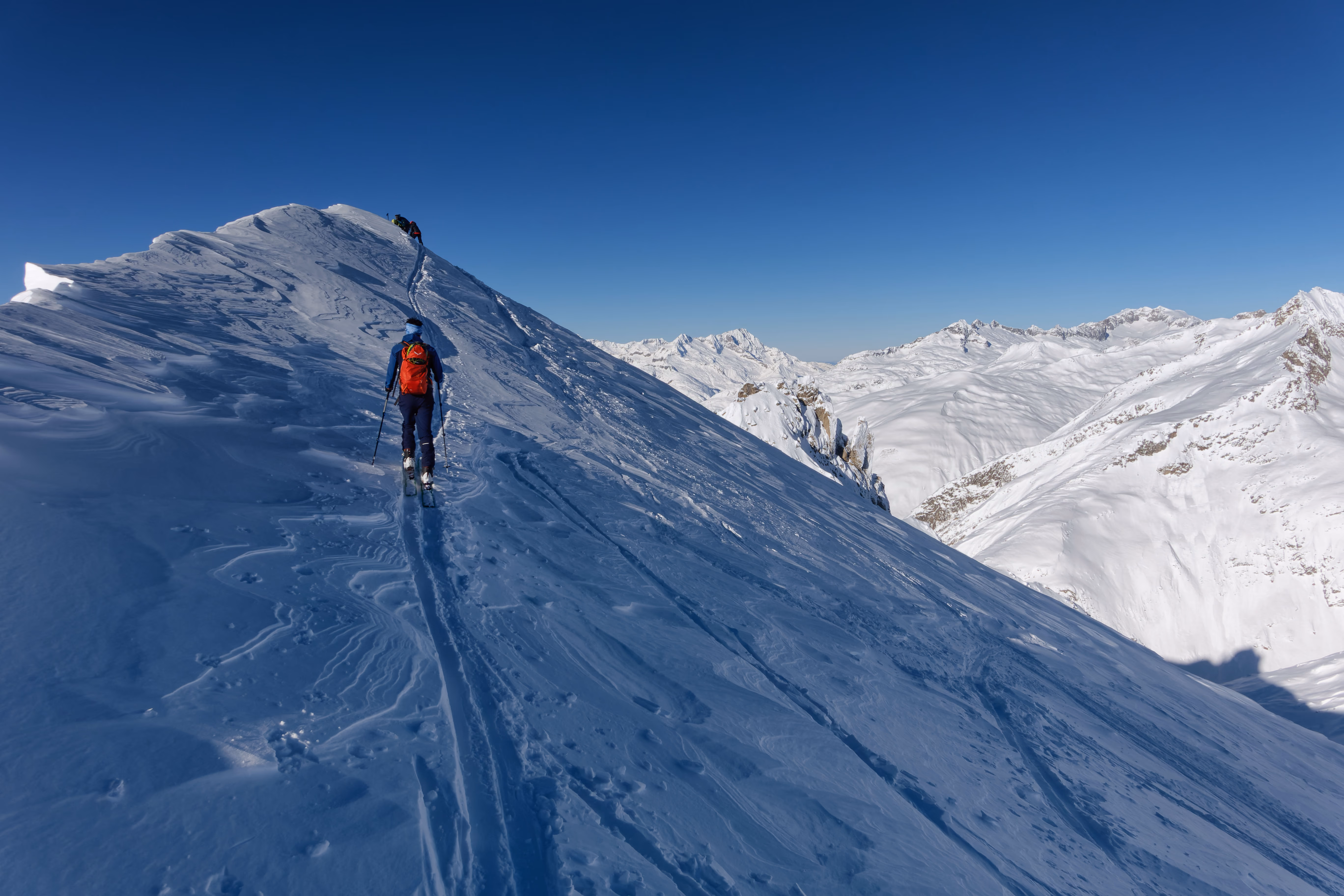 In breve raggiungiamo la capanna dove scambiamo due chiacchiere con il gestore. Ci avvisa che il vento ha soffiato fortissimo e di stare attenti all’ultimo pendio del Gerenpass dove è già scesa una valanga nella notte. Dopo la capanna la salita si impenna e con diversi tornanti ci portiamo a ridosso del pendio finale. La valanga sembra averlo bonificato, ma dobbiamo comunque procedere con attenzione, ci sono diversi placche da vento.