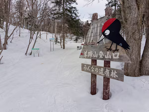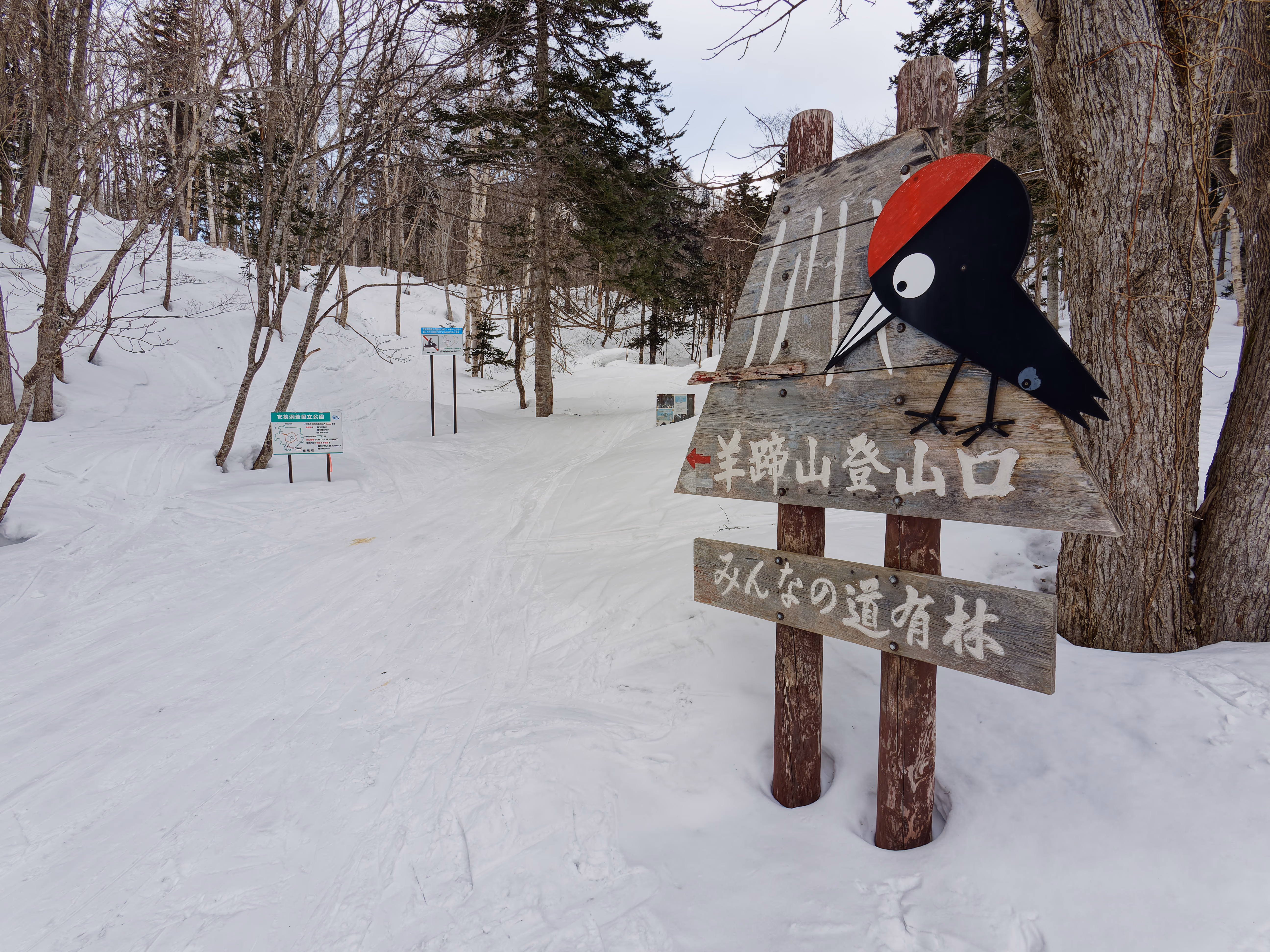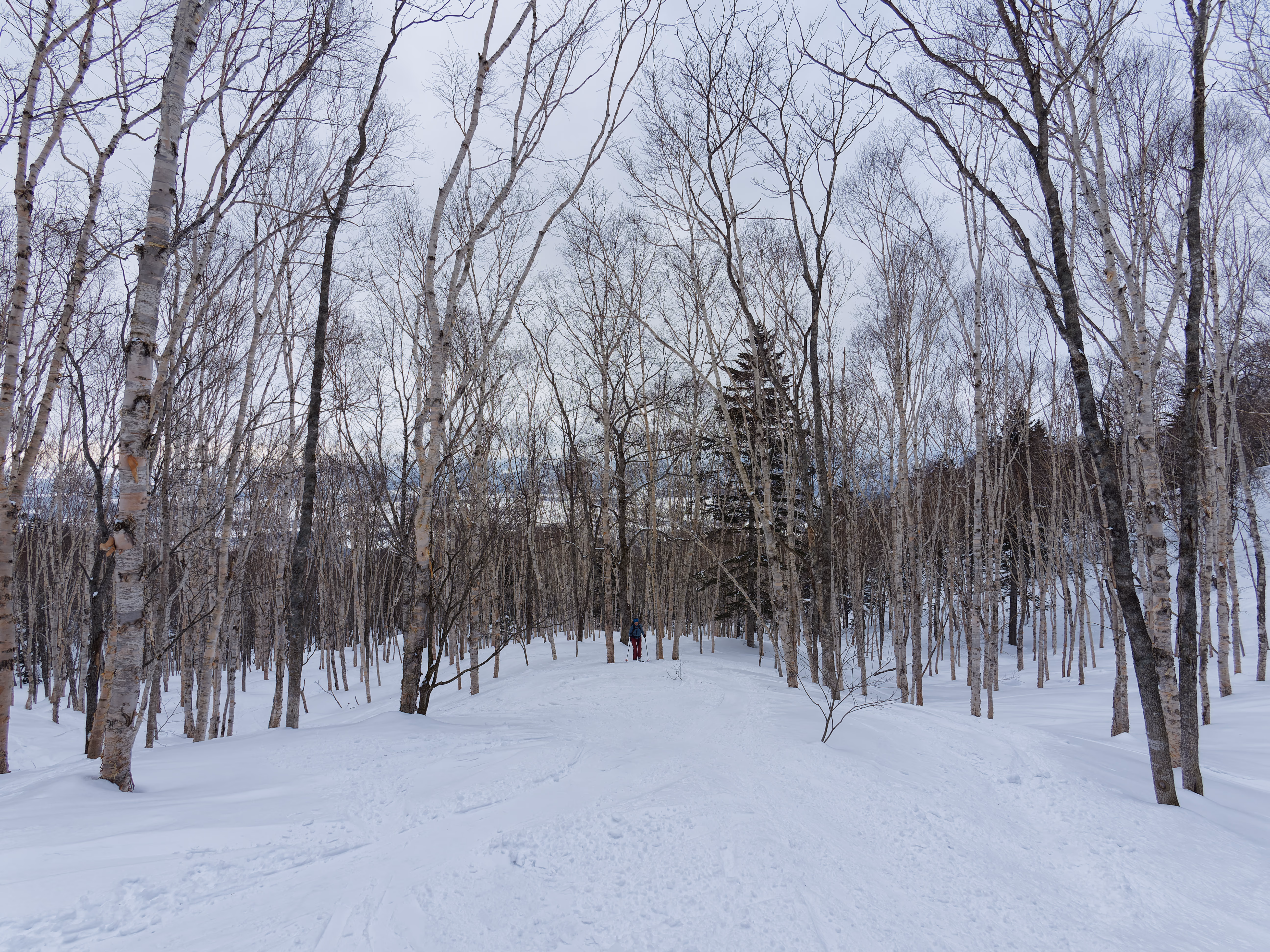 Ci sono diverse vie per salire il vulcano. La più diretta e con meno dislivello è sicuramente la Makkari. Se volete avere un elenco esaustivo di tutte le vie potete consultare questo sito. Partiamo da Niseko e in venti minuti circa arriviamo al Yotei Nature Park dove parcheggiamo. Si parte subito sci ai piedi in direzione della montagna. Dopo pochi metri si incontra l’inizio vero e proprio della via, segnato da un cartello con un picchio. La parte iniziale attraversa un fitto bosco di betulle.