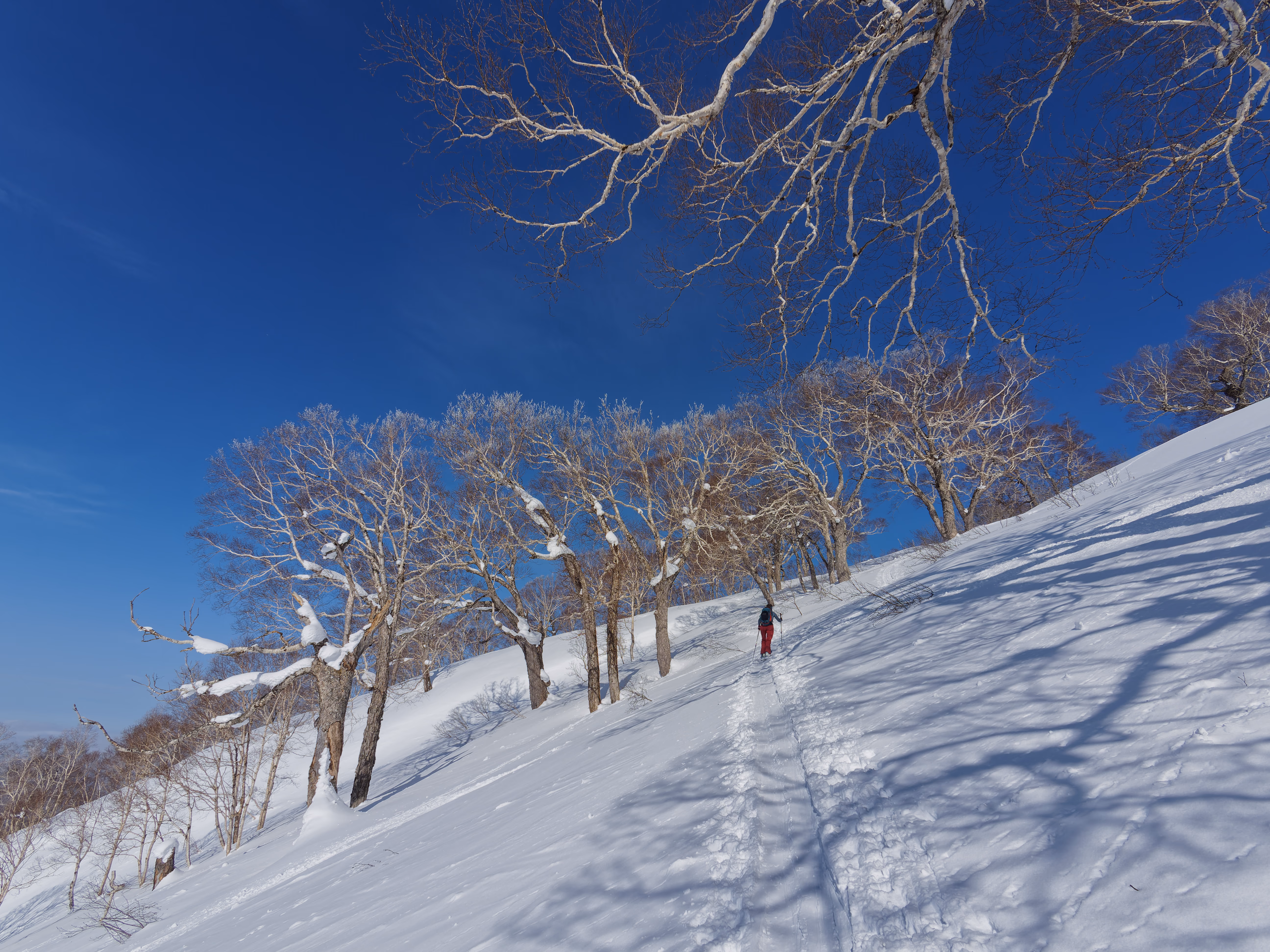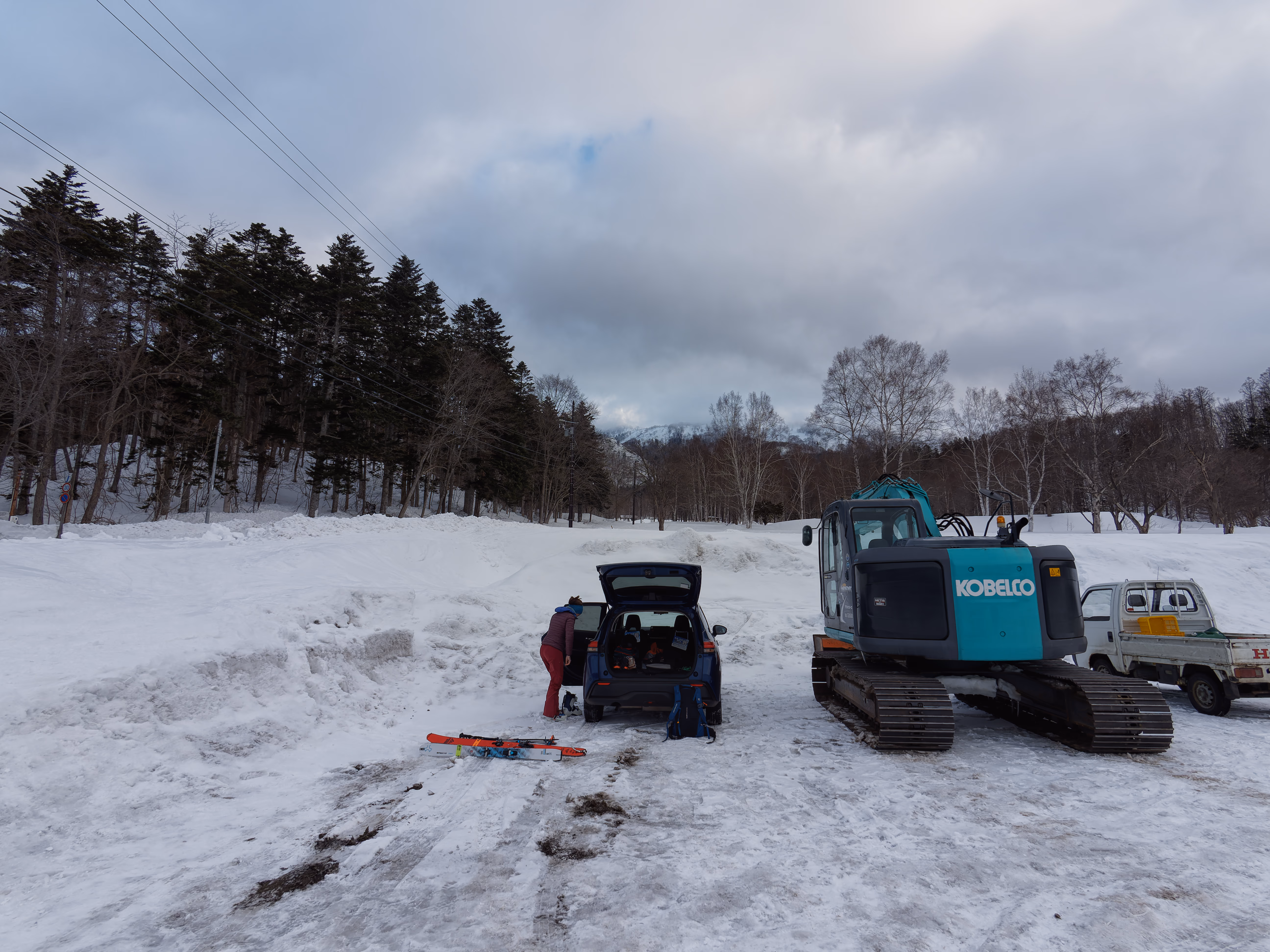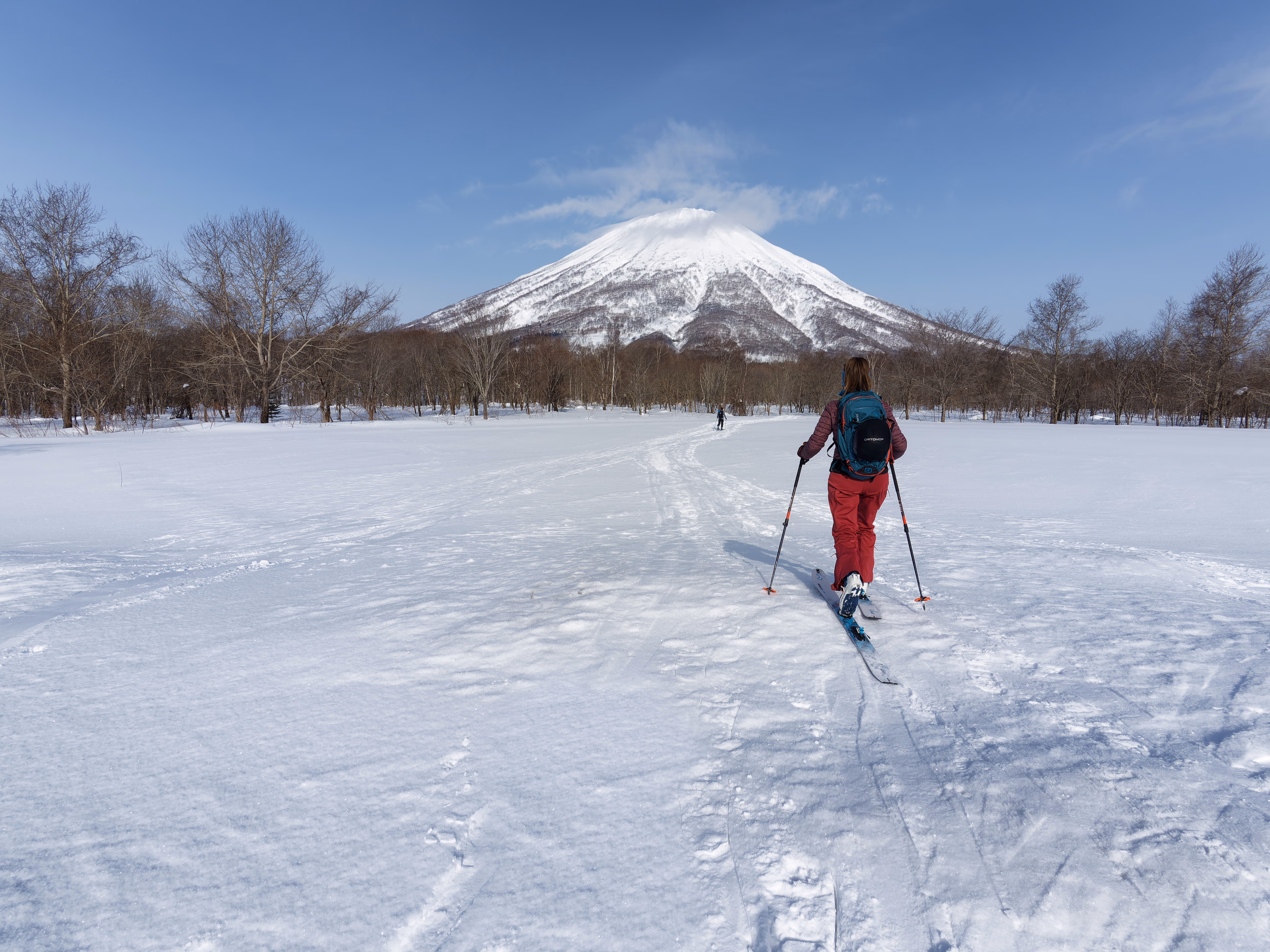 Ci sono diverse vie per salire il vulcano. La più diretta e con meno dislivello è sicuramente la Makkari. Se volete avere un elenco esaustivo di tutte le vie potete consultare questo sito. Partiamo da Niseko e in venti minuti circa arriviamo al Yotei Nature Park dove parcheggiamo. Si parte subito sci ai piedi in direzione della montagna. Dopo pochi metri si incontra l’inizio vero e proprio della via, segnato da un cartello con un picchio. La parte iniziale attraversa un fitto bosco di betulle.