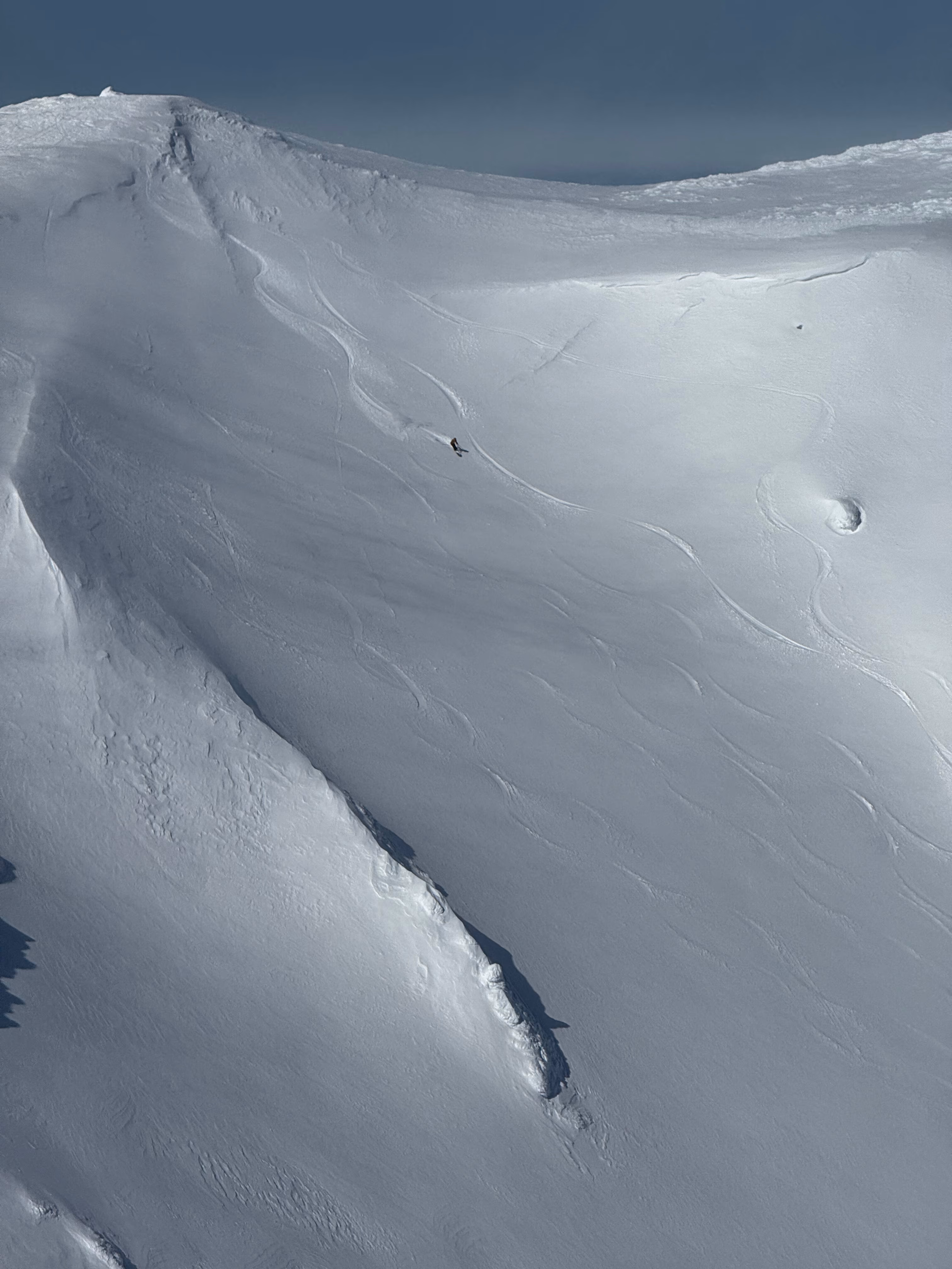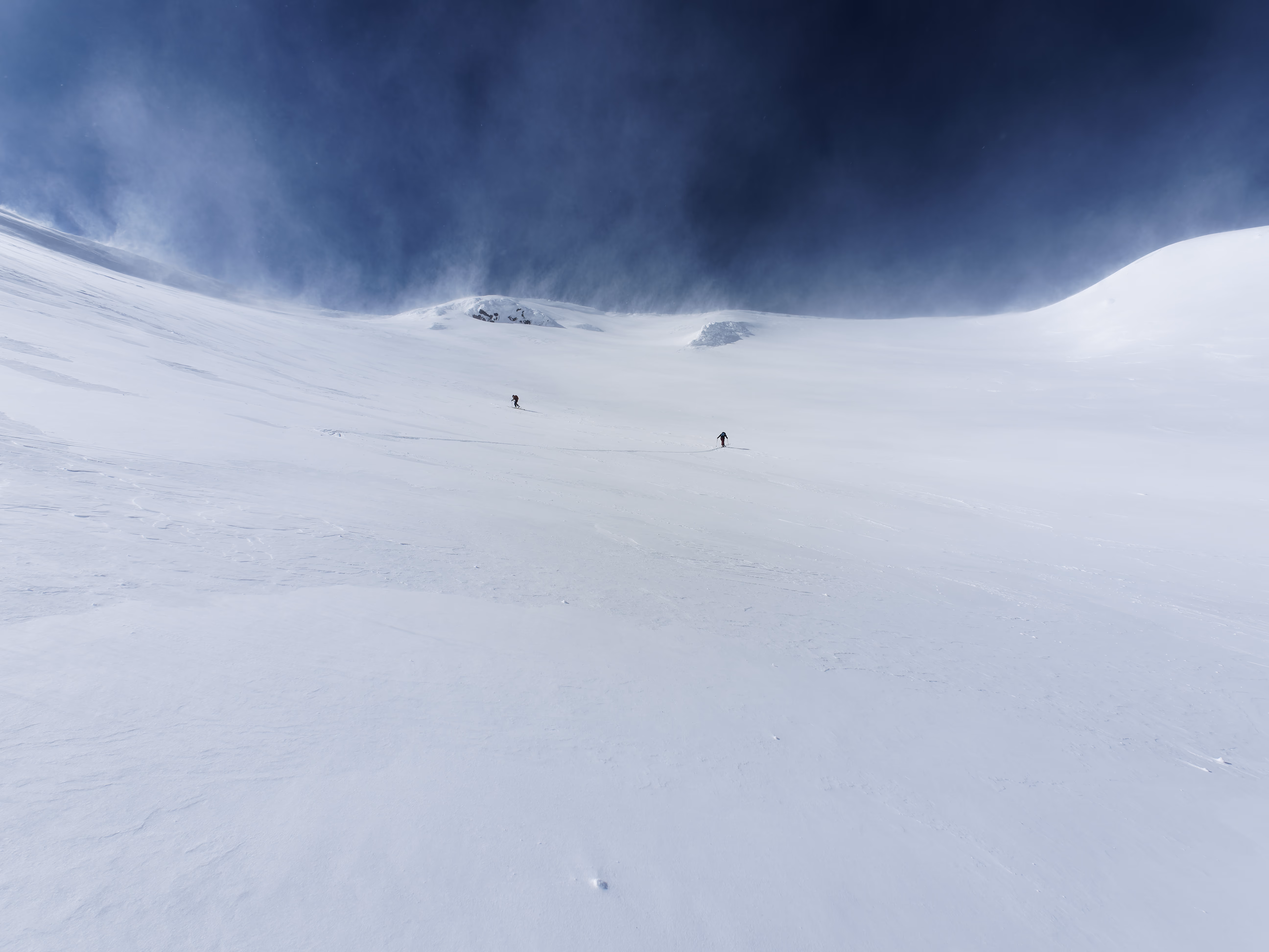 Fabiana si ferma qui, proseguo da solo fino in vetta senza ramponi. Eccomi sul cratere, davvero suggestivo essere qui con gli sci. Non posso perdermi la discesa fino al centro del cratere, quindi calzo gli sci e parto. Polvere spettacolare riportata dal vento, è tutto perfetto. Rimetto le pelli e risalgo verso destra dove la pendenza è minore, per poi tornare al punto di partenza.La discesa migliore è sicuramente quella lungo il pendio sudovest, raggiungibile in pochi minuti dall’arrivo della via. Qui si accumula tutta la neve dei fronti che arrivano da nordovest.