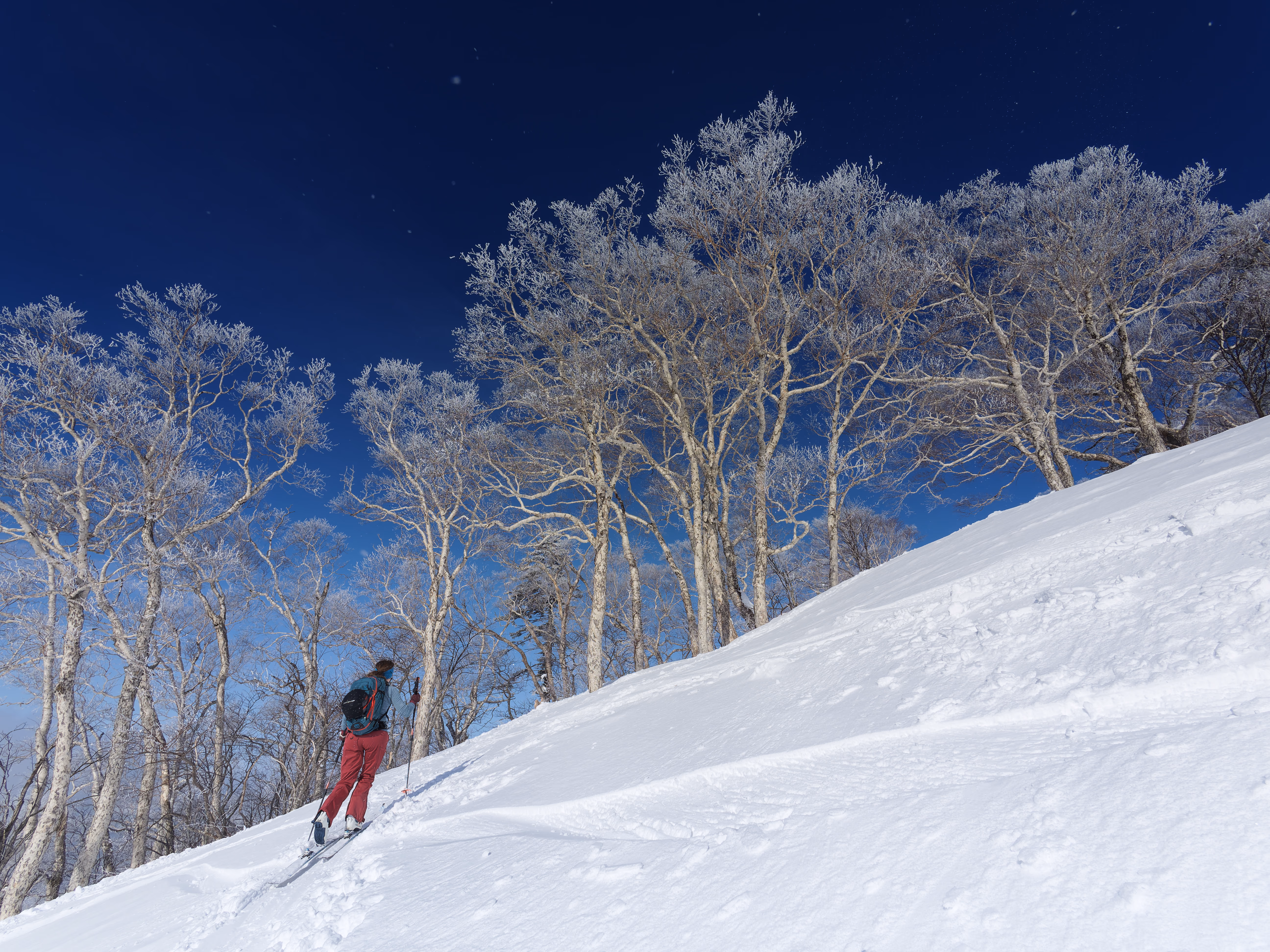 Mano a mano che si sale il bosco si dirada e le pendenze aumentano. Guadagniamo la dorsale e superiamo il limite delle nuvole. In questo preciso momento, ci si presenta lo spettacolo delle betulle avvolte nella galaverna, creando un contrasto incantevole con il cielo blu. È un’immagine indimenticabile.