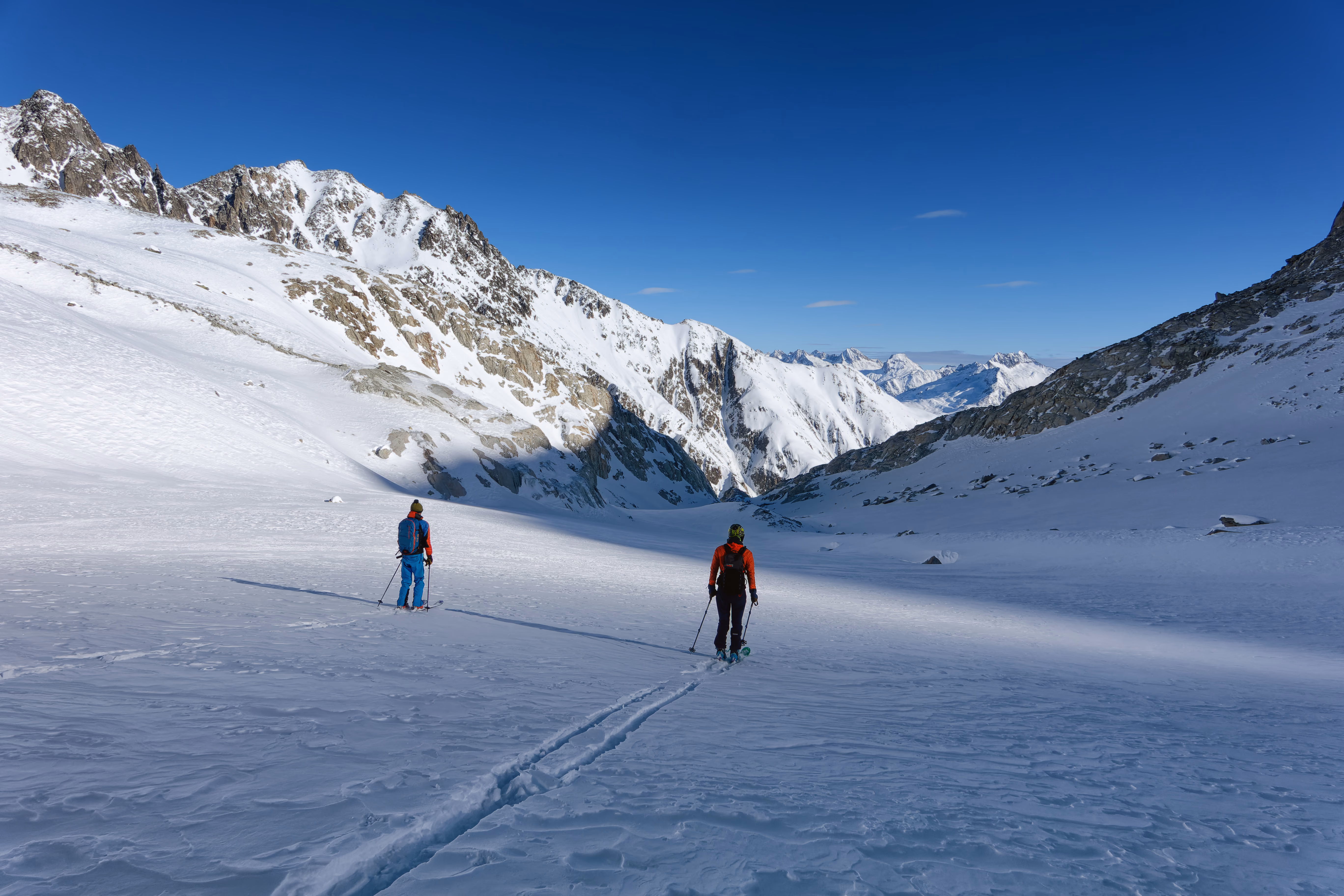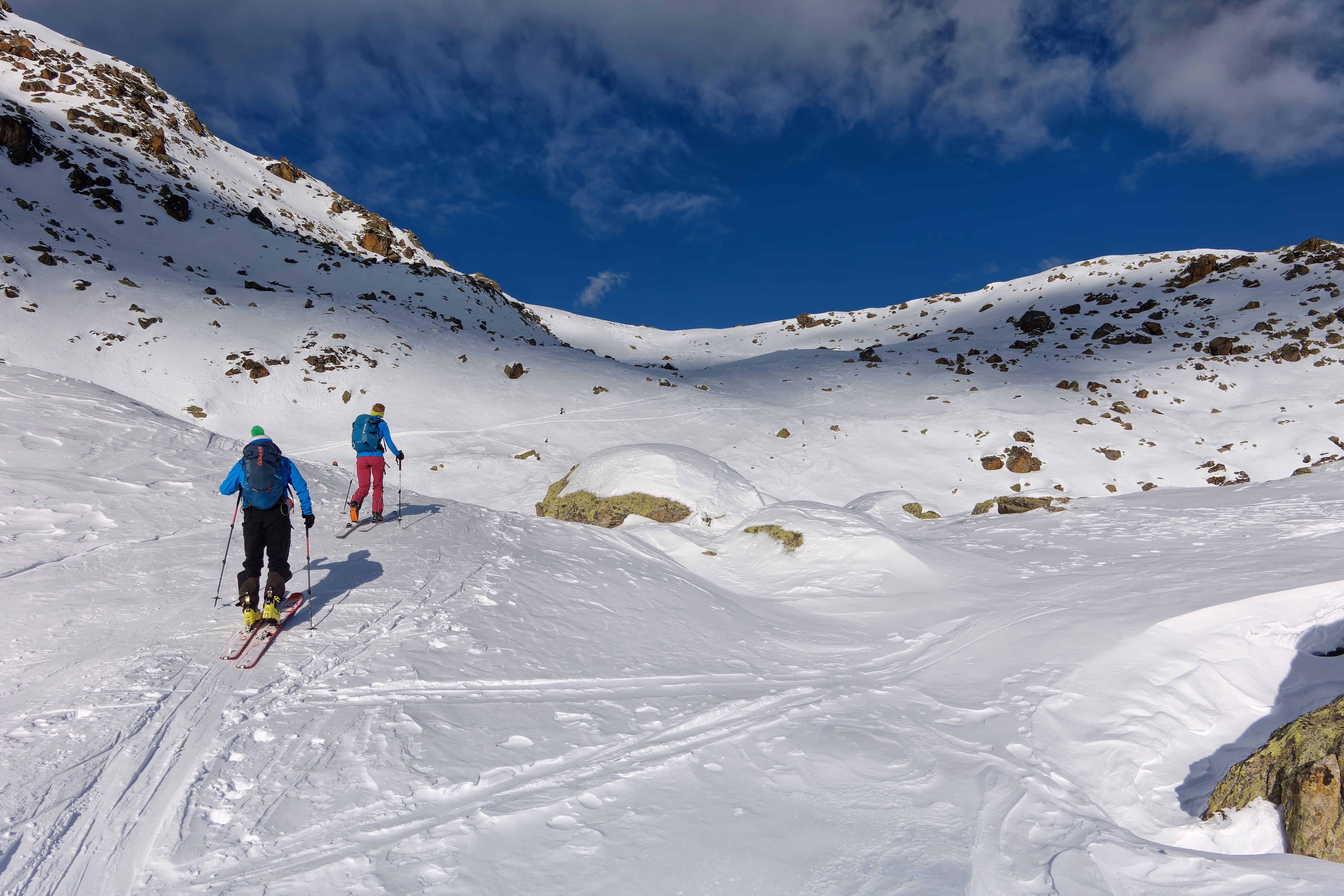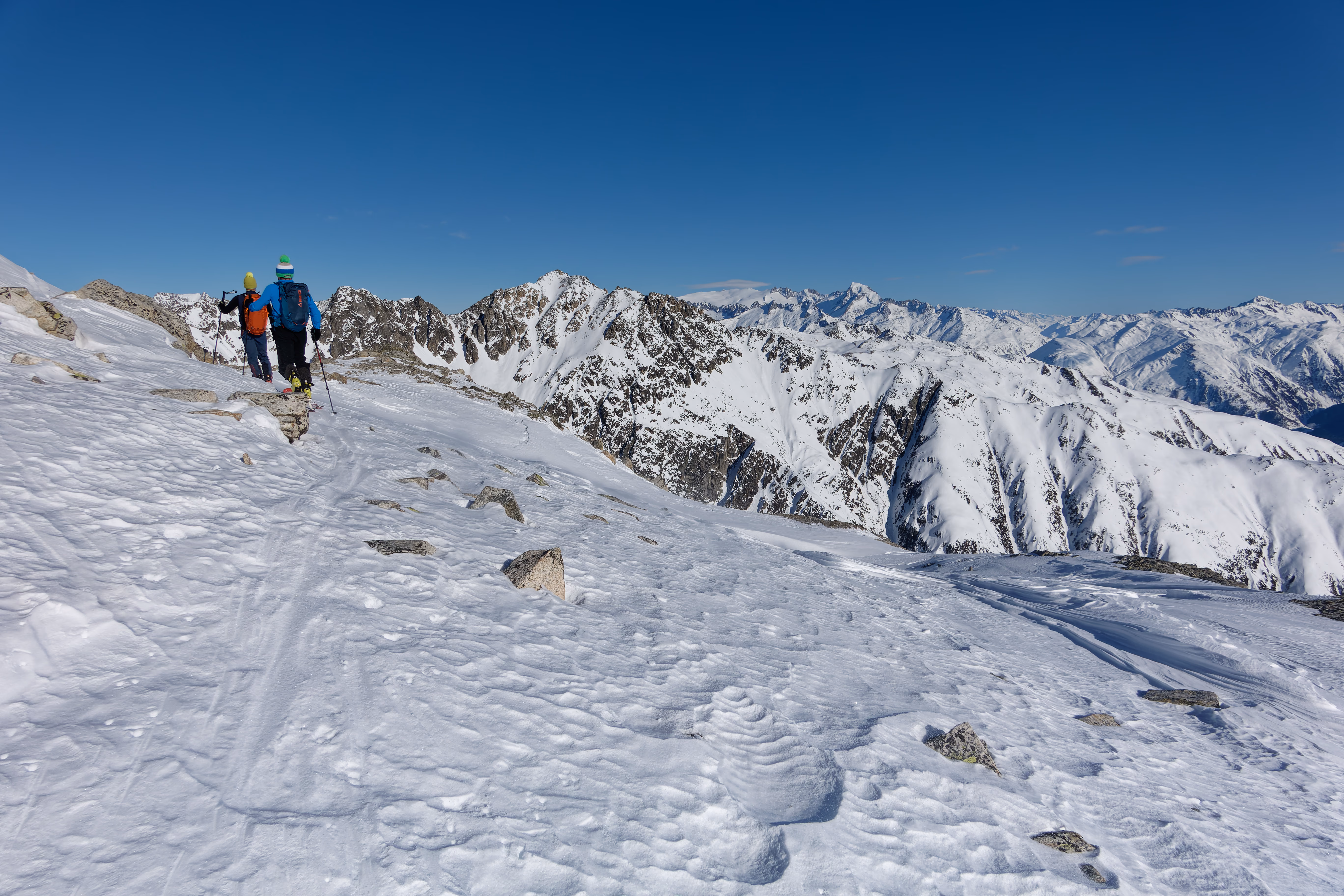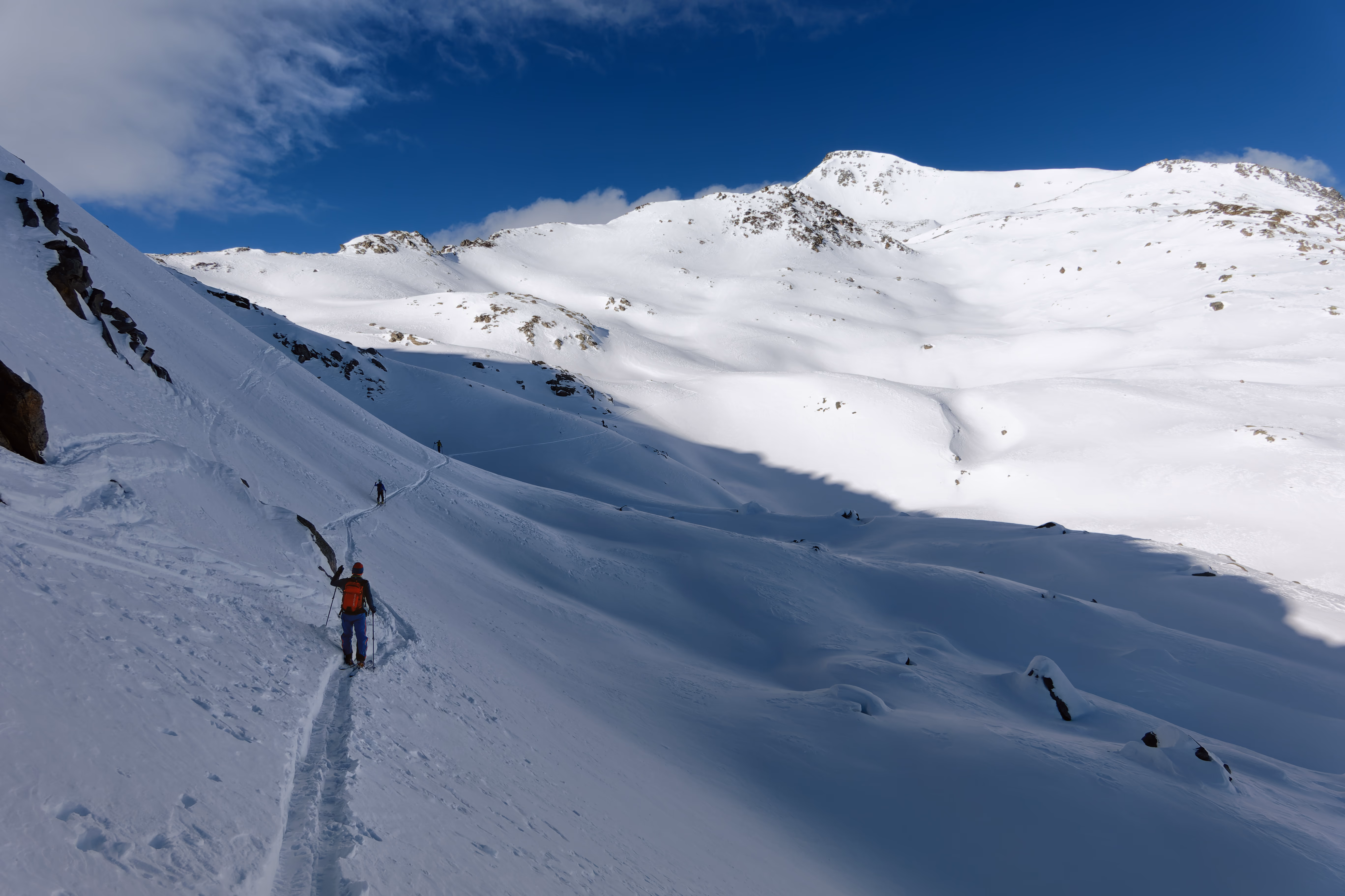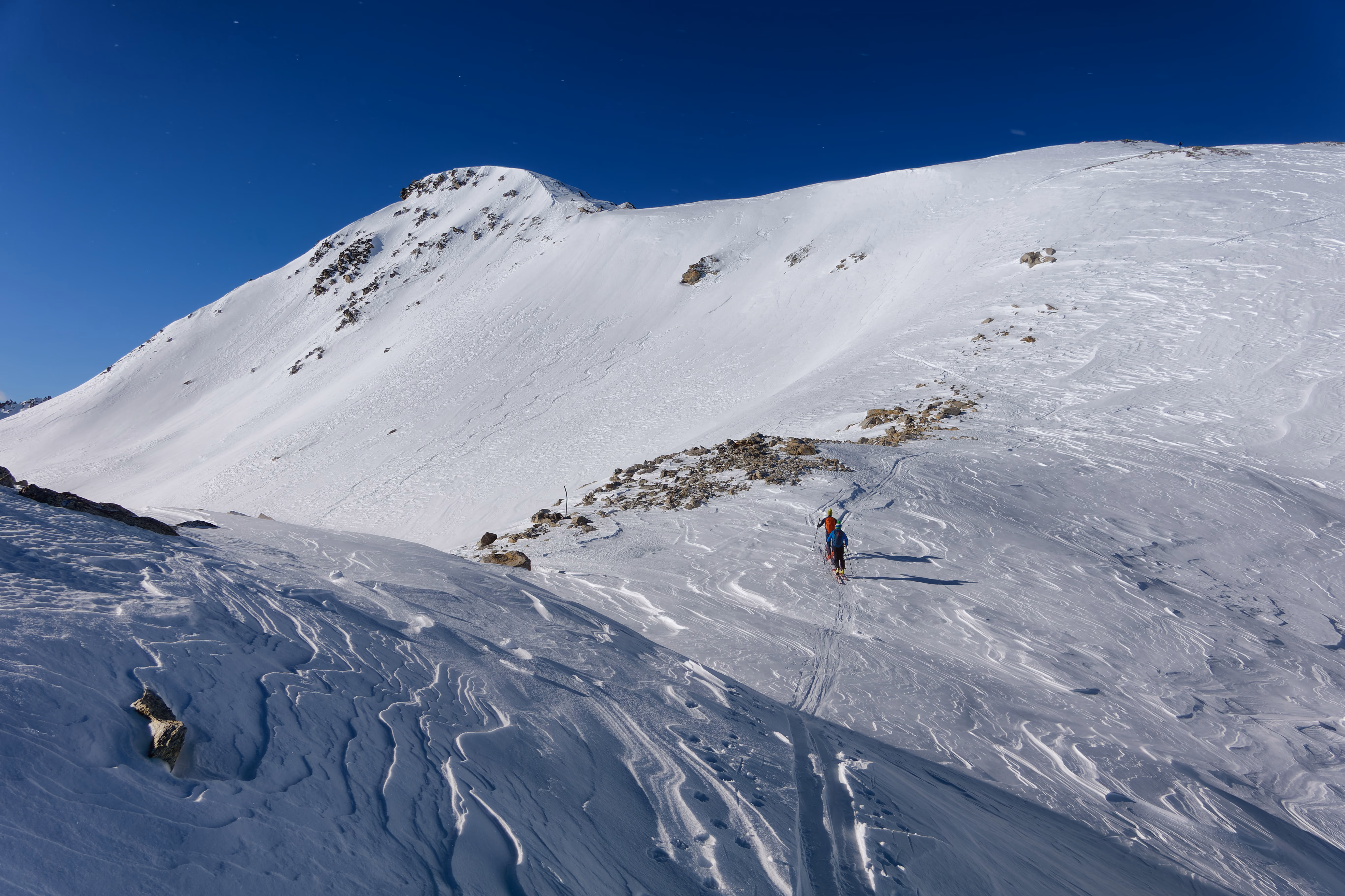 Cambio di assetto e iniziamo la discesa sul versante nord. Purtroppo il vento ha rovinato la neve, lasciando una fastidiosa crosta non portante. Poco male: il paesaggio è magnifico e abbiamo la montagna tutta per noi. Al termine del ghiacciaio deviamo a destra per raggiungere il canale di discesa. Attenzione a non imboccare il primo canale che si incontra: è necessario proseguire con un lungo traverso verso destra per raggiungere quello corretto.