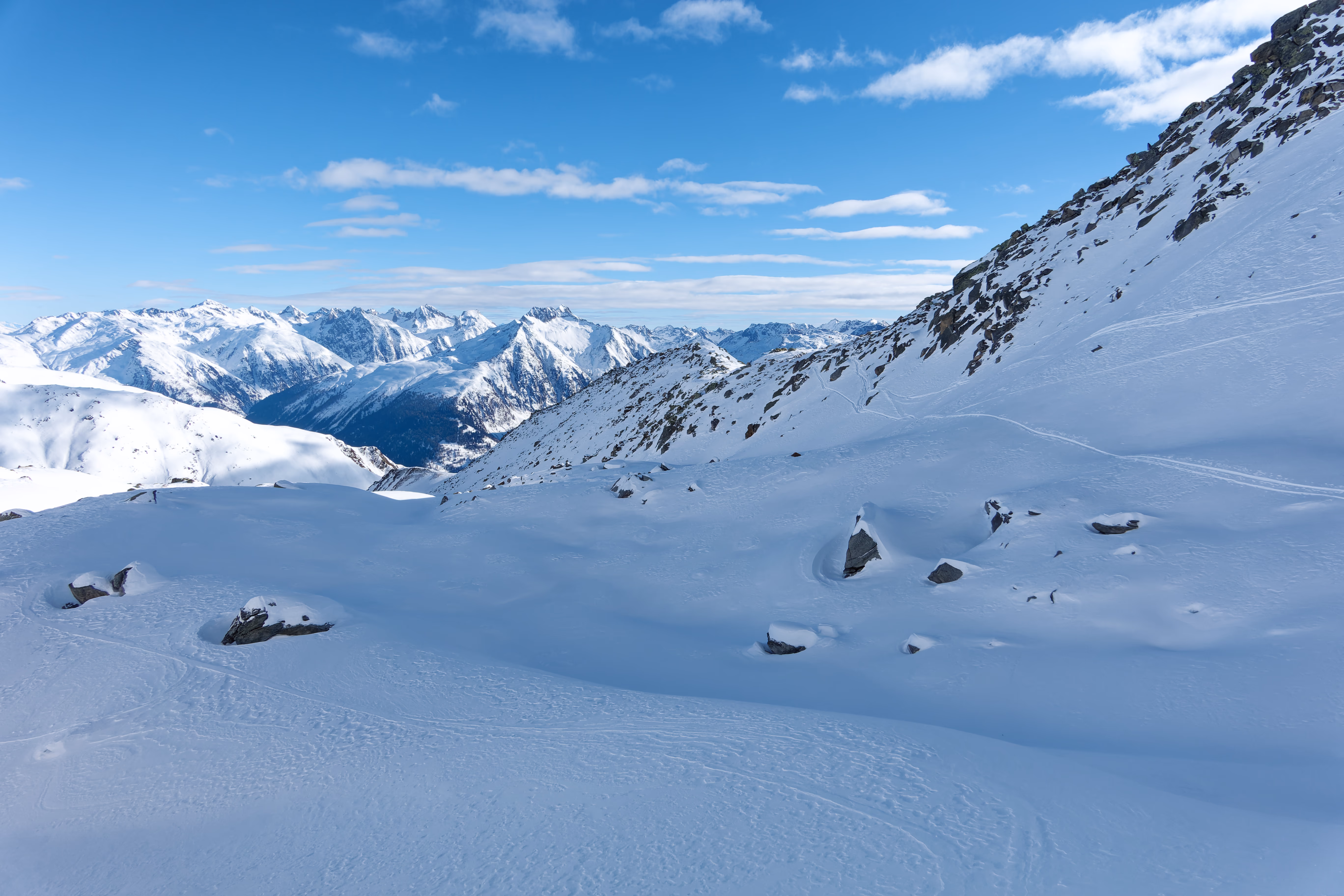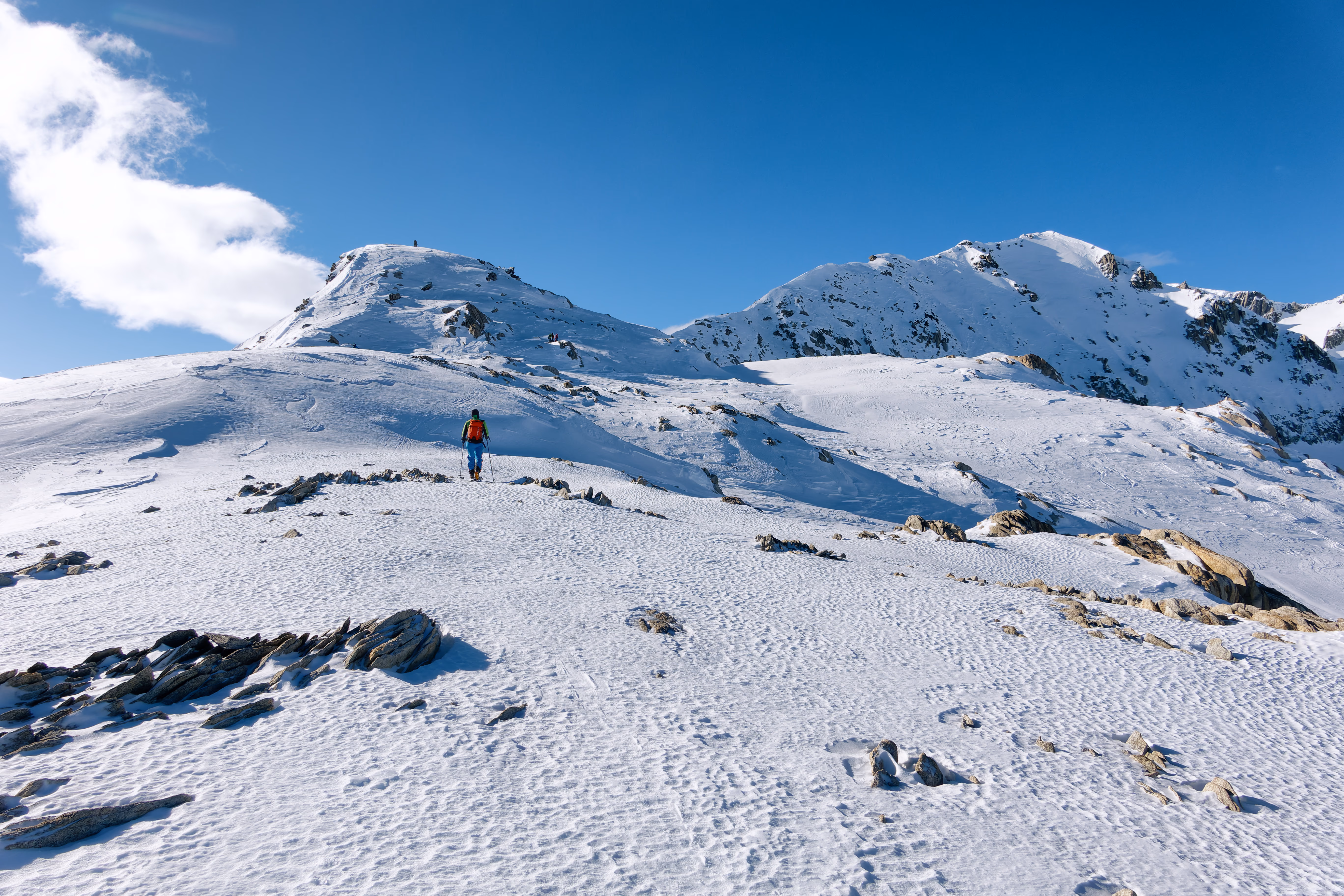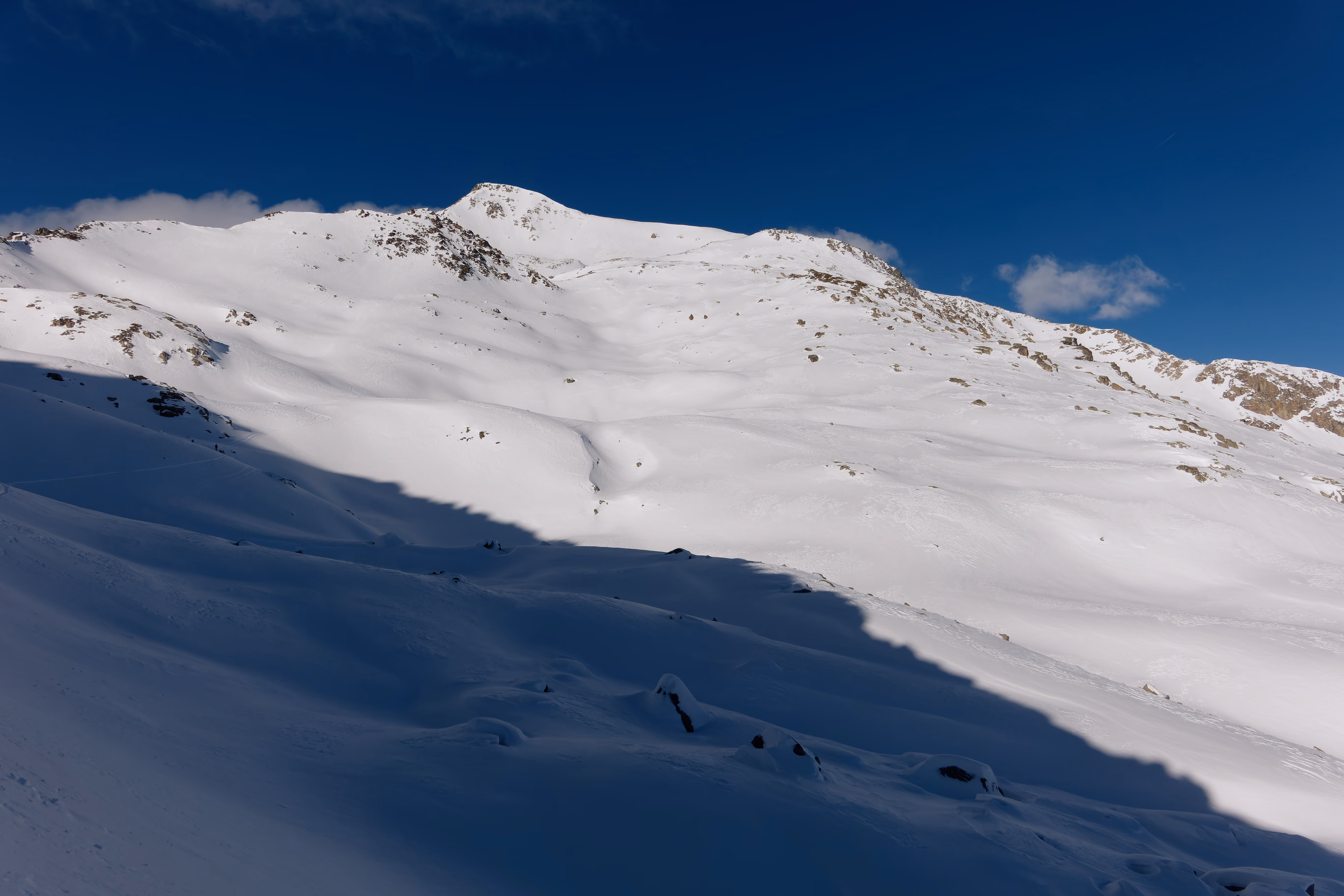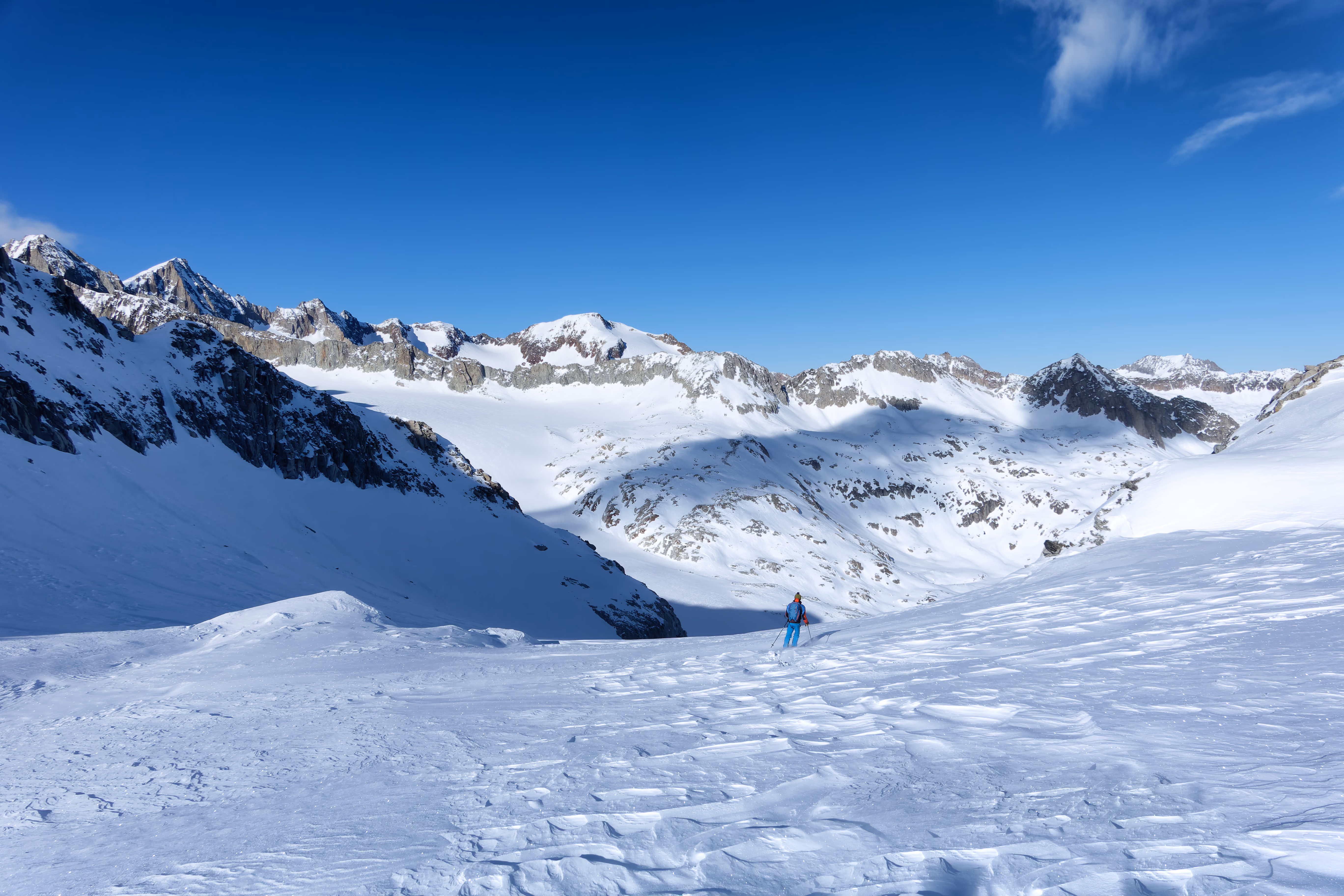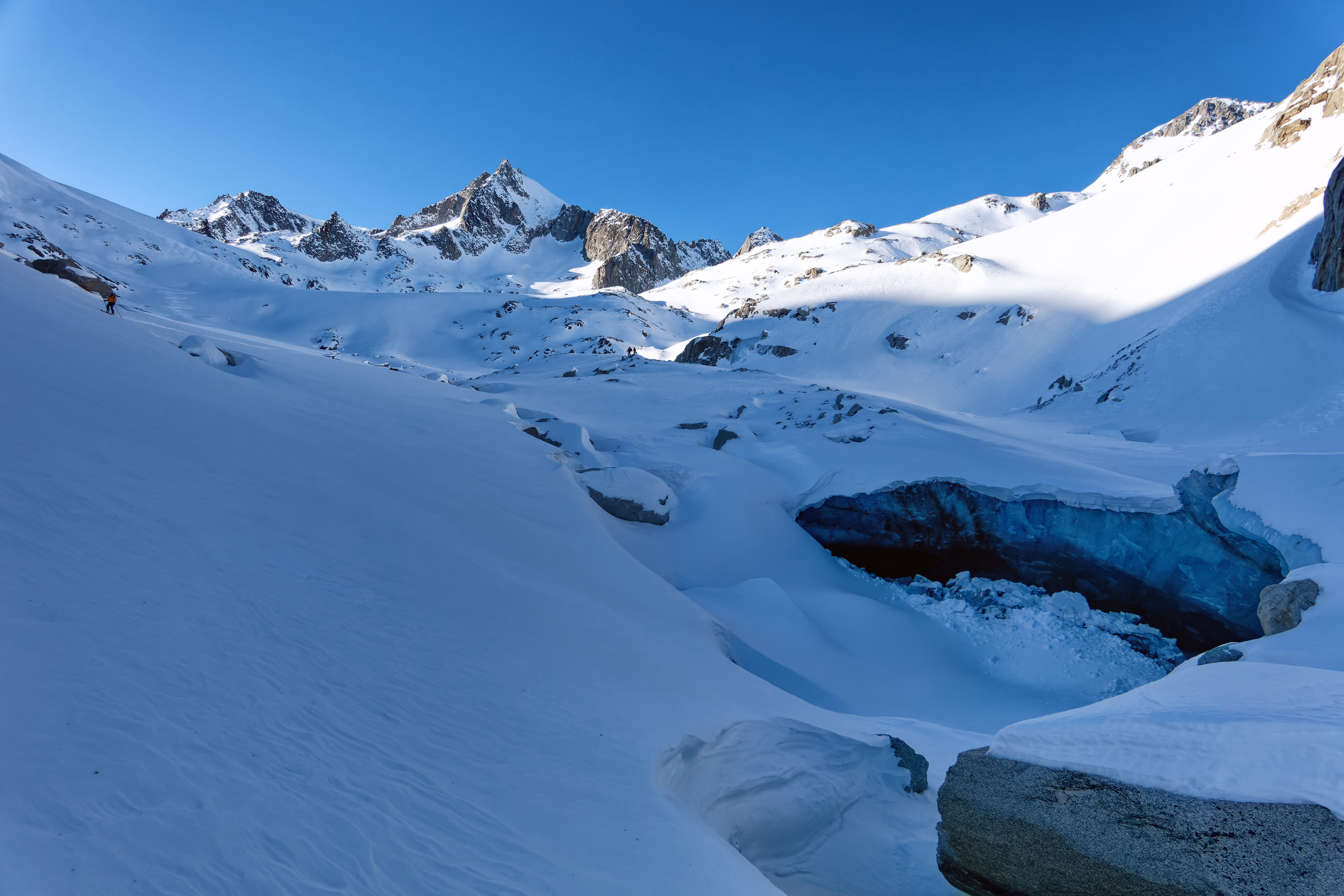 Cambio di assetto e iniziamo la discesa sul versante nord. Purtroppo il vento ha rovinato la neve, lasciando una fastidiosa crosta non portante. Poco male: il paesaggio è magnifico e abbiamo la montagna tutta per noi. Al termine del ghiacciaio deviamo a destra per raggiungere il canale di discesa. Attenzione a non imboccare il primo canale che si incontra: è necessario proseguire con un lungo traverso verso destra per raggiungere quello corretto.