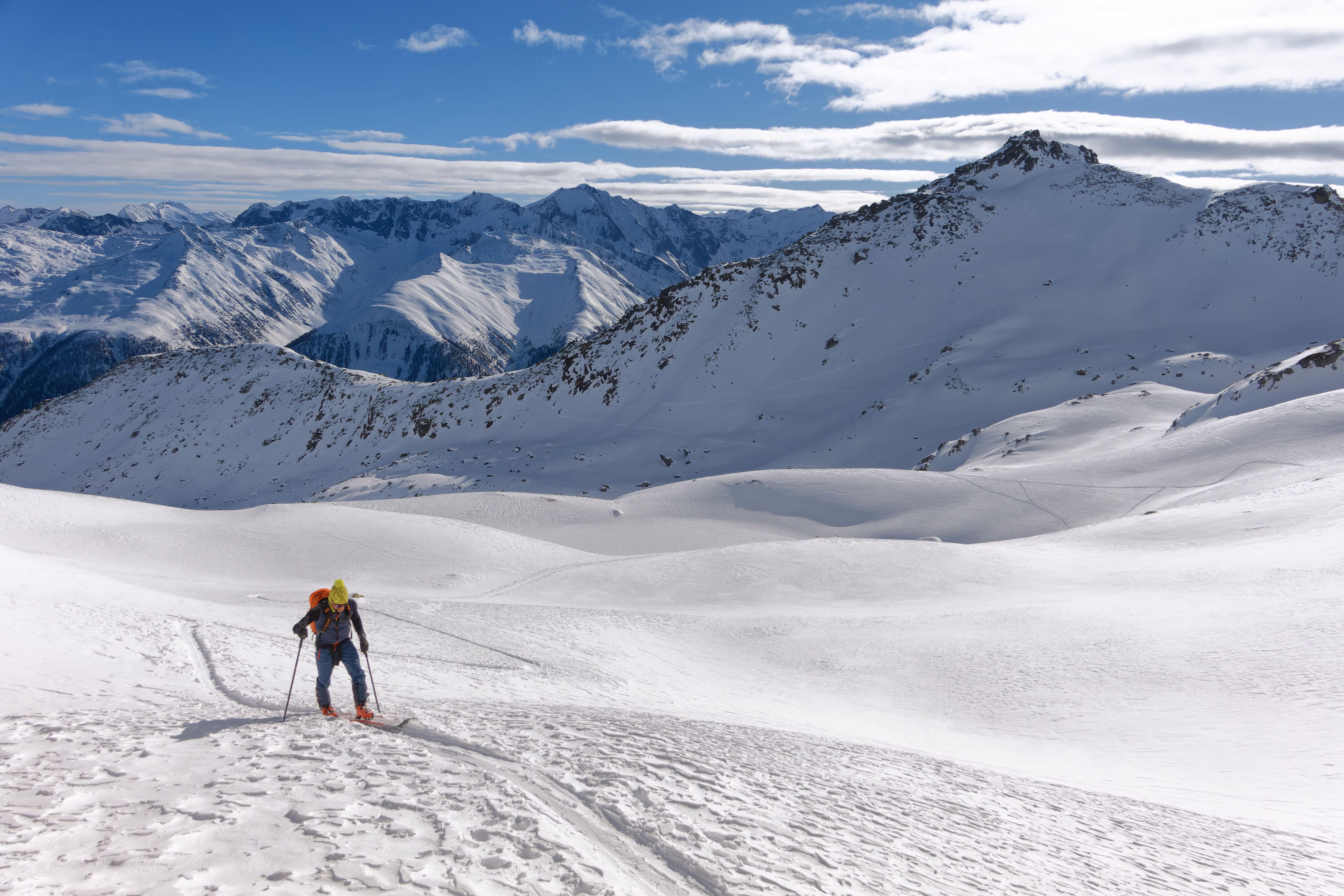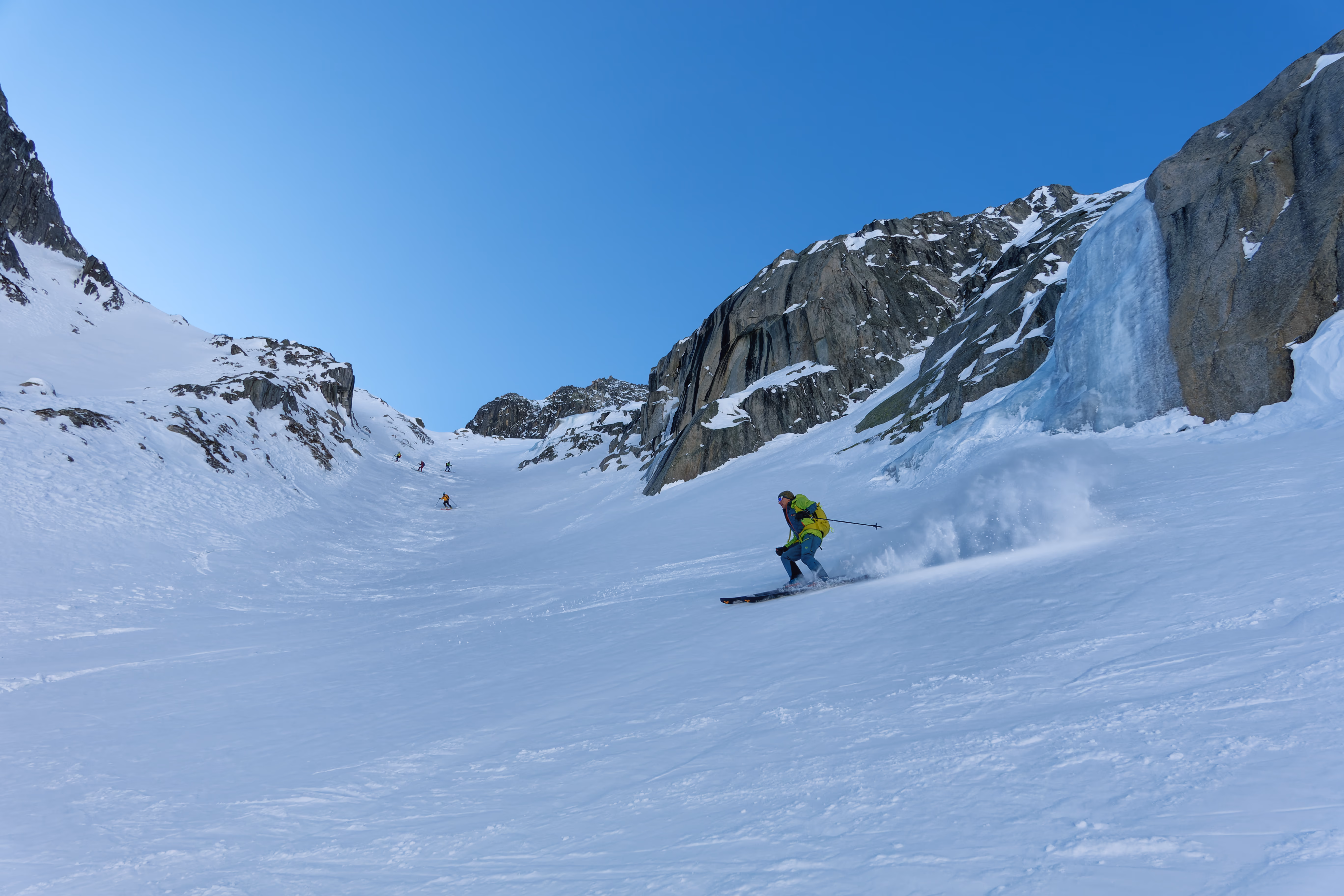 Il canale è spettacolare: pendenze perfette, ampio e incassato tra maestose pareti rocciose da cui scendono imponenti cascate di ghiaccio. Uno scenario mozzafiato, solo il canale vale la gita. Alla fine del canale, ci immettiamo nel lungo vallone che conduce a Münster. Il percorso scorrevole permette di sciare fino in fondo senza mai dover spingere. Una gita davvero bella, anche se oggi le condizioni non erano delle migliori. La discesa a nord, però, è una vera chicca: con neve fresca, sarebbe semplicemente perfetta. Si tratta comunque di un itinerario lungo, richiede un ottimo allenamento.