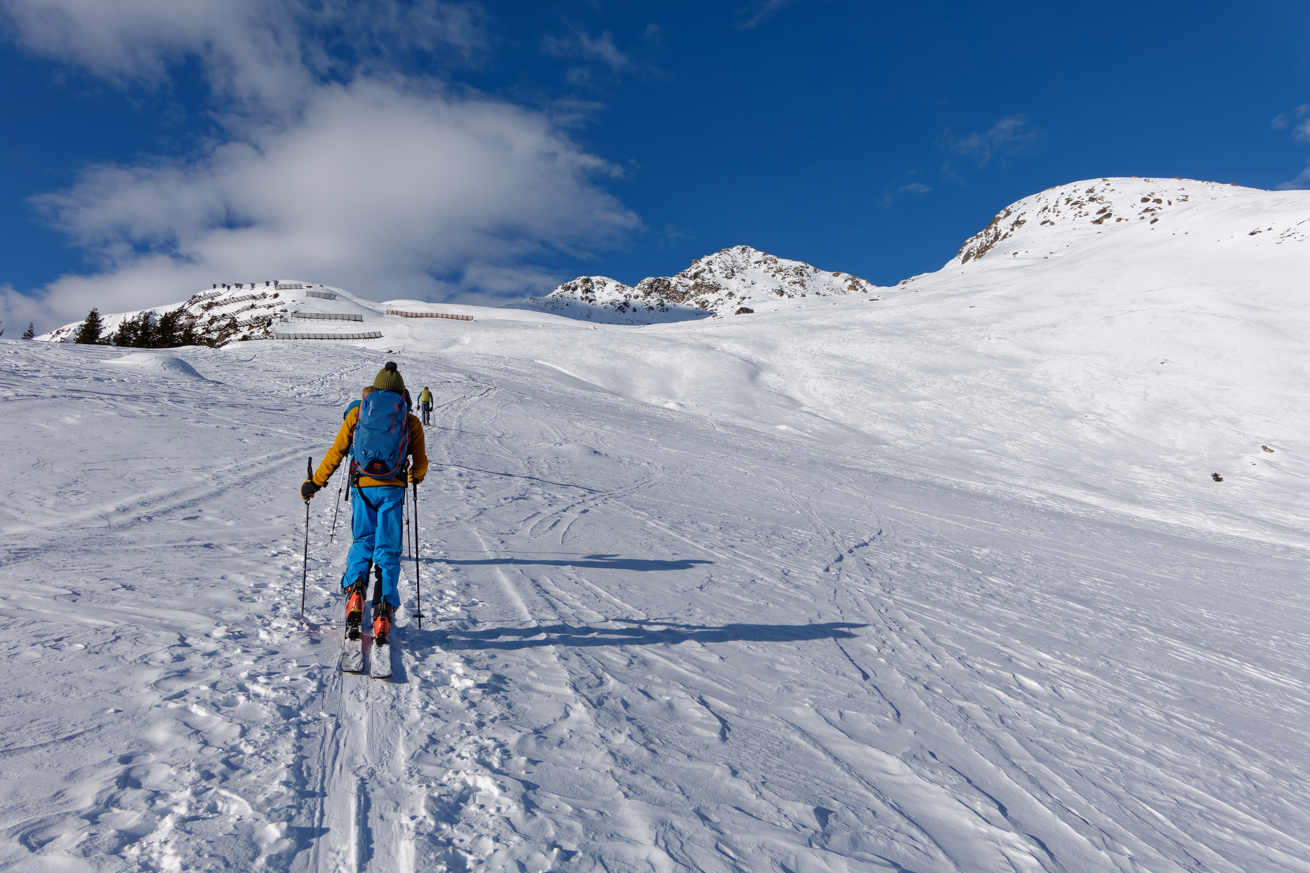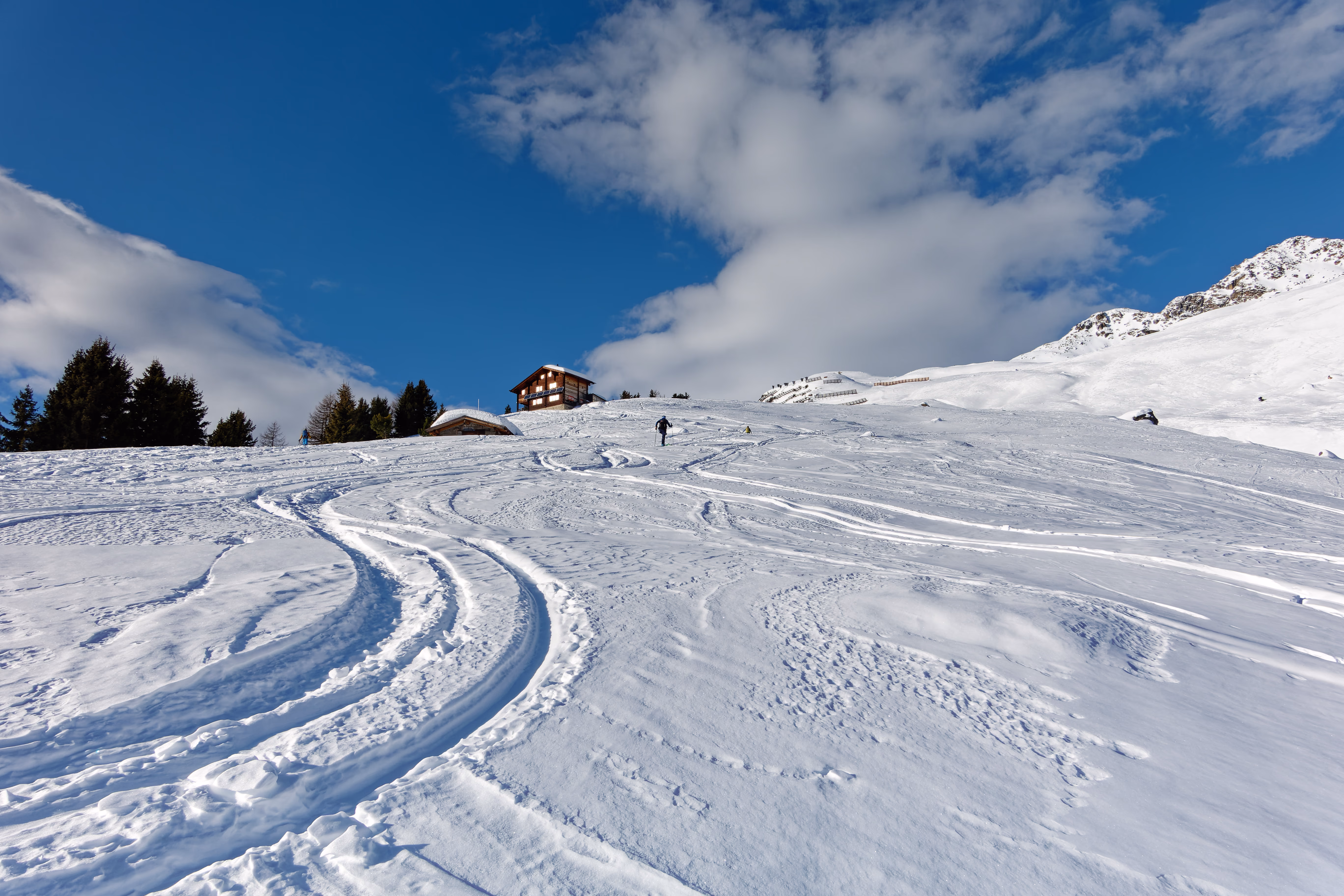 Iniziamo la salita lungo la stradina nel bosco, un ottimo inizio per scaldare le gambe. Terminato questo tratto, proseguiamo su ampi pendii ai margini del bosco, seguendo la direzione ovest, fino a raggiungere la Galmihornhütte, oggi chiusa. L’area sopra il rifugio è splendida, caratterizzata da ampi pendii perfetti per lo sci. Oggi, però, sceglieremo di scendere dall’altro versante.
