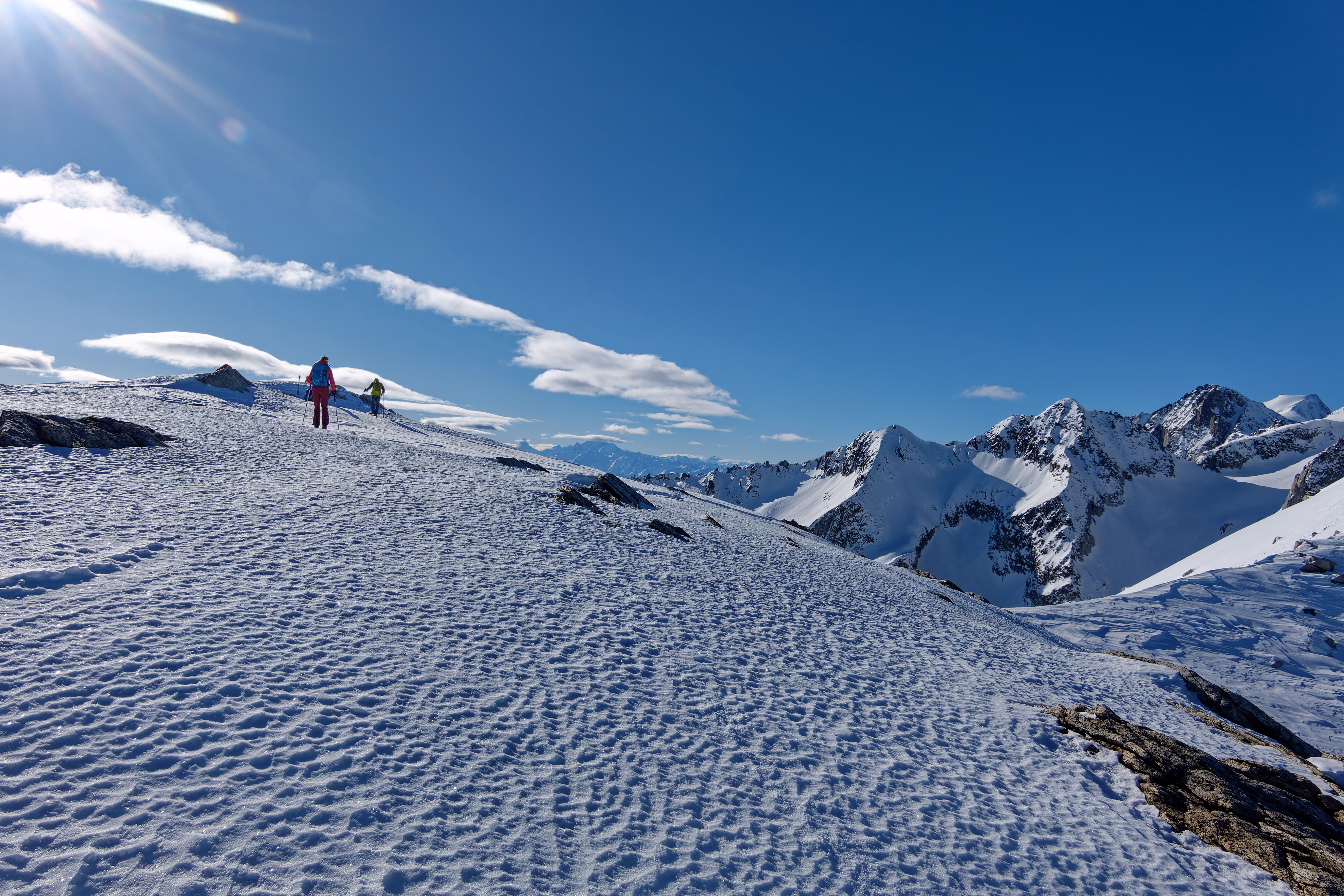 In breve raggiungiamo il Colle Chastellicke, da cui possiamo ammirare per la prima volta la nostra meta. Proseguiamo in leggera discesa senza togliere gli sci, attraversando verso ovest, per poi affrontare l’ultima ripida salita, costante e senza tregua. Raggiungiamo la cresta finale e, sci ai piedi, tocchiamo finalmente la vetta. Il panorama è straordinario: dal Cervino al Dammastock, con di fronte a noi le imponenti pareti del gruppo del Finsteraarhorn.