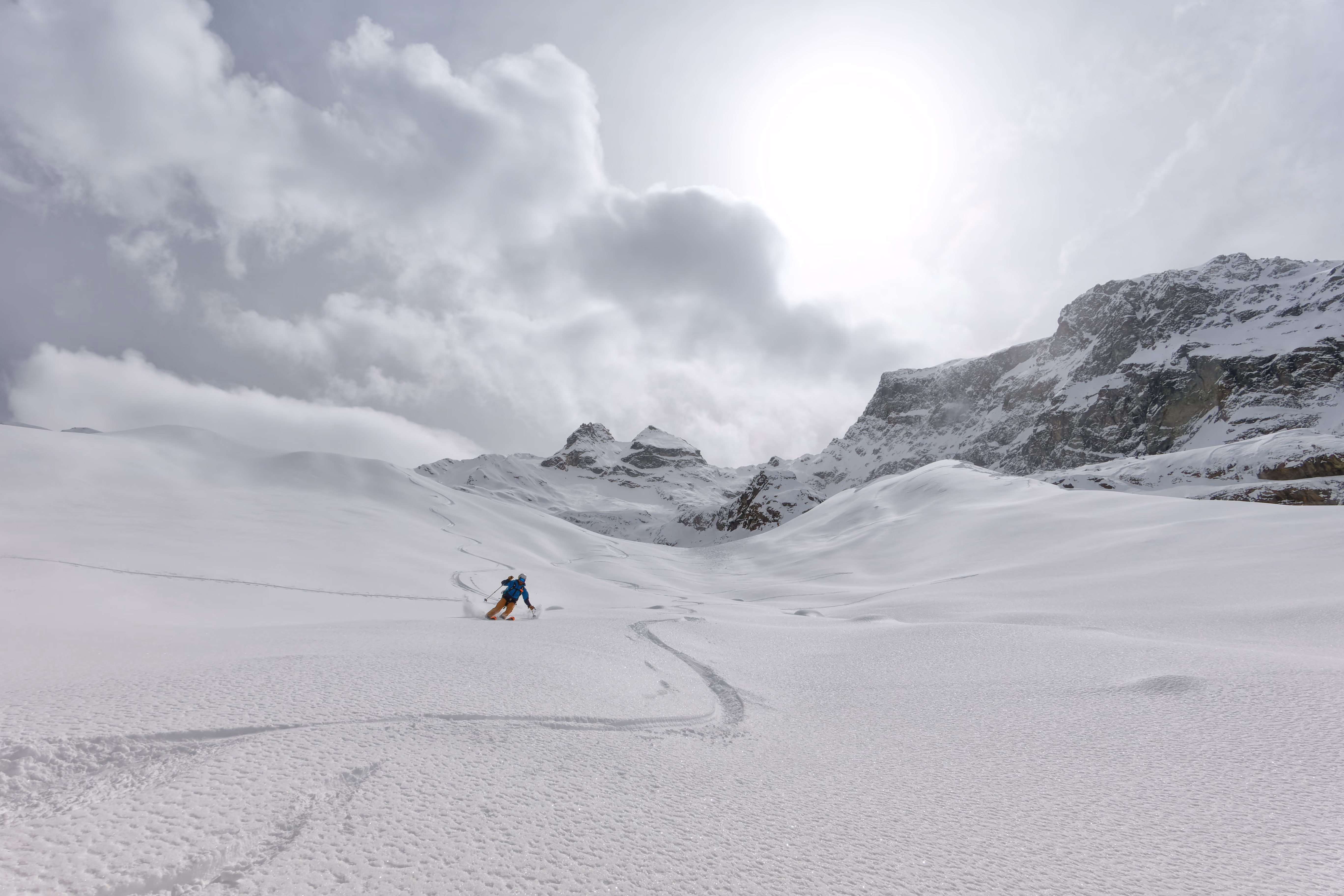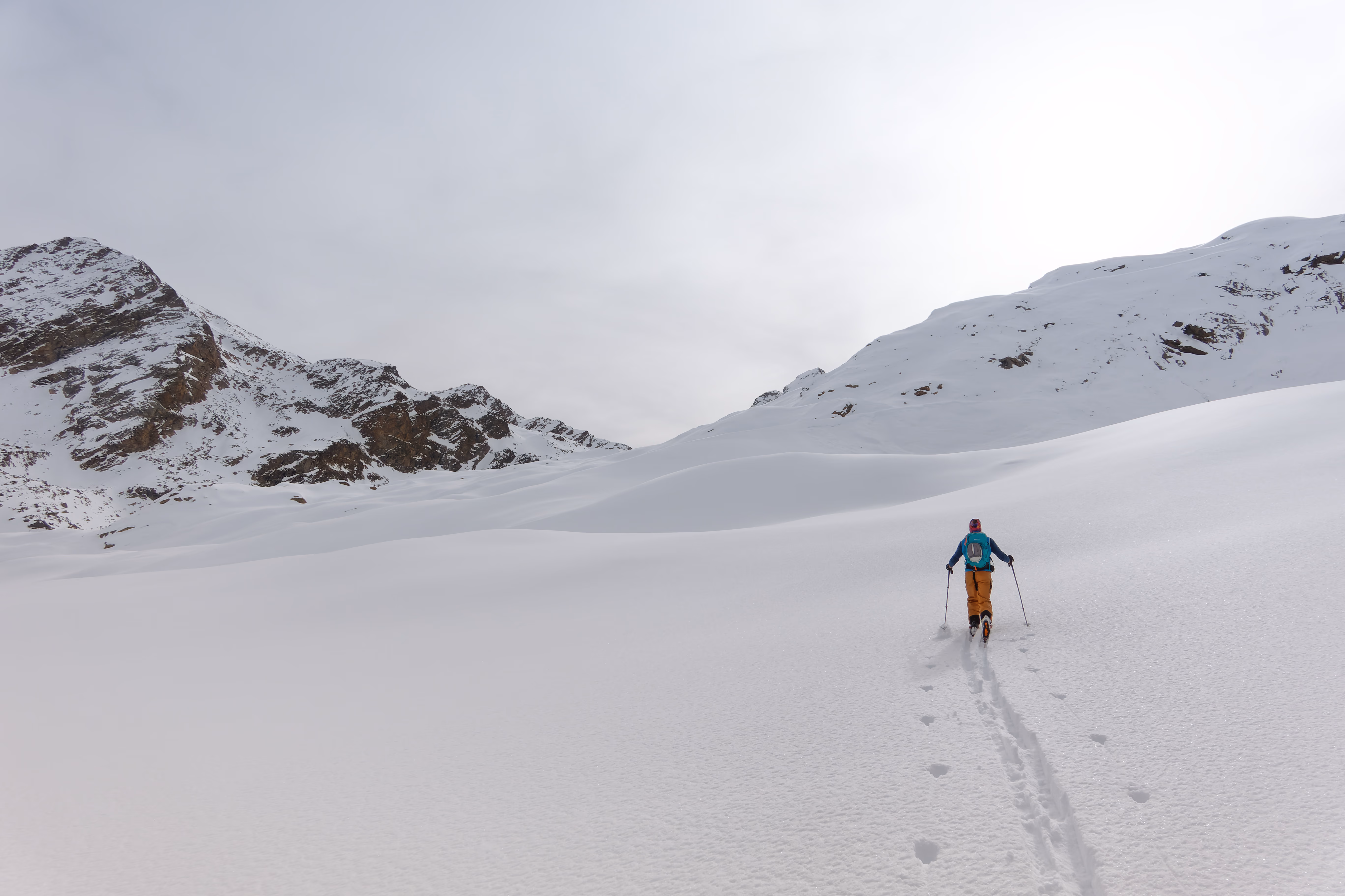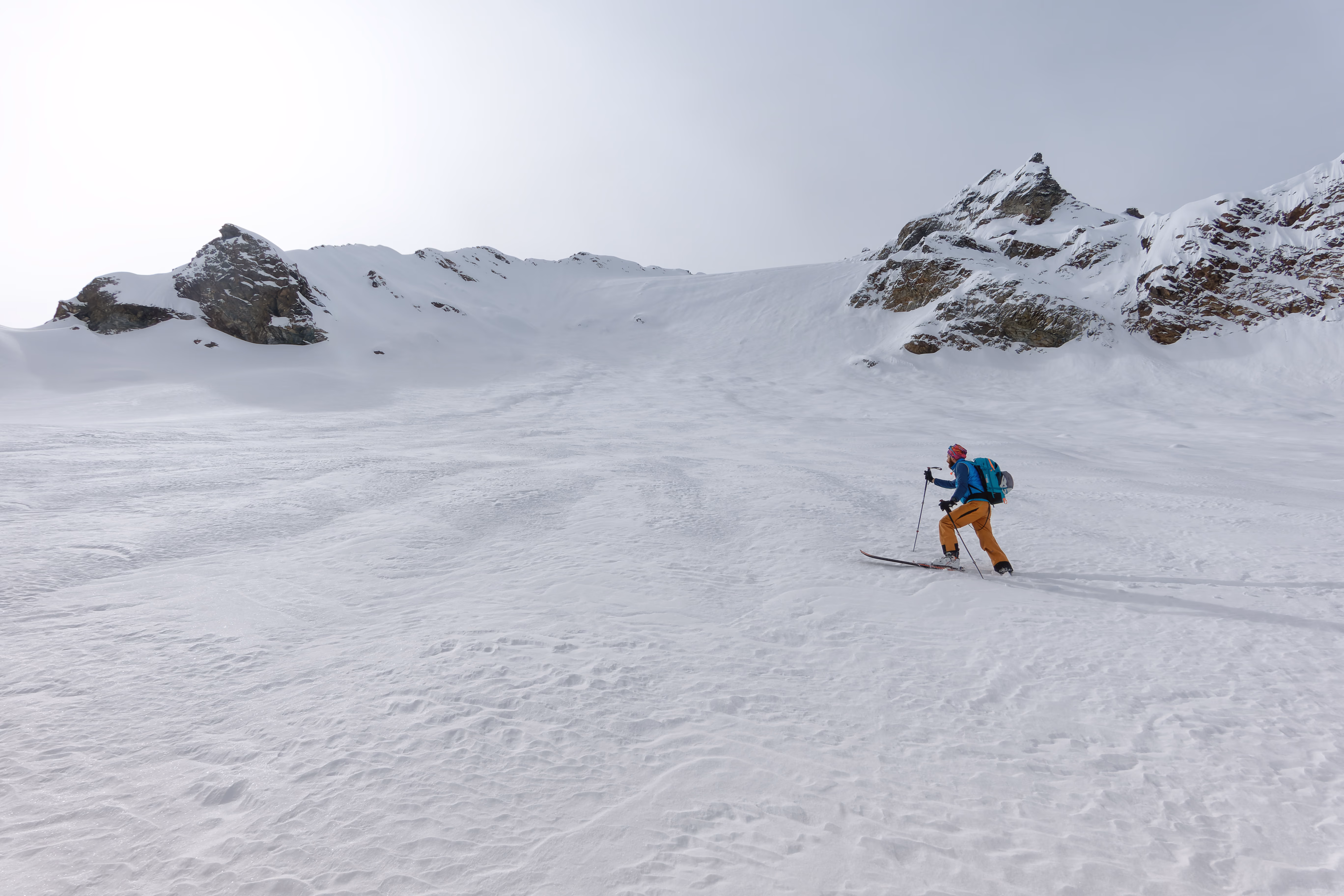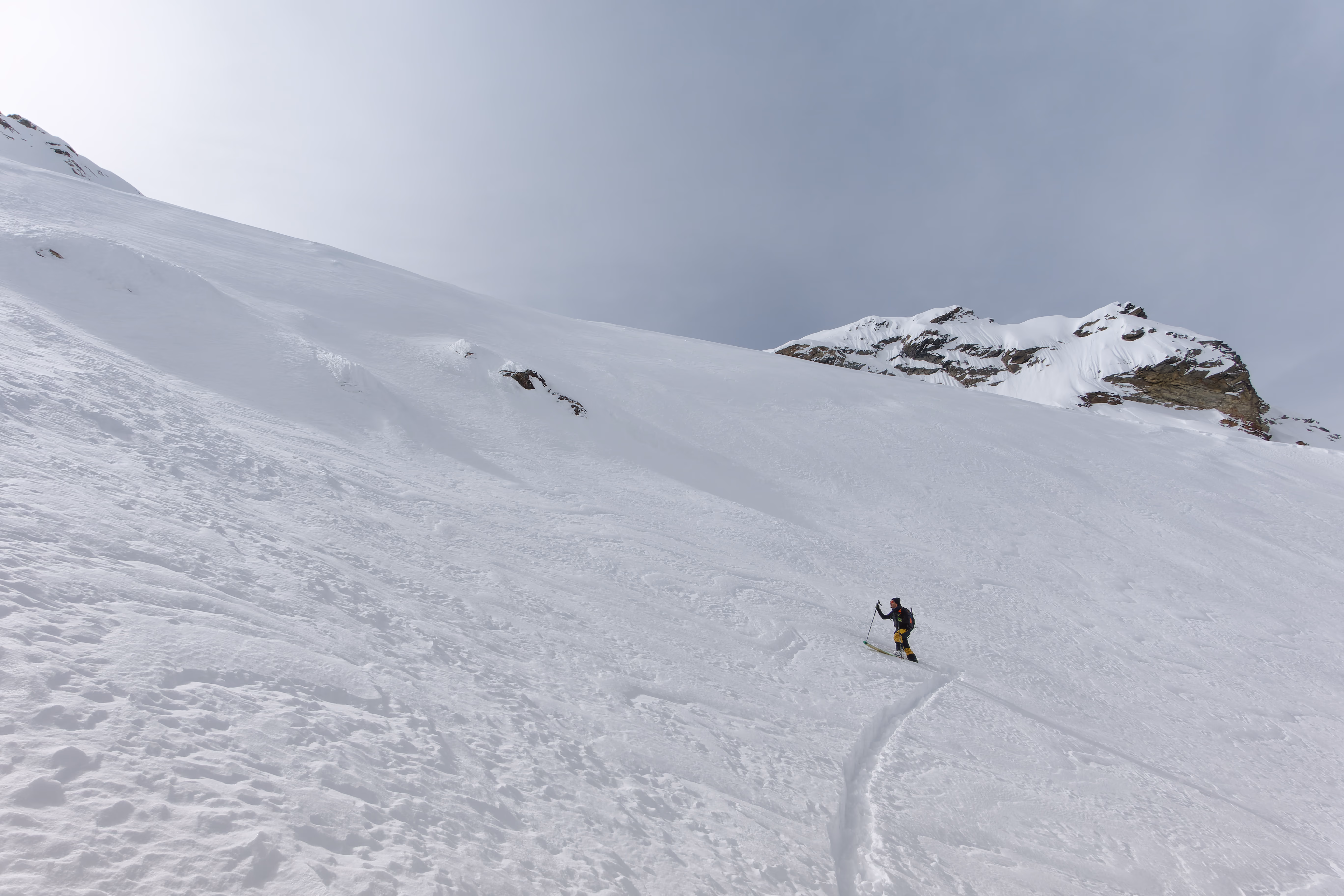 Risaliamo il bellissimo pendio con numerose inversioni, alternandoci nel tracciare. La pendenza aumenta e la neve fresca è abbondante.Scaviamo una buca per verificare la presenza di strati deboli, ma non rileviamo particolari problemi. Raggiungiamo la base del canalino finale, dove le pendenze si fanno ancora più ripide e la neve diventa più ventata. Gli ultimi 100 metri sarebbero un azzardo, e preferiamo non rischiare. Per oggi può bastare.