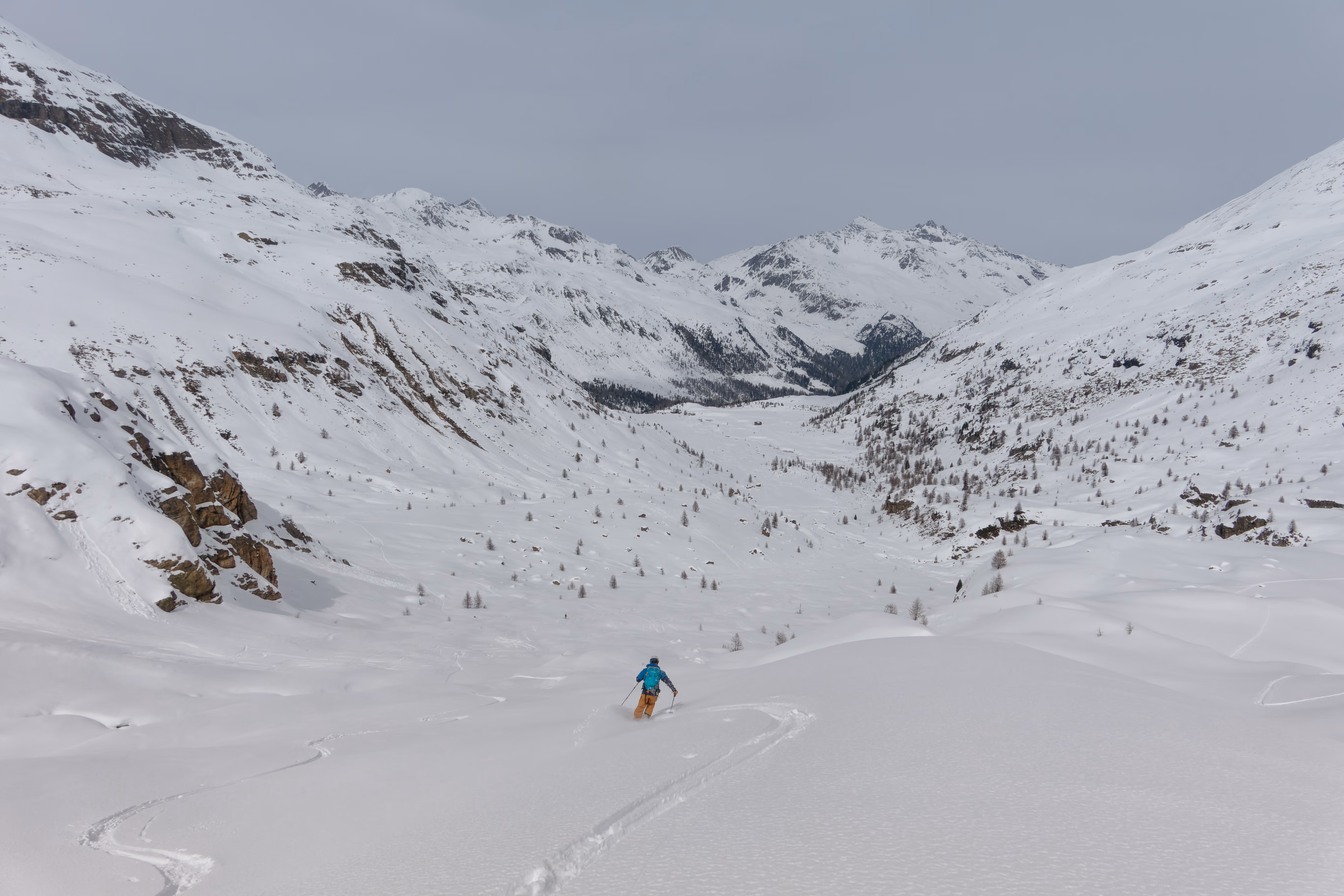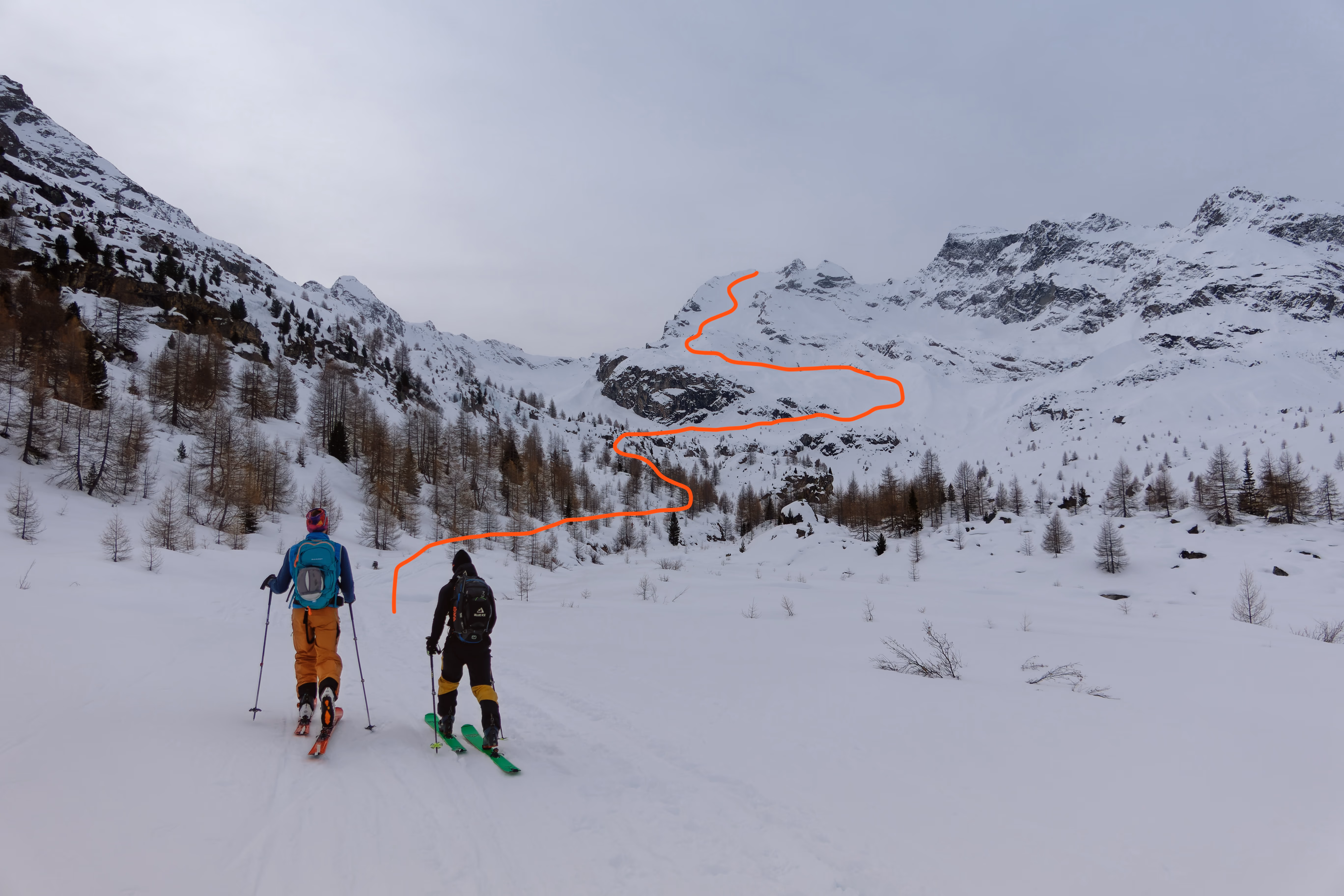 Per raggiungere il Rifugio Federico, è meglio seguire la variante bassa all’andata. In totale sono circa sei chilometri e mezzo. Al rifugio ci concediamo una pausa tè e una chiacchierata con i cordiali gestori, che ci informano che la Cima di Lago Spalmo è ancora tutta da tracciare. Questo ci motiva: vogliamo provarci. Seguiamo inizialmente l’itinerario per la Punta d’Avedo, la meta di tutti gli altri ospiti del rifugio. Poco dopo, deviamo a destra, alla base della fascia rocciosa dei pendii superiori. Risaliamo un breve canale, poi ci spostiamo di nuovo verso sinistra.