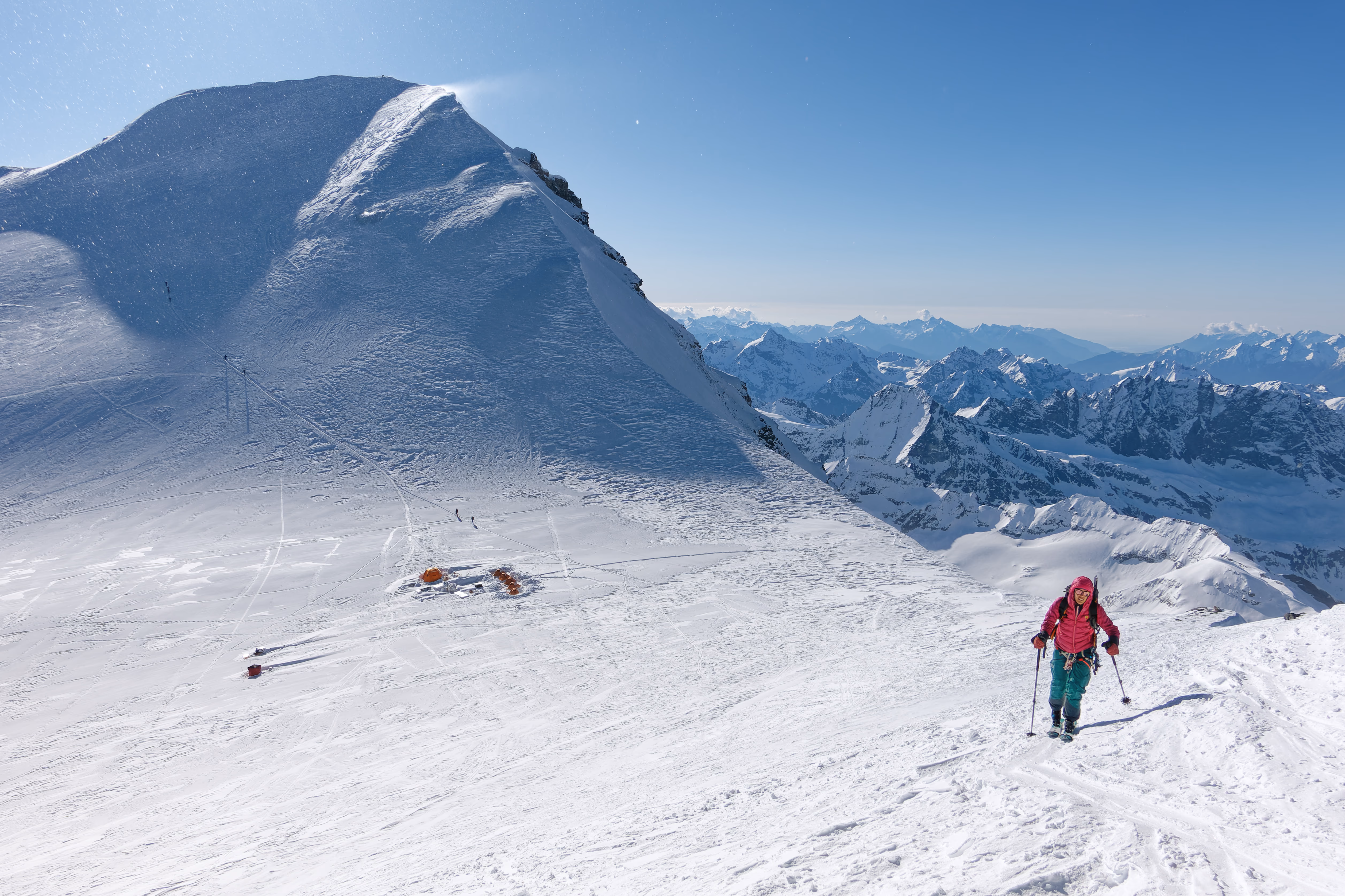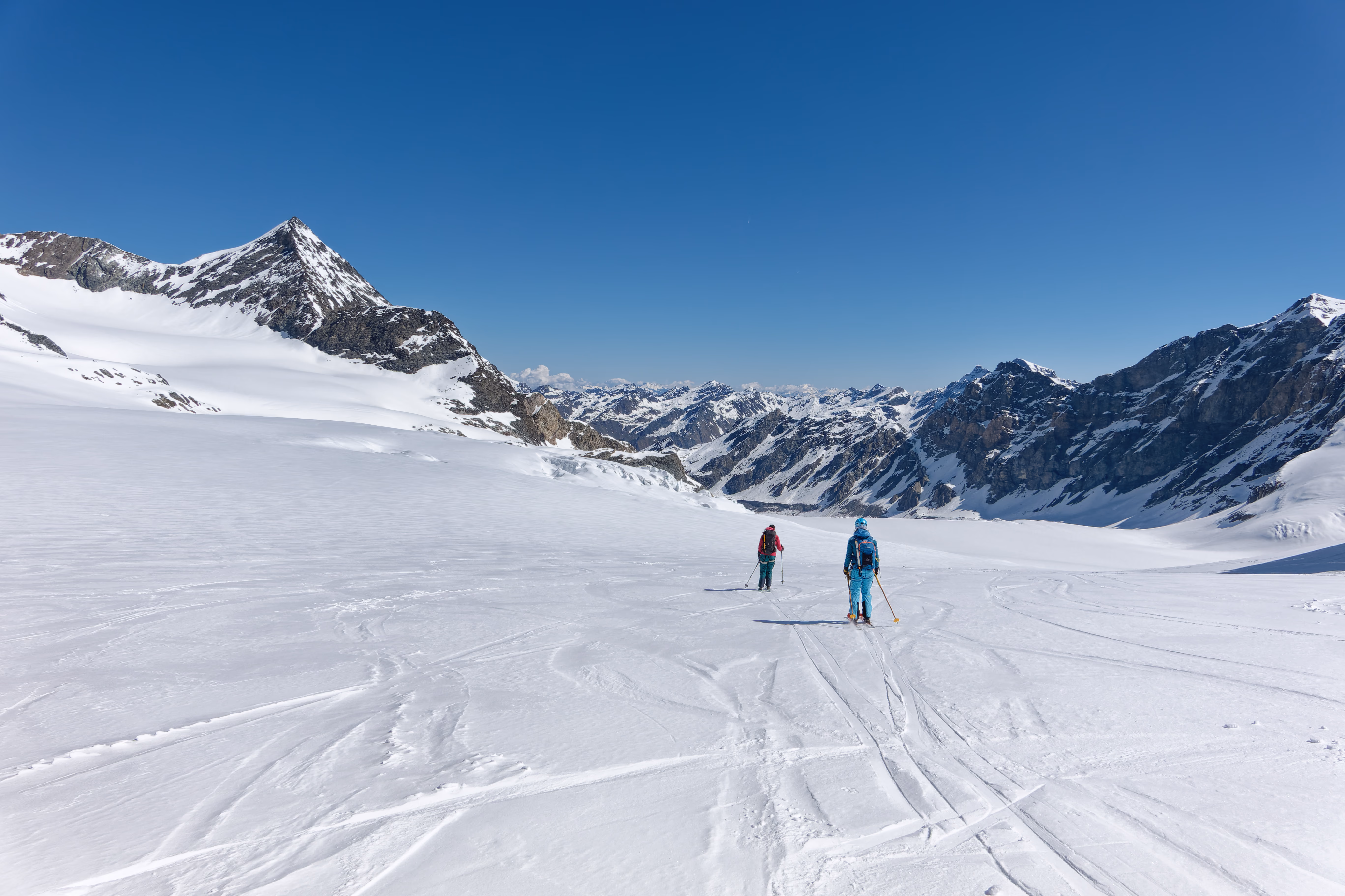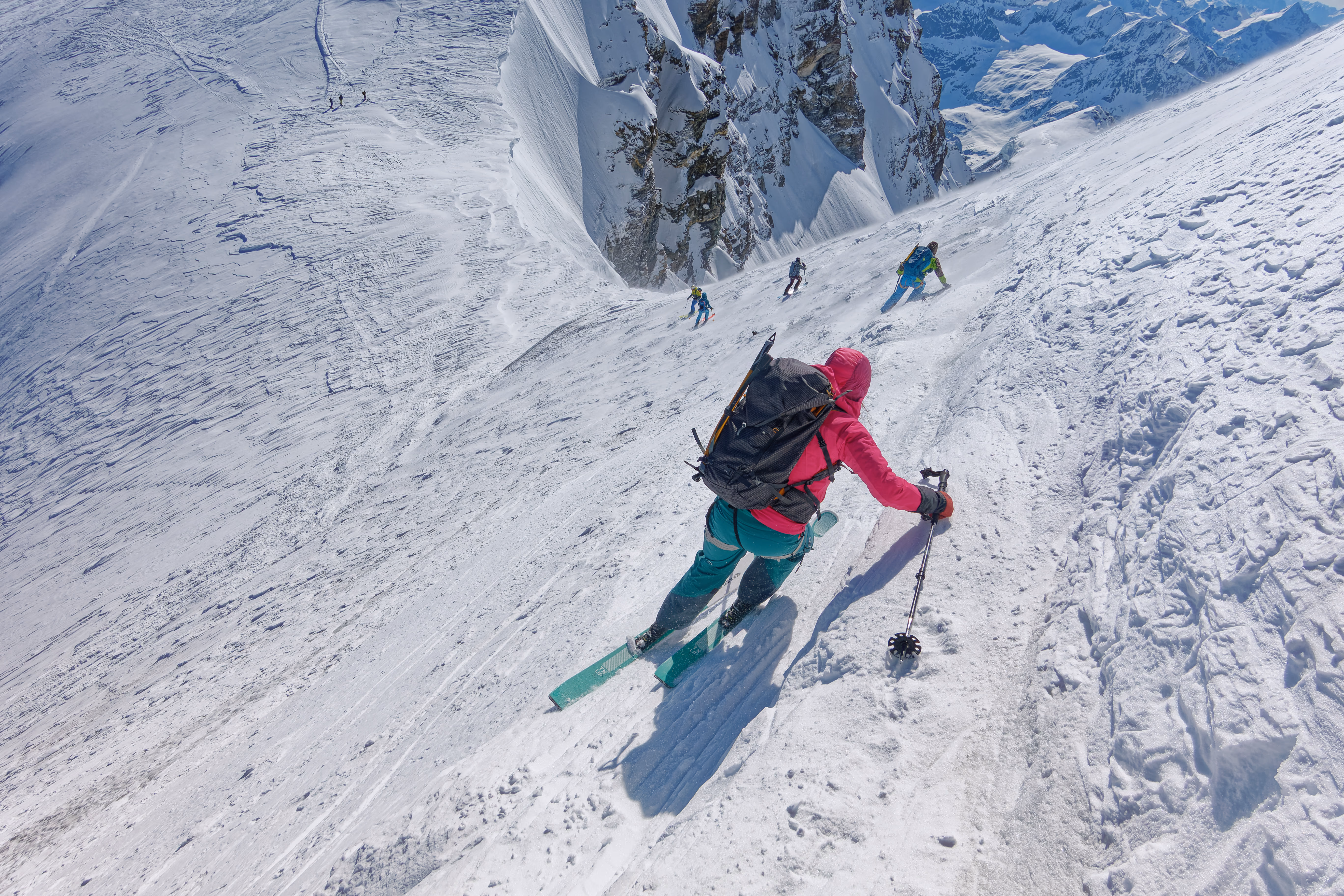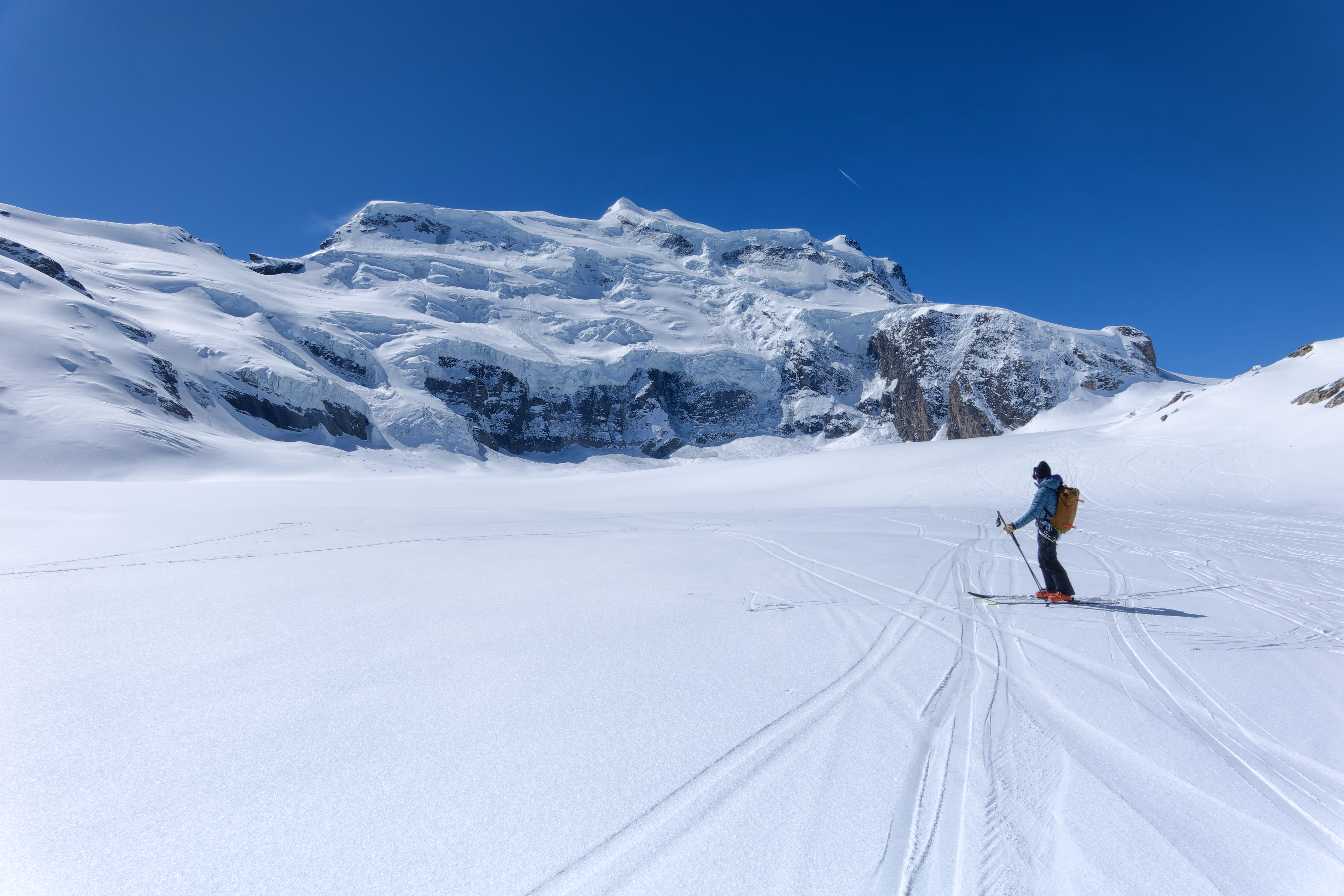 La discesa dal Corridor è impegnativa. Si scia spesso su blocchi di ghiaccio e, allo stesso tempo, bisogna essere veloci per ridurre al minimo il tempo passato sotto il tiro dei seracchi. Hai proprio la sensazione di essere in balia della natura. Più in basso possiamo finalmente allentare la tensione e goderci una discreta sciata sul pendio finale, che ci riporta sul Ghiacciaio di Corbassière. Qui stappiamo una bottiglia per festeggiare il compleanno di Marco, che cade proprio oggi. Ci lasciamo scivolare fino alla base della capanna, per poi risalire gli ultimi 50 metri sotto il sole, nel fango: la classica mazzata finale. Riusciamo a sciare discretamente fino alla base della morena. Poi, il resto è un lungo rientro a piedi. Una due giorni perfetta per una montagna spettacolare, non potevo chiedere di più.
