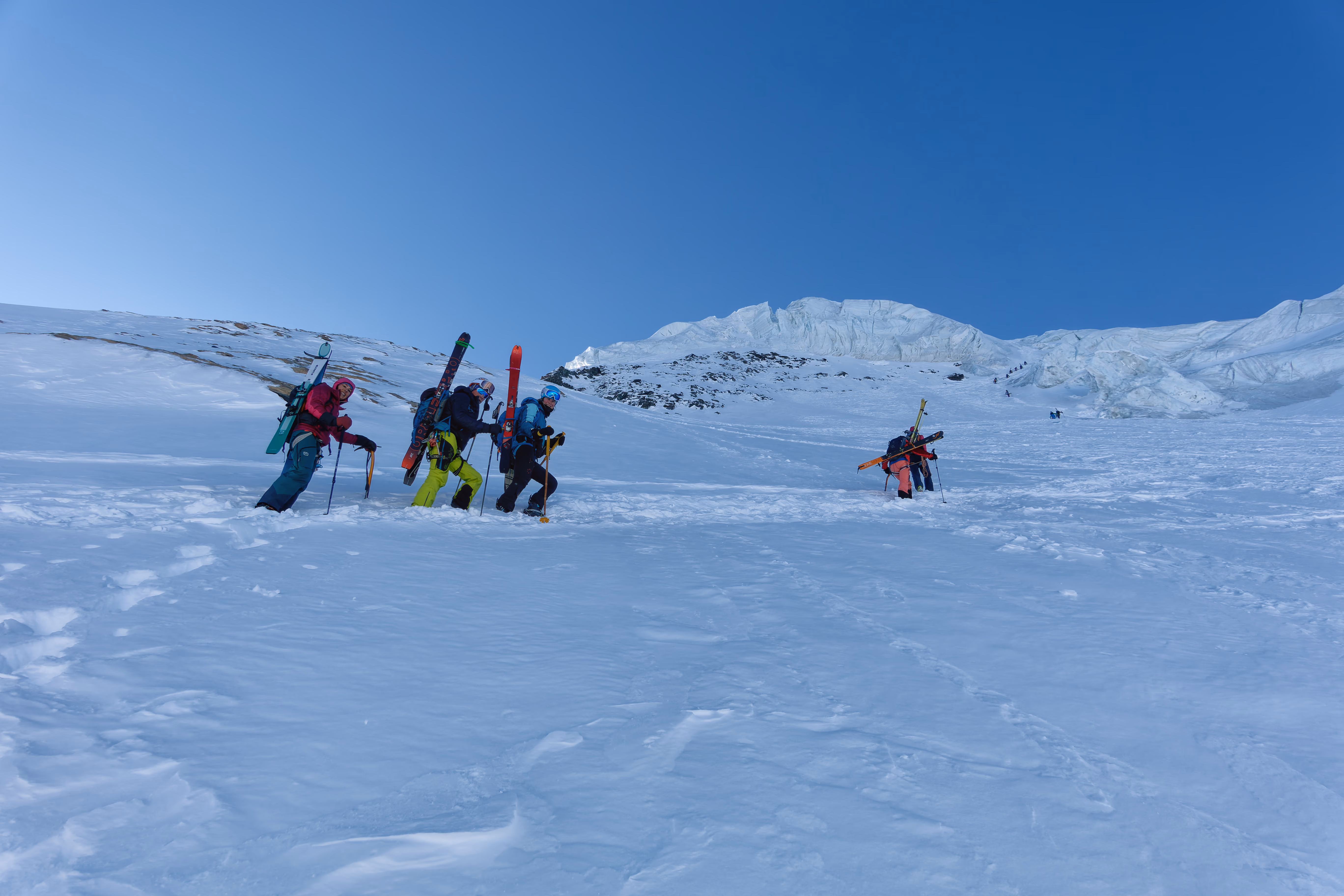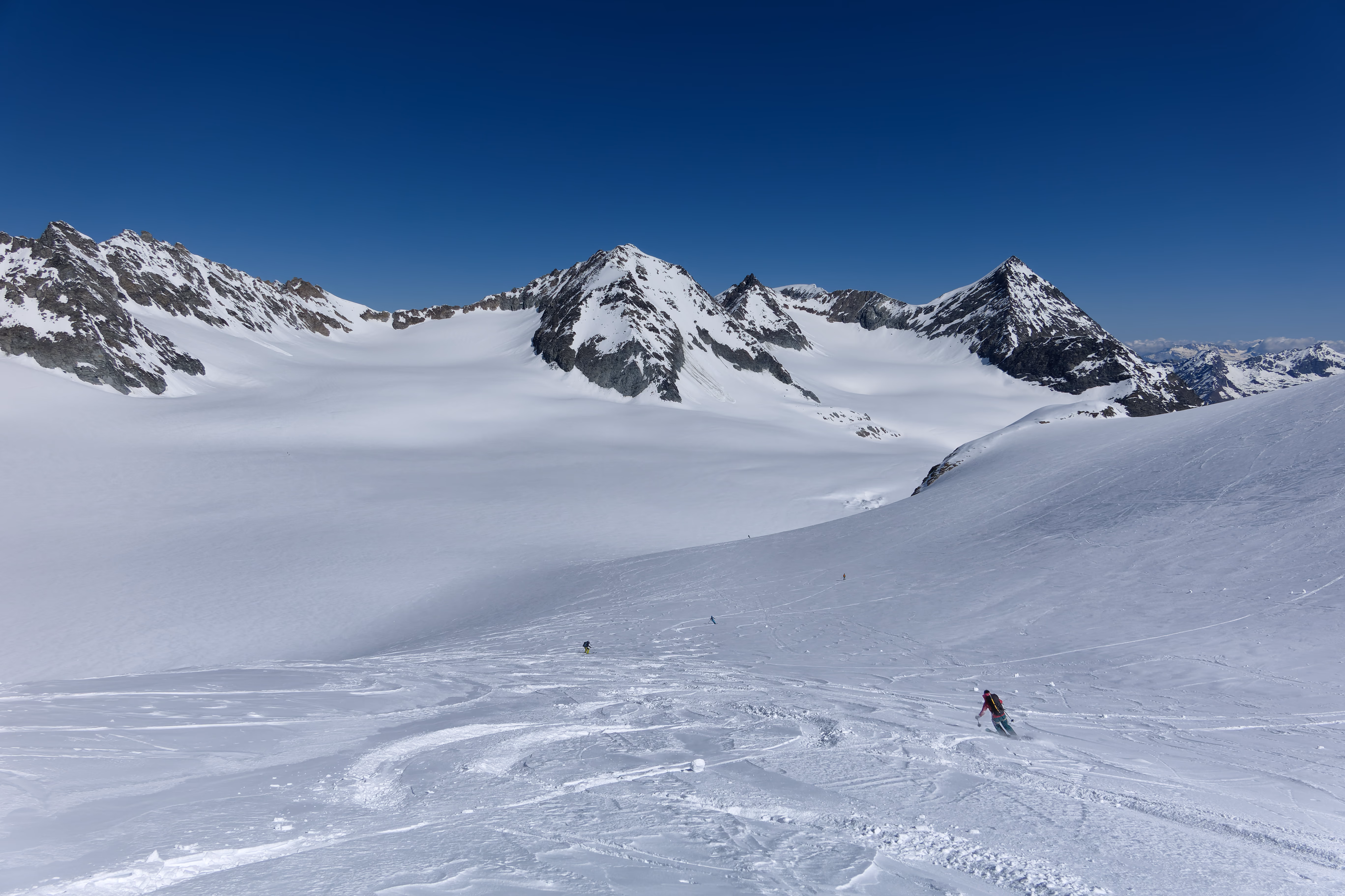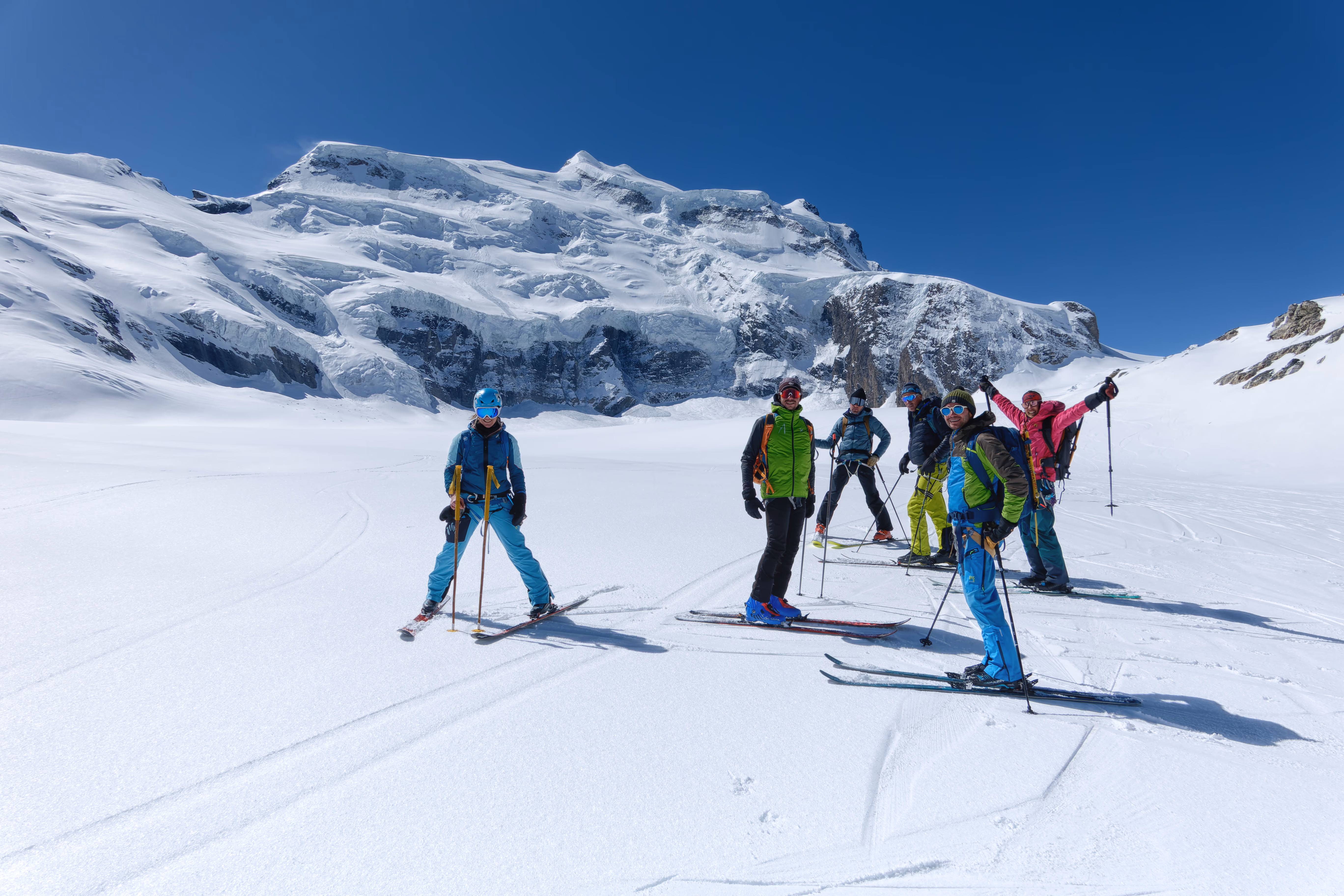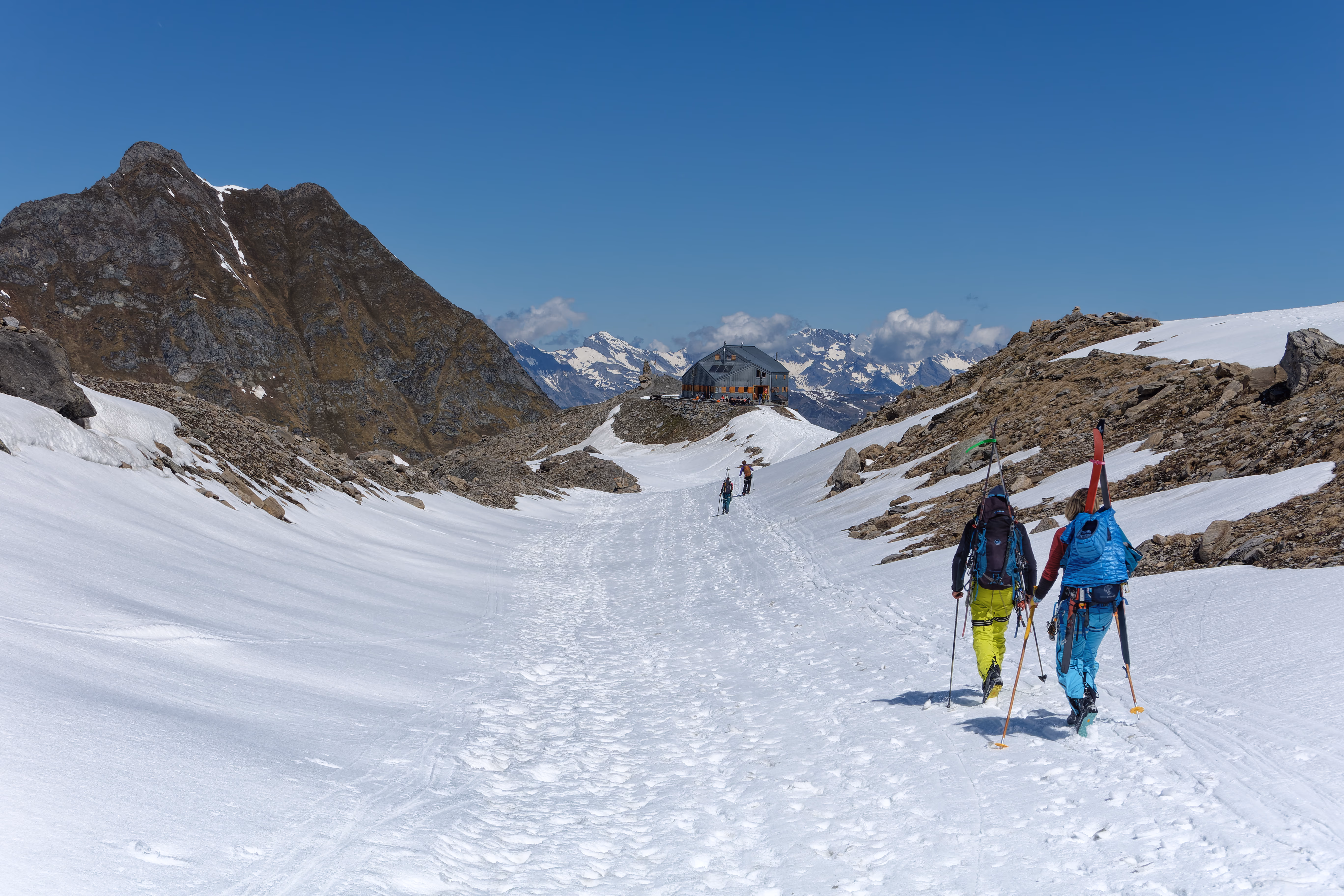 La discesa dal Corridor è impegnativa. Si scia spesso su blocchi di ghiaccio e, allo stesso tempo, bisogna essere veloci per ridurre al minimo il tempo passato sotto il tiro dei seracchi. Hai proprio la sensazione di essere in balia della natura. Più in basso possiamo finalmente allentare la tensione e goderci una discreta sciata sul pendio finale, che ci riporta sul Ghiacciaio di Corbassière. Qui stappiamo una bottiglia per festeggiare il compleanno di Marco, che cade proprio oggi. Ci lasciamo scivolare fino alla base della capanna, per poi risalire gli ultimi 50 metri sotto il sole, nel fango: la classica mazzata finale. Riusciamo a sciare discretamente fino alla base della morena. Poi, il resto è un lungo rientro a piedi. Una due giorni perfetta per una montagna spettacolare, non potevo chiedere di più.