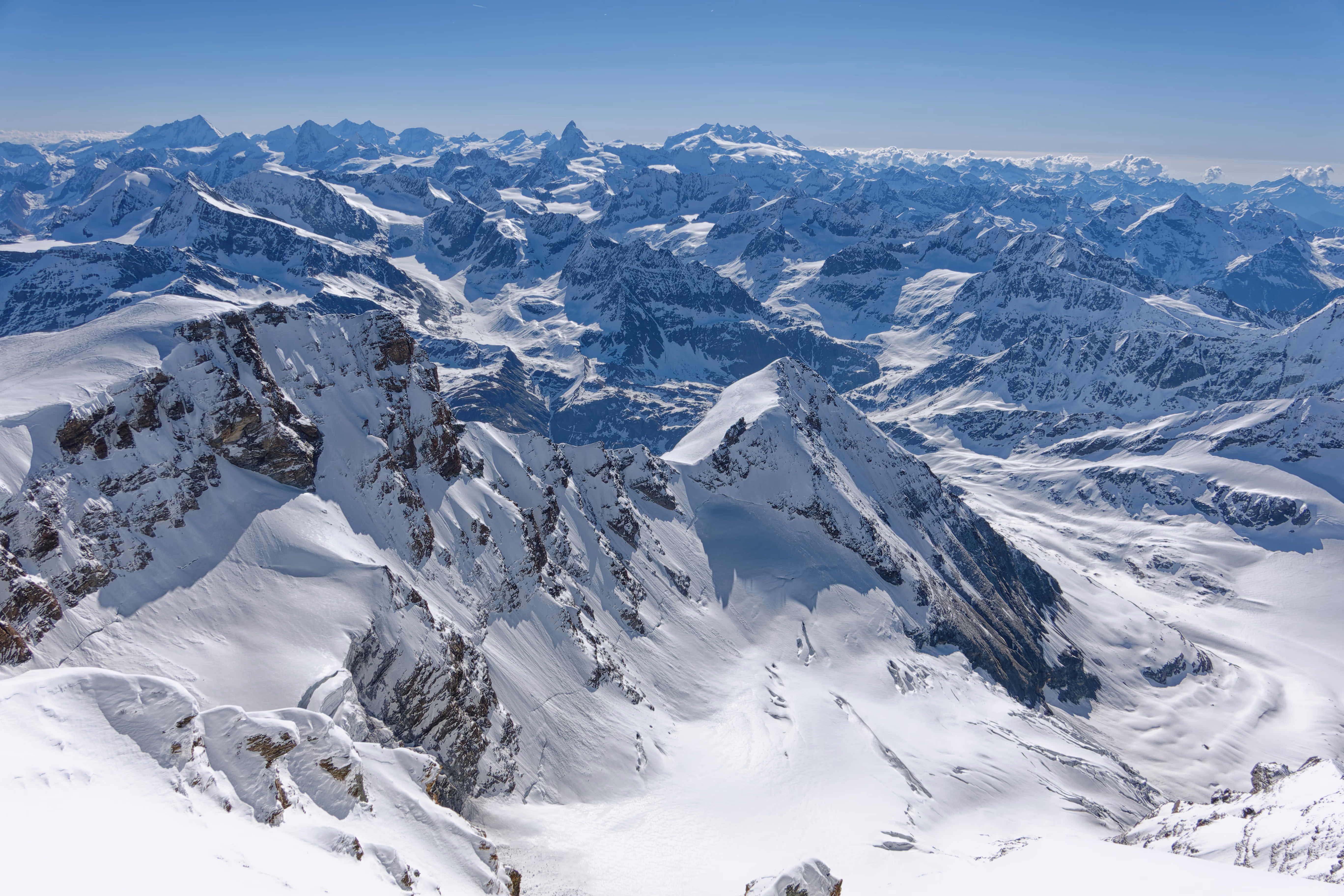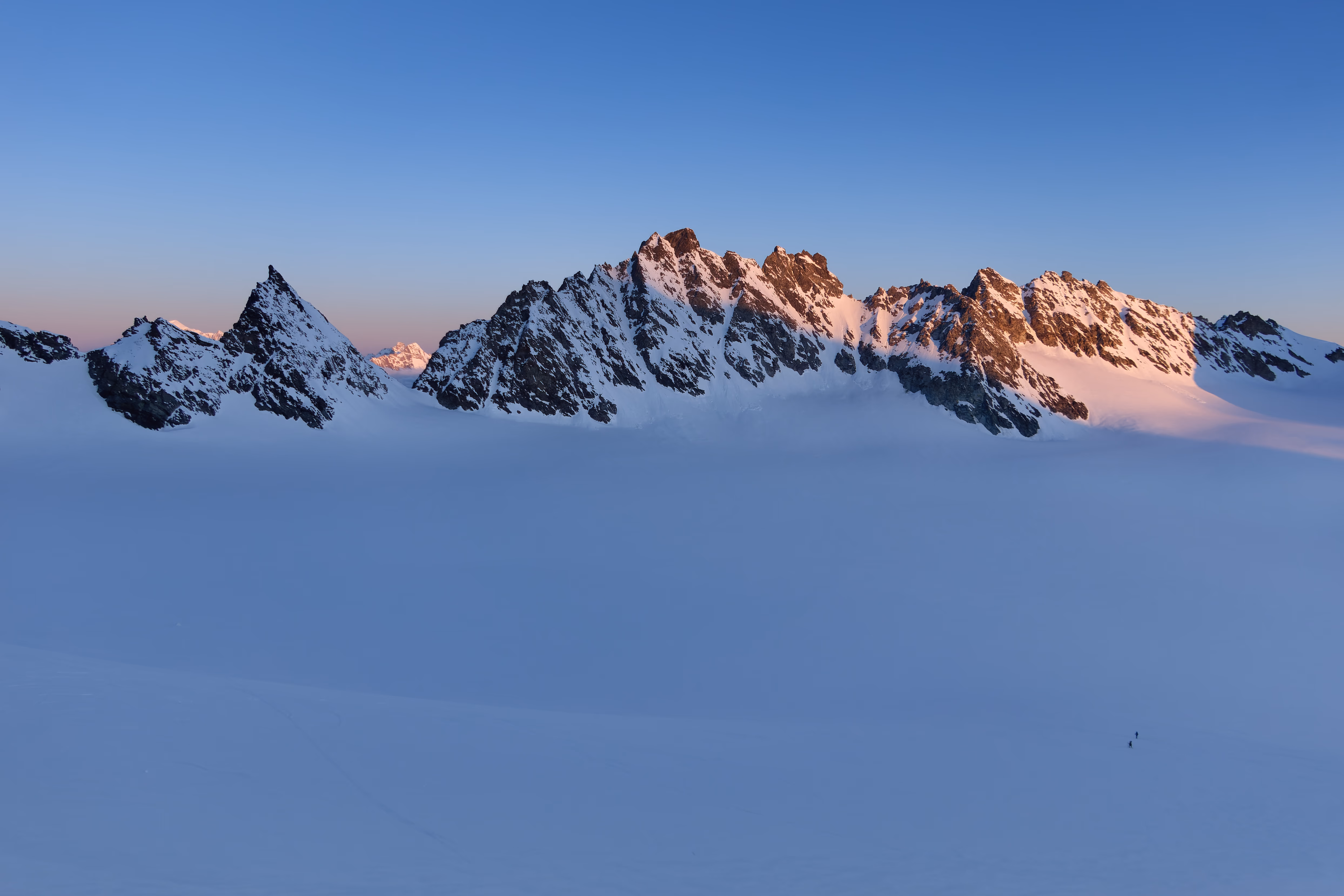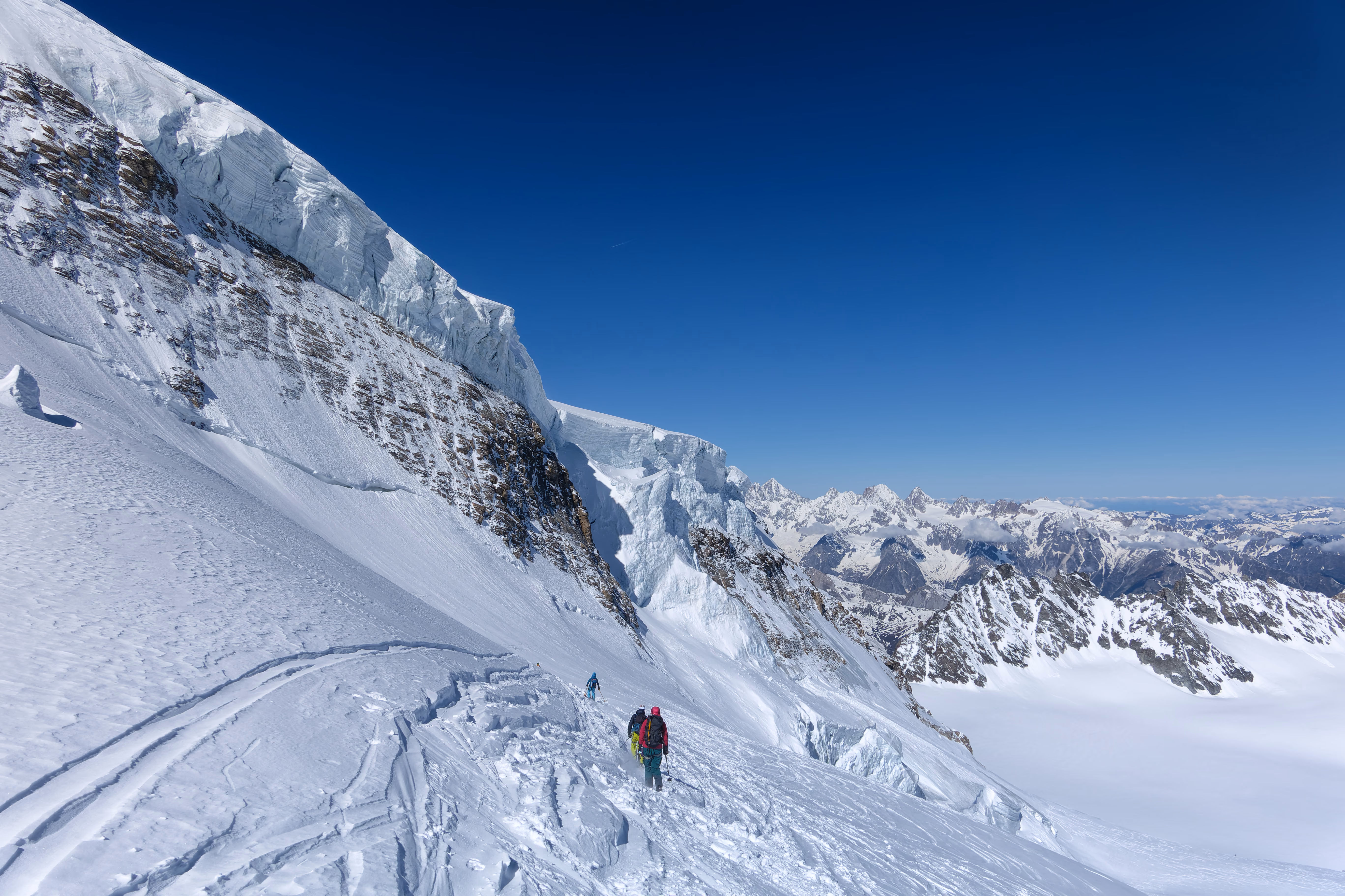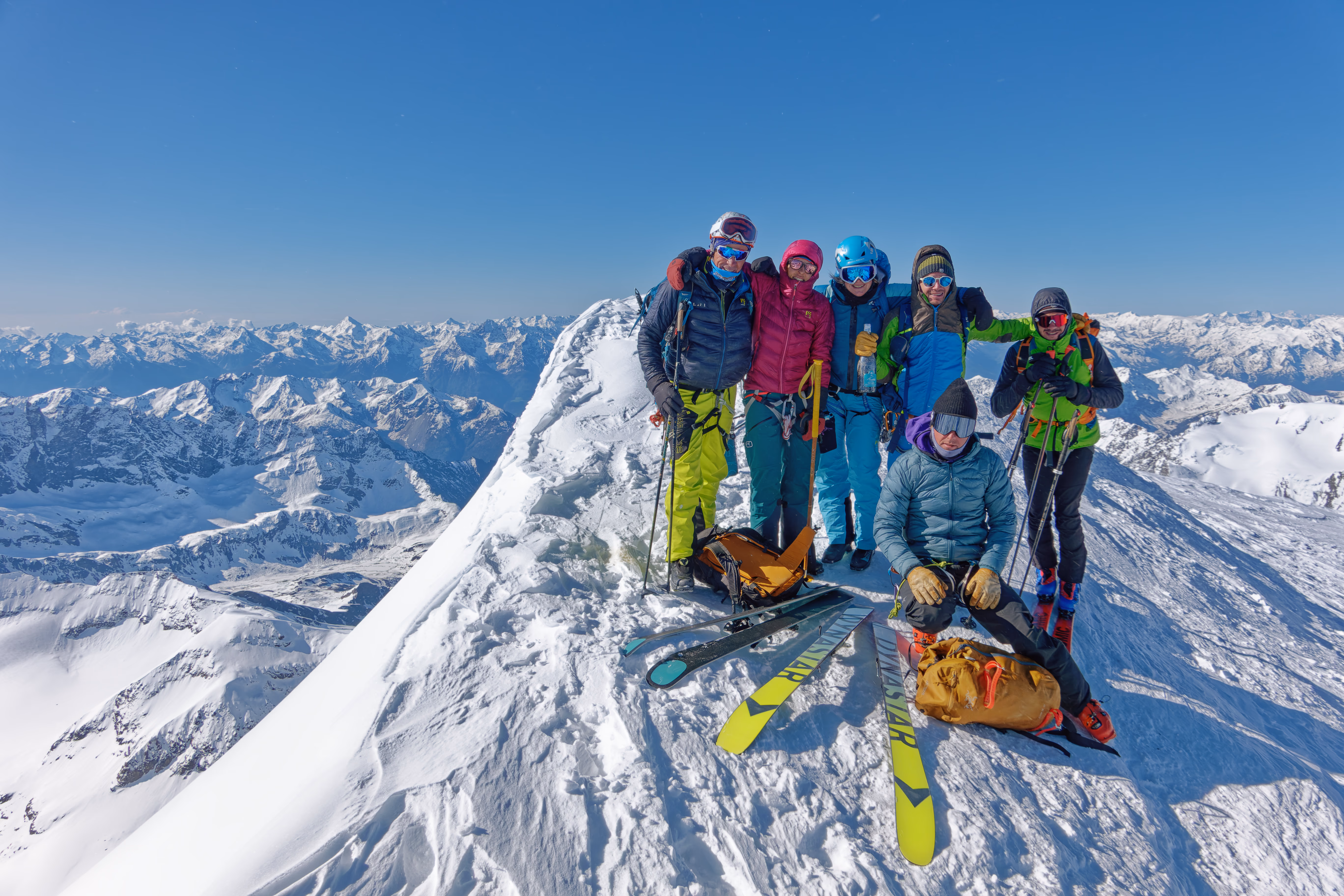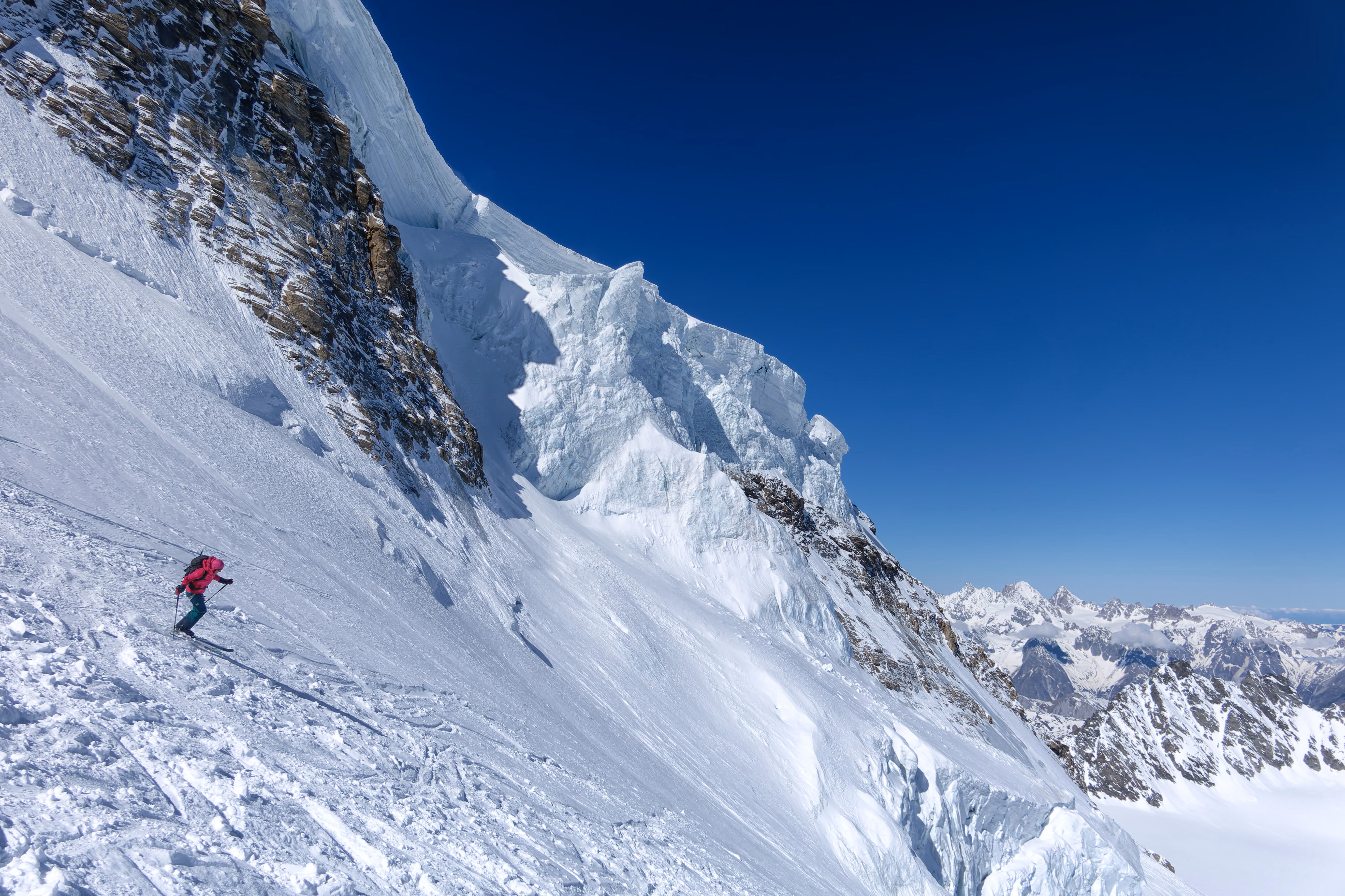 Raggiungiamo il plateau sommitale e calziamo di nuovo gli sci per salire la prima vetta di giornata, il Combin de Valsorey. Arriviamo in cima sci ai piedi. Senza togliere le pelli scendiamo al colle e iniziamo subito la salita al Combin de Grafeneire. Anche qui raggiungiamo la vetta sci ai piedi, senza problemi. Il panorama è immenso: dal Monte Rosa al Monte Bianco, con la città di Aosta ben visibile sotto di noi. Calziamo gli sci e iniziamo la discesa. Il traverso sotto l’Aiguille du Croissant — non è un 4000 ufficiale — si rivela abbastanza agevole, fino all’attacco del Mur de la Côte.