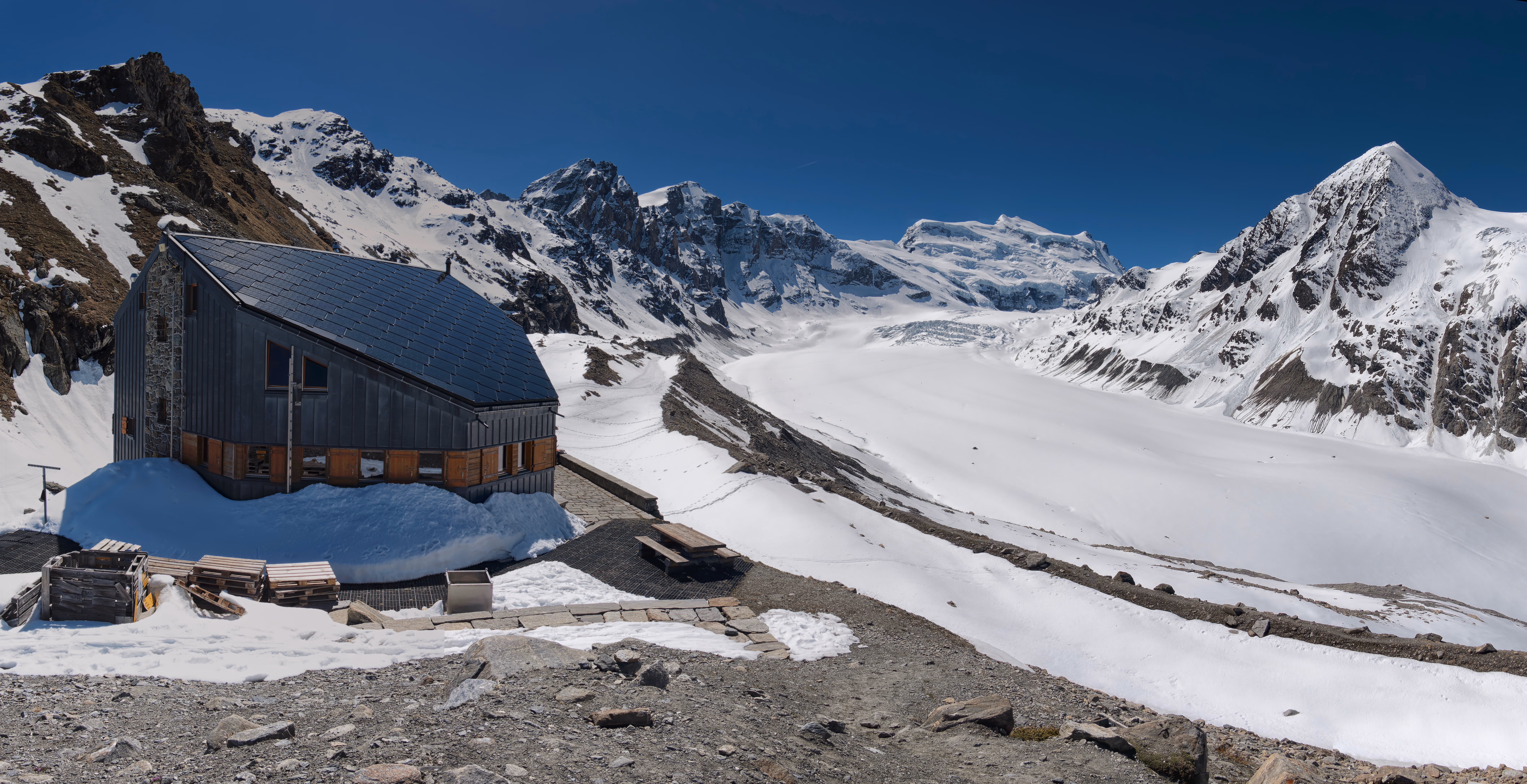 Il primo tratto è davvero ripido, quasi una vertical. Impensabile affrontarlo con gli sci, anche con un buon innevamento. Al termine di questo primo strappo troviamo finalmente un po’ di neve, ma è ancora discontinua. Proseguiamo con gli scarponi da sci, lasciando le scarpette appese a un albero per il rientro. Dopodiché inizia un lungo traverso per raggiungere la morena. Anche qui, procedere con le pelli sarebbe stato difficile. In generale, questa salita è molto più comoda da affrontare quando la neve parte già dalla morena: si è più veloci che a piedi e si risparmia un bel po’ di fatica. Calziamo gli sci alla base della morena e iniziamo a salire verso la Cabane de Panossière. La neve è già un po’ molle, ma procediamo bene. Il rifugio si trova in una posizione panoramica davvero spettacolare, con vista diretta sul Grand Combin e sul Ghiacciaio di Corbassière. Il rifugio è privato e non accettano contanti: vi consiglio di prelevare dei franchi prima di salire. Le camere sono confortevoli e la cucina discreta. In generale ci siamo trovati bene. Colazione alle 3 e partenza alle 4: la giornata inizia presto!